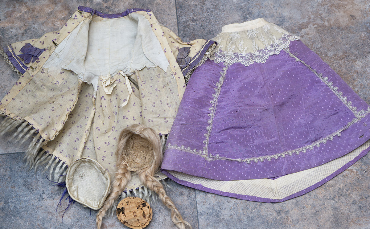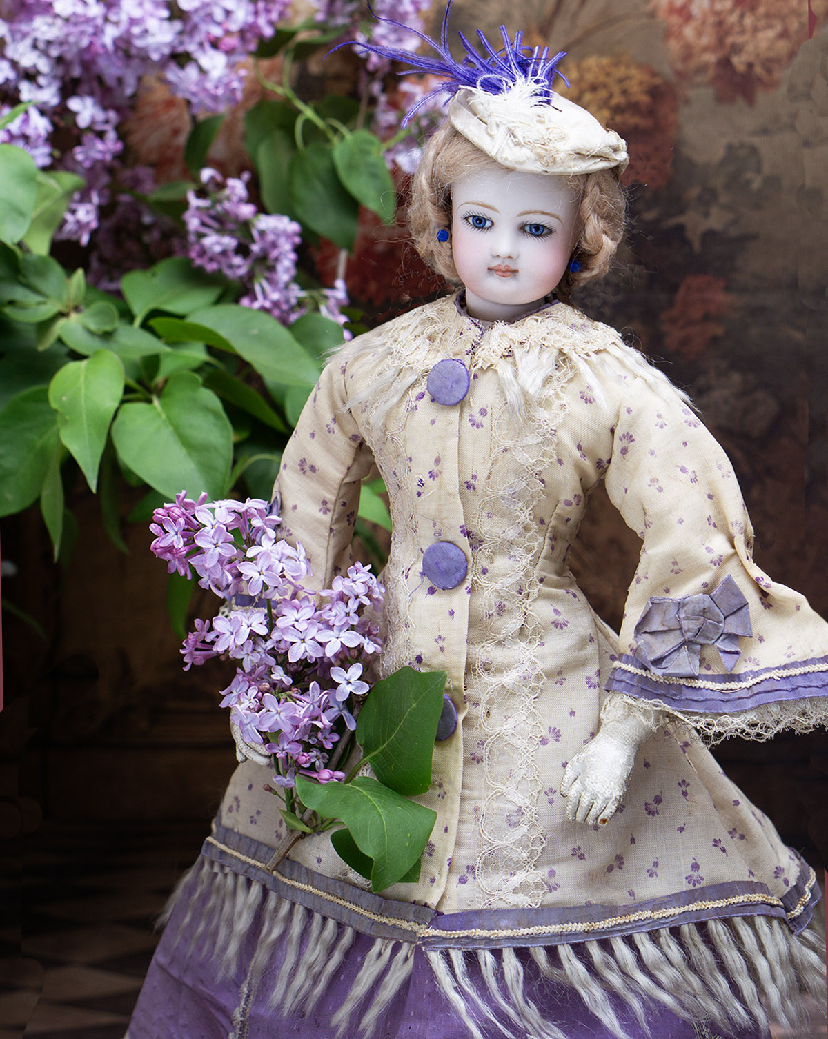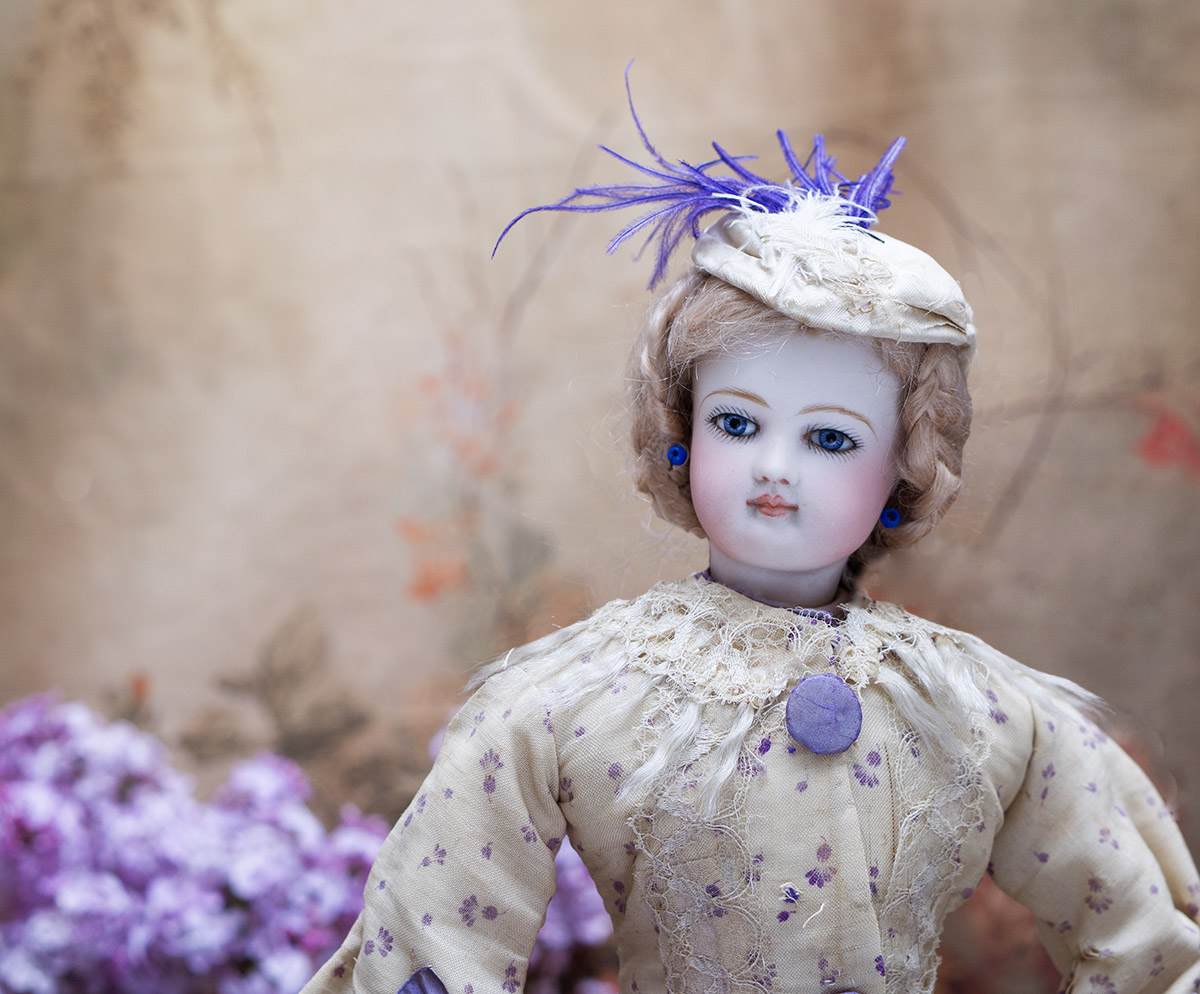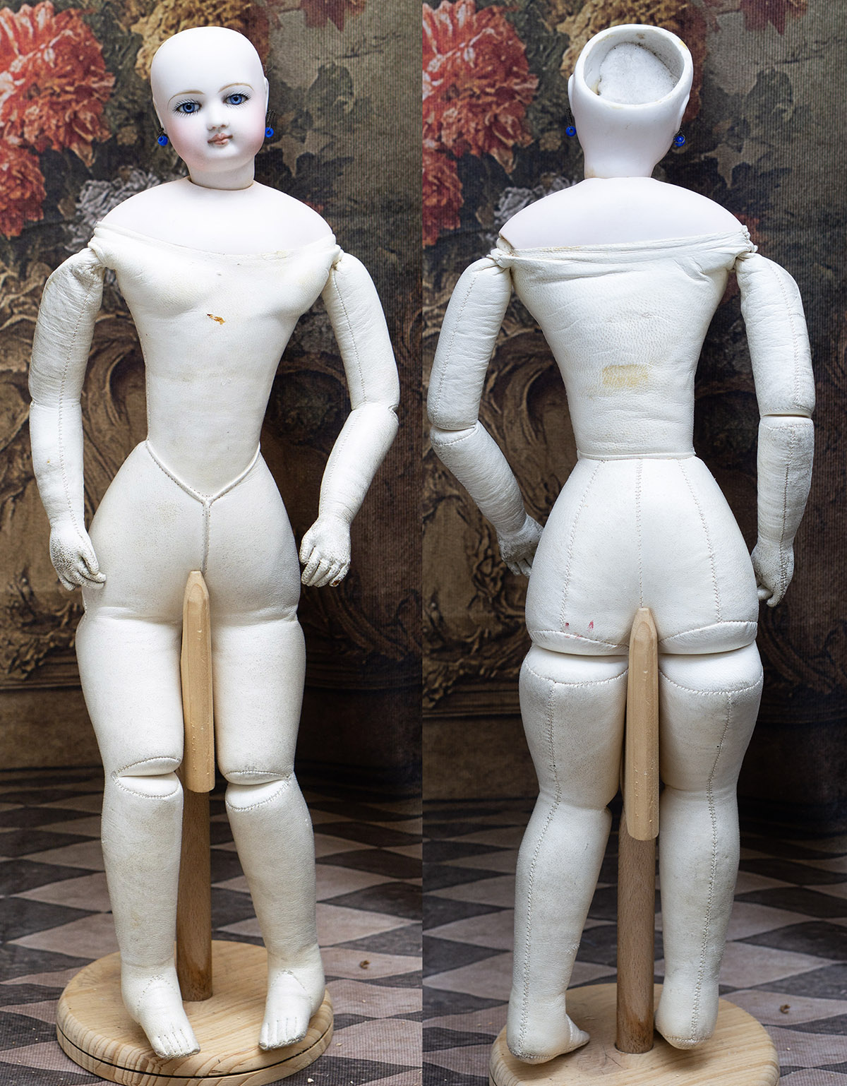 Bisque swivel head on kid-edged bisque shoulderplate, blue glass spiral-threaded eyes with dark iris rims, dark eyeliner, painted lashes, feathered brows, accented nostrils, closed mouth with delicately shaded accented lips, pierced ears, original blonde mohair wig over cork pate, French kid poupee body with gusset-jointing at elbows, hips and knees.