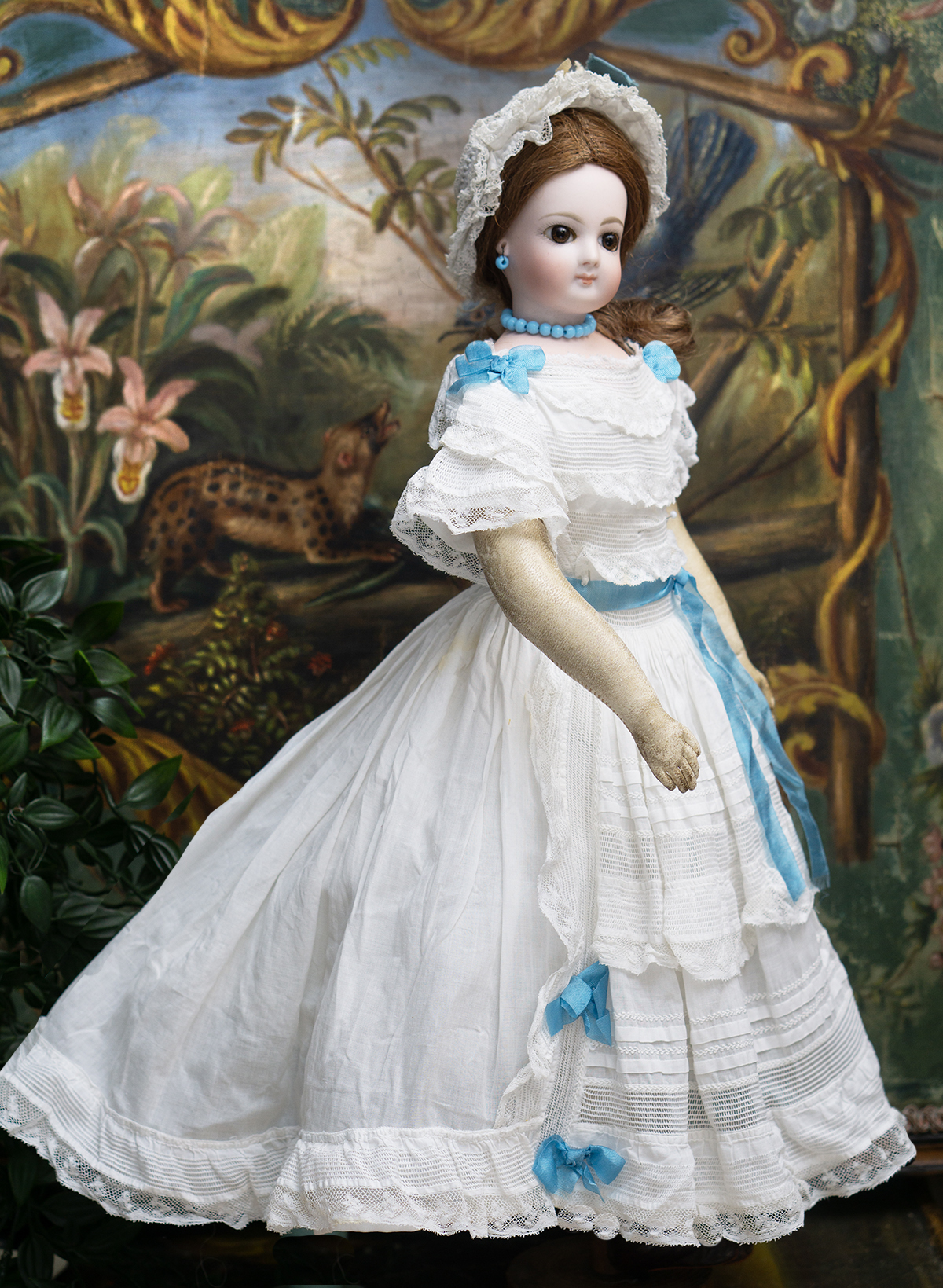 Regal brown-eyed poupee has very lovely bisque and painting, wearing lovely antique gown and bonnet. 19" (48 cm.) tall Condition: generally excellent. Marks: 7 (head and shoulders) Jumeau Medaille d'Or Paris (body). Emile Jumeau, circa 1878. International shipping coist $70.00 ------------------------------------ I DO A LAYAWAY NO STATE SALES TAX! Thanks for your visit to Respectfulbear doll shop!