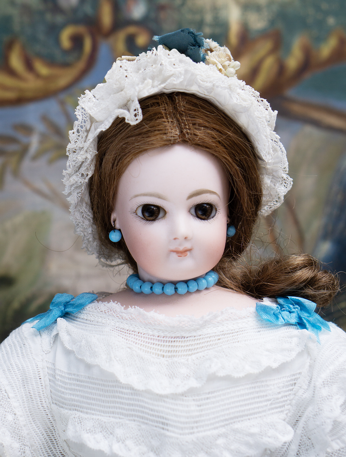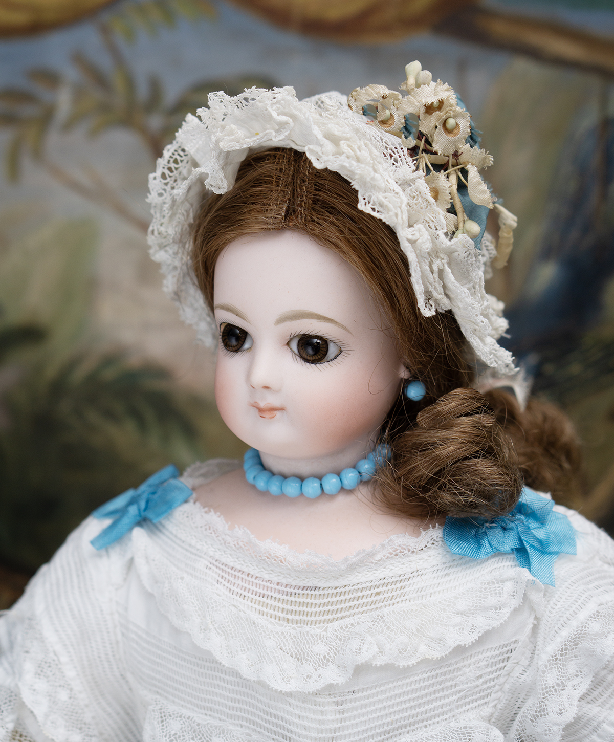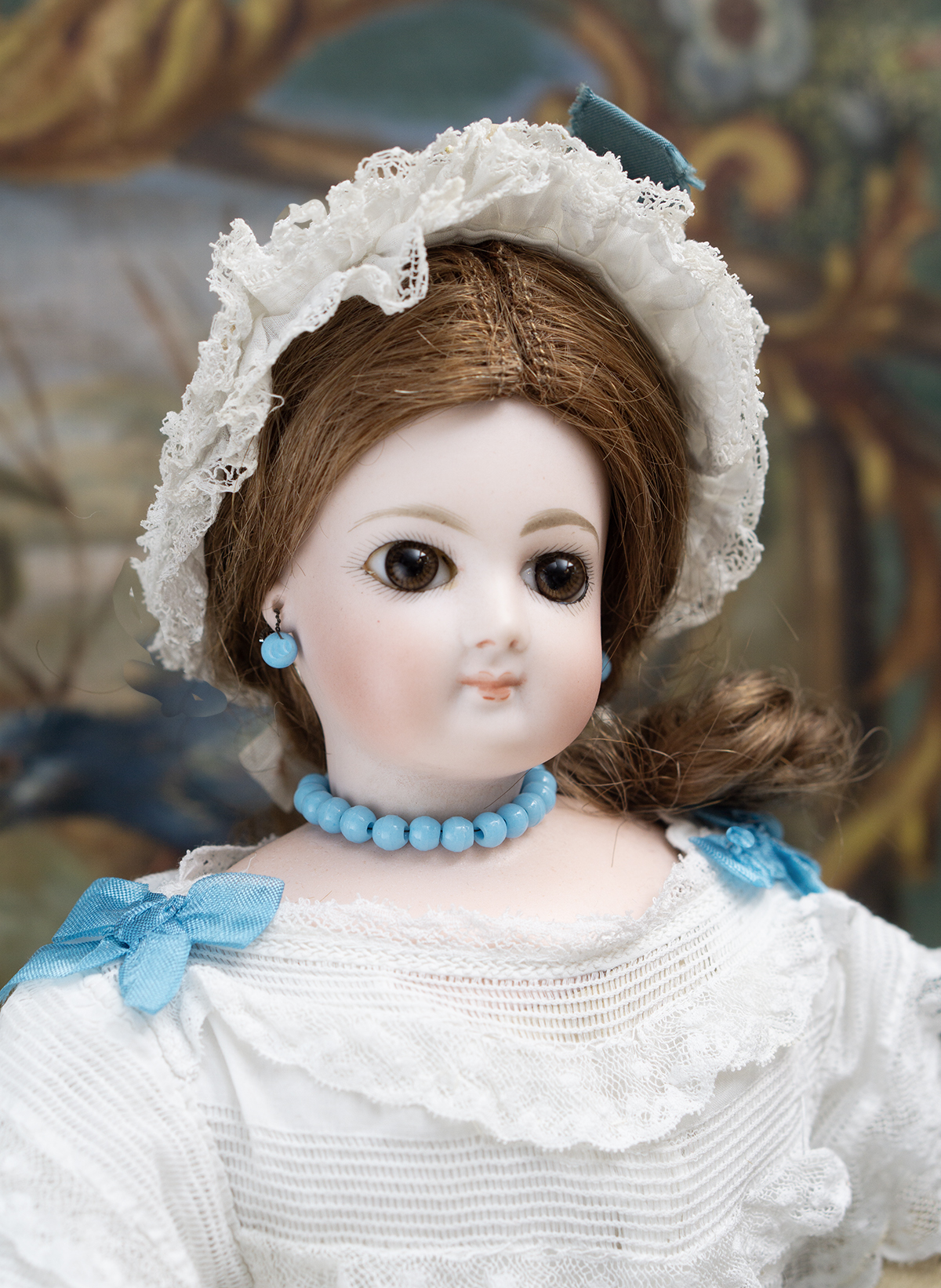 Bisque swivel head on kid-edged bisque shoulderplate, brown glass paperweight inset eyes, dark eyeliner, lushly-painted lashes, brushstroked brows, accented nostrils and eye corners, closed mouth with center accent line, pierced ears, brunette human hair over cork pate, shapely sturdy kid poupee body.