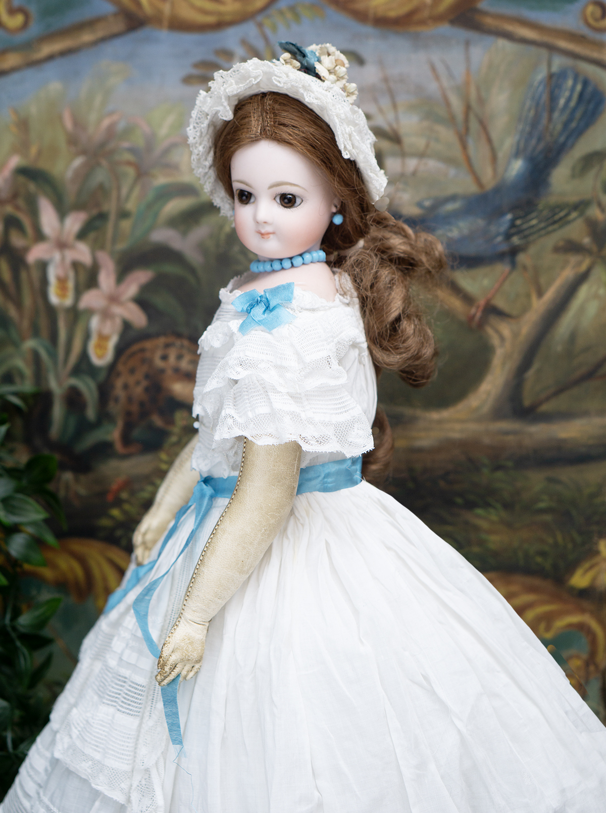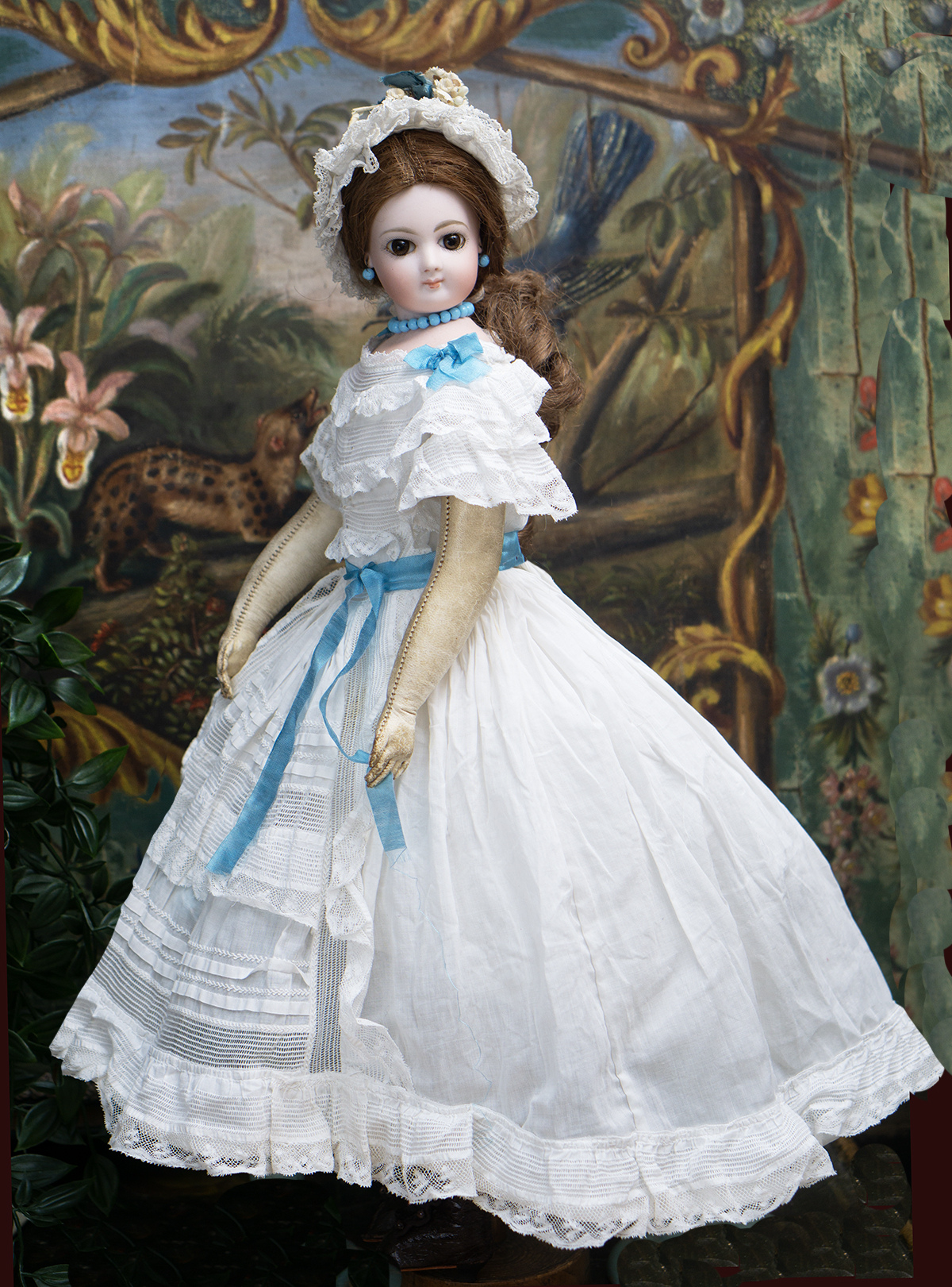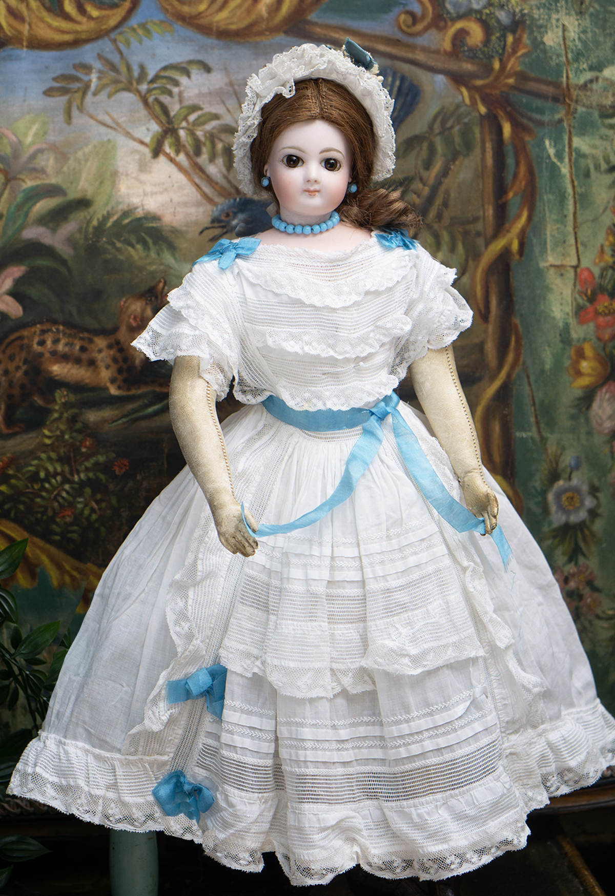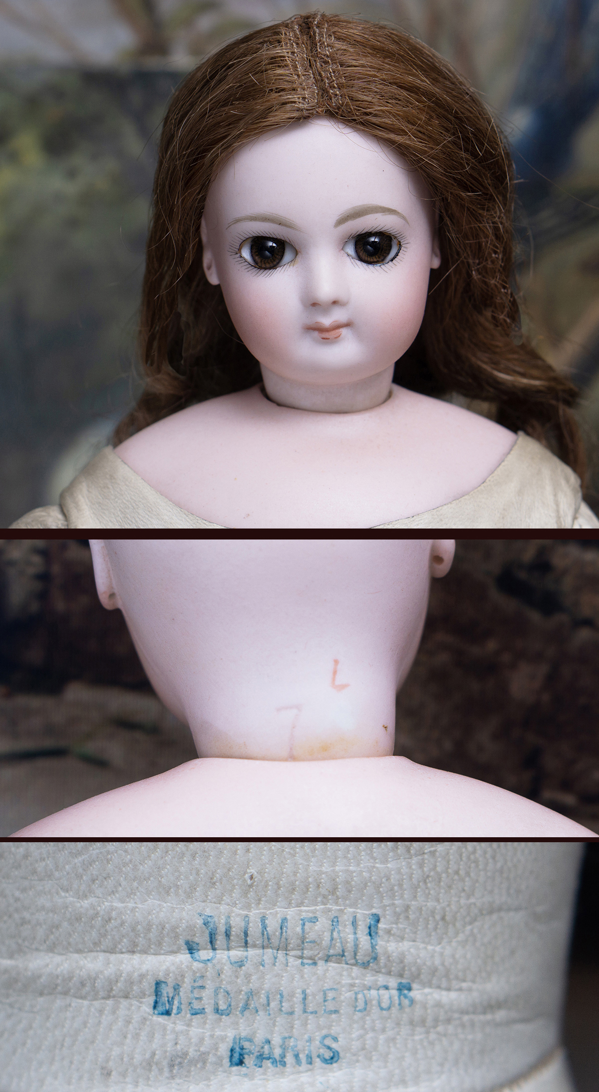 Regal brown-eyed poupee has very lovely bisque and painting, wearing lovely antique gown and bonnet. 19" (48 cm.) tall Condition: generally excellent. Marks: 7 (head and shoulders) Jumeau Medaille d'Or Paris (body). Emile Jumeau, circa 1878. International shipping coist $70.00 ------------------------------------ I DO A LAYAWAY NO STATE SALES TAX! Thanks for your visit to Respectfulbear doll shop!