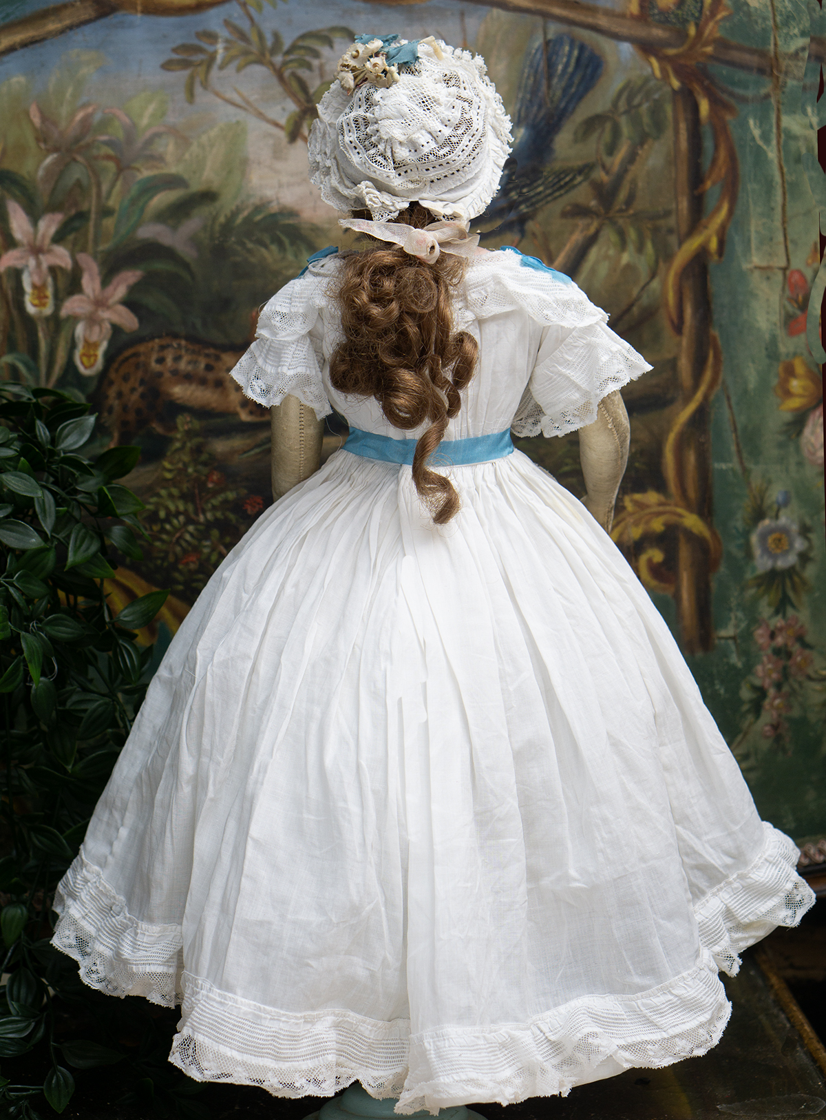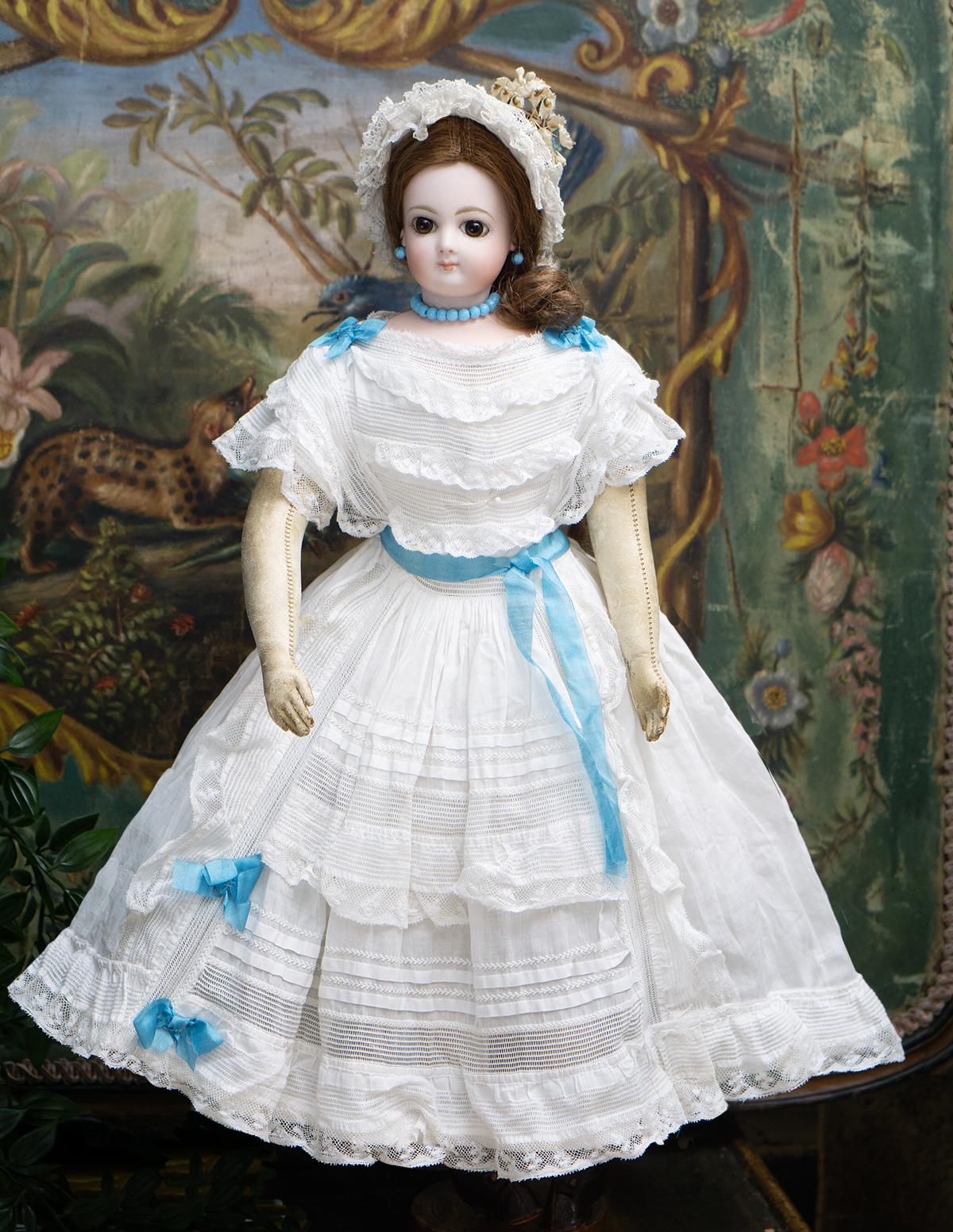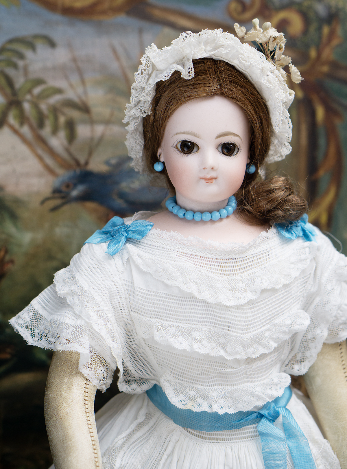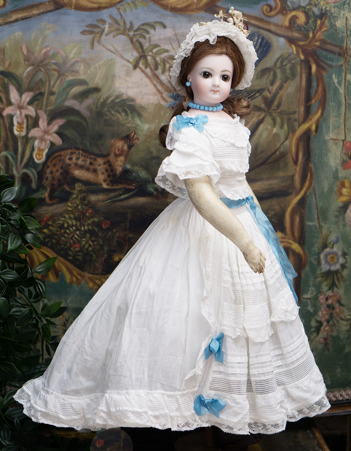 Regal brown-eyed poupee has very lovely bisque and painting, wearing lovely antique gown and bonnet. 19" (48 cm.) tall Condition: generally excellent. Marks: 7 (head and shoulders) Jumeau Medaille d'Or Paris (body). Emile Jumeau, circa 1878. International shipping coist $70.00 ------------------------------------ I DO A LAYAWAY NO STATE SALES TAX! Thanks for your visit to Respectfulbear doll shop!