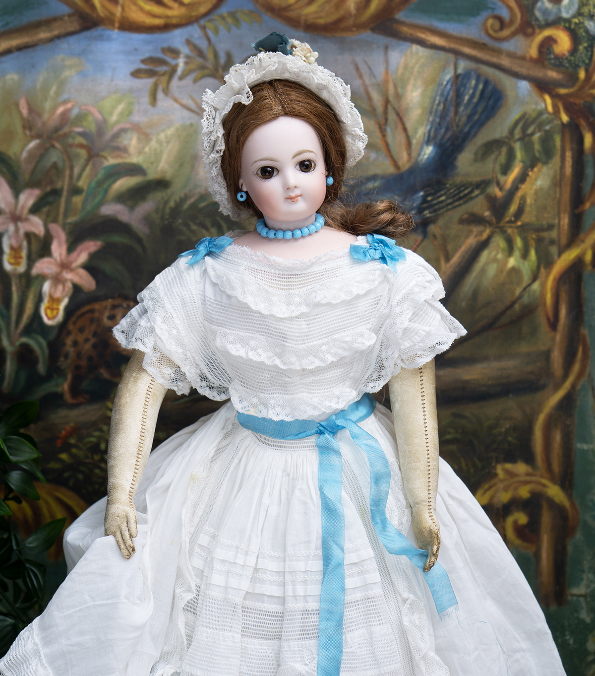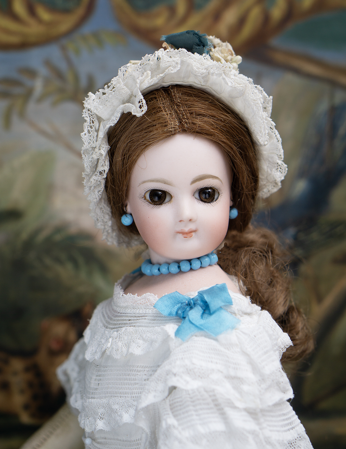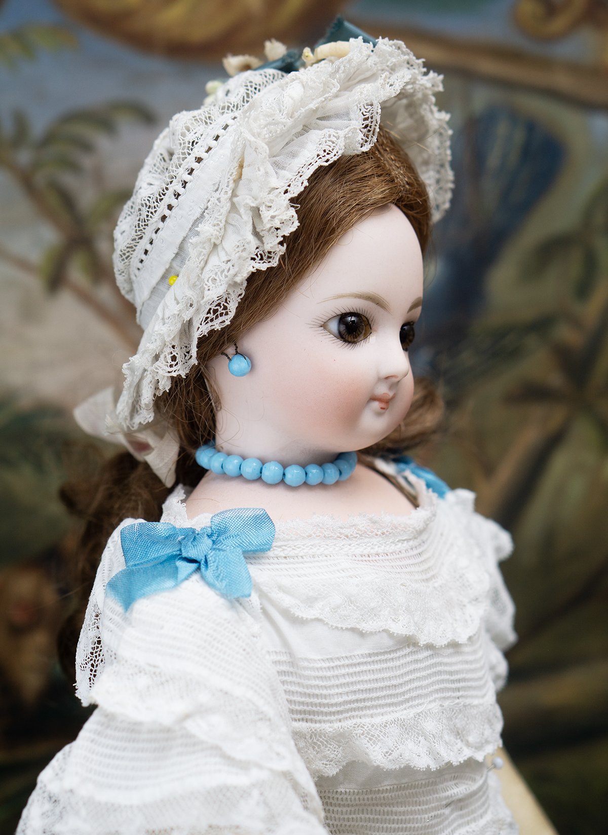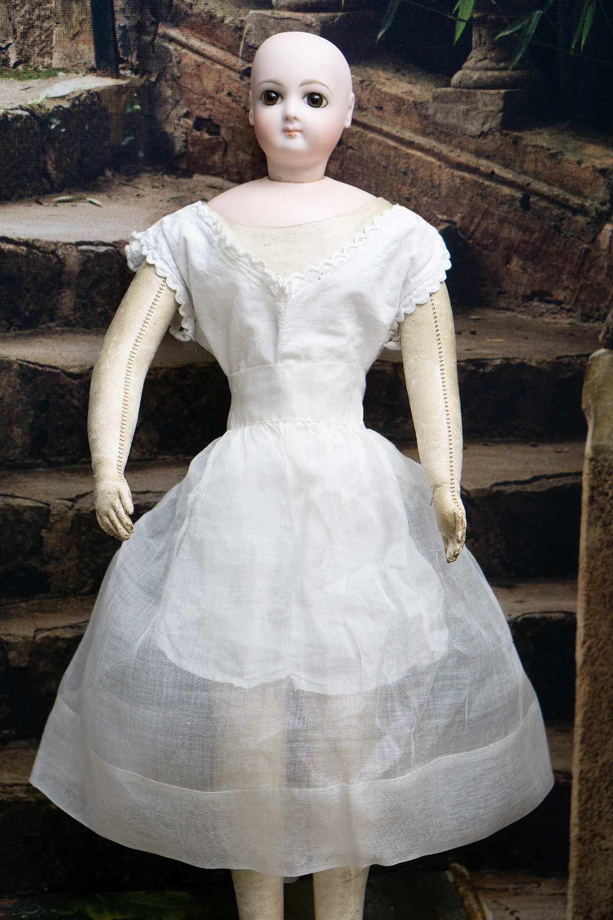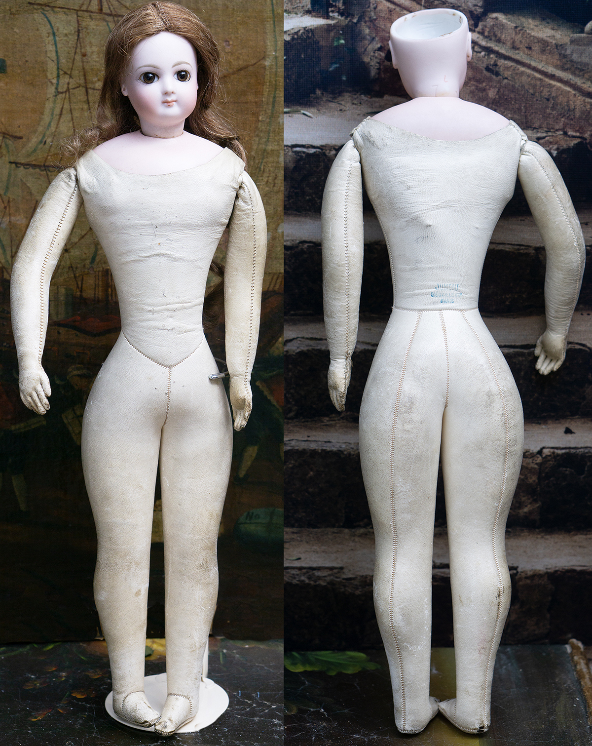 Bisque swivel head on kid-edged bisque shoulderplate, brown glass paperweight inset eyes, dark eyeliner, lushly-painted lashes, brushstroked brows, accented nostrils and eye corners, closed mouth with center accent line, pierced ears, brunette human hair over cork pate, shapely sturdy kid poupee body.