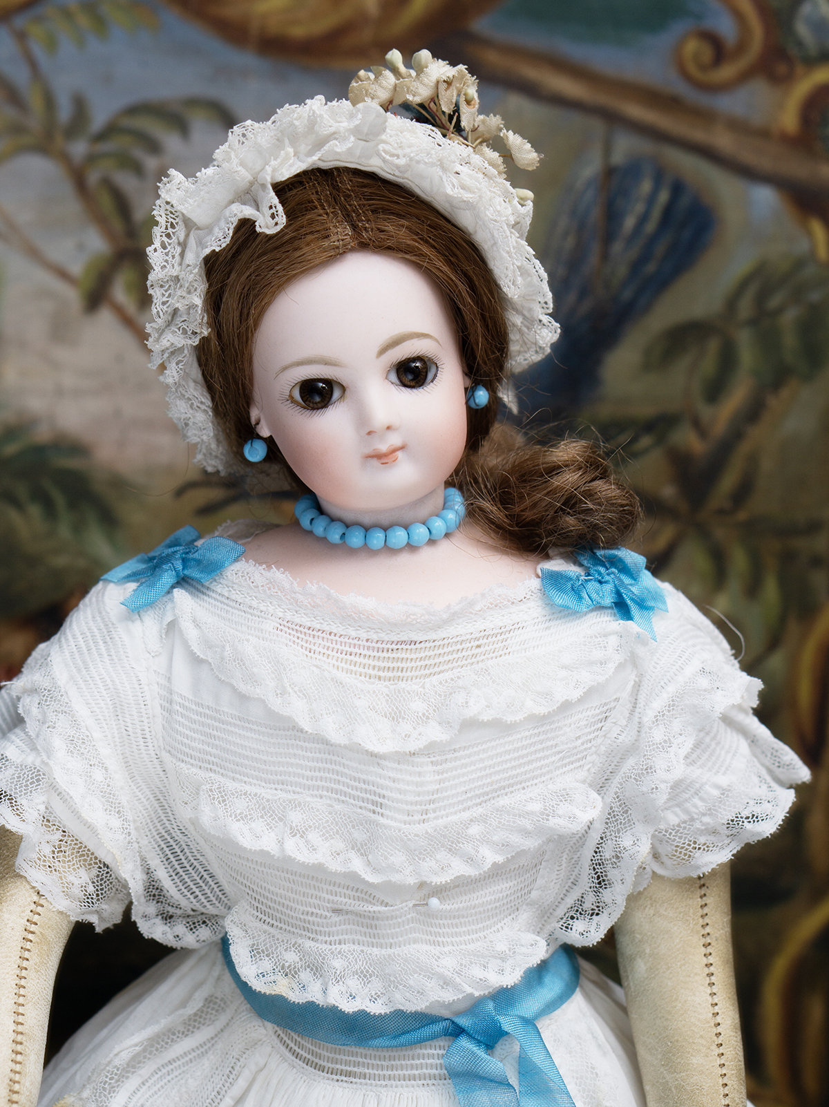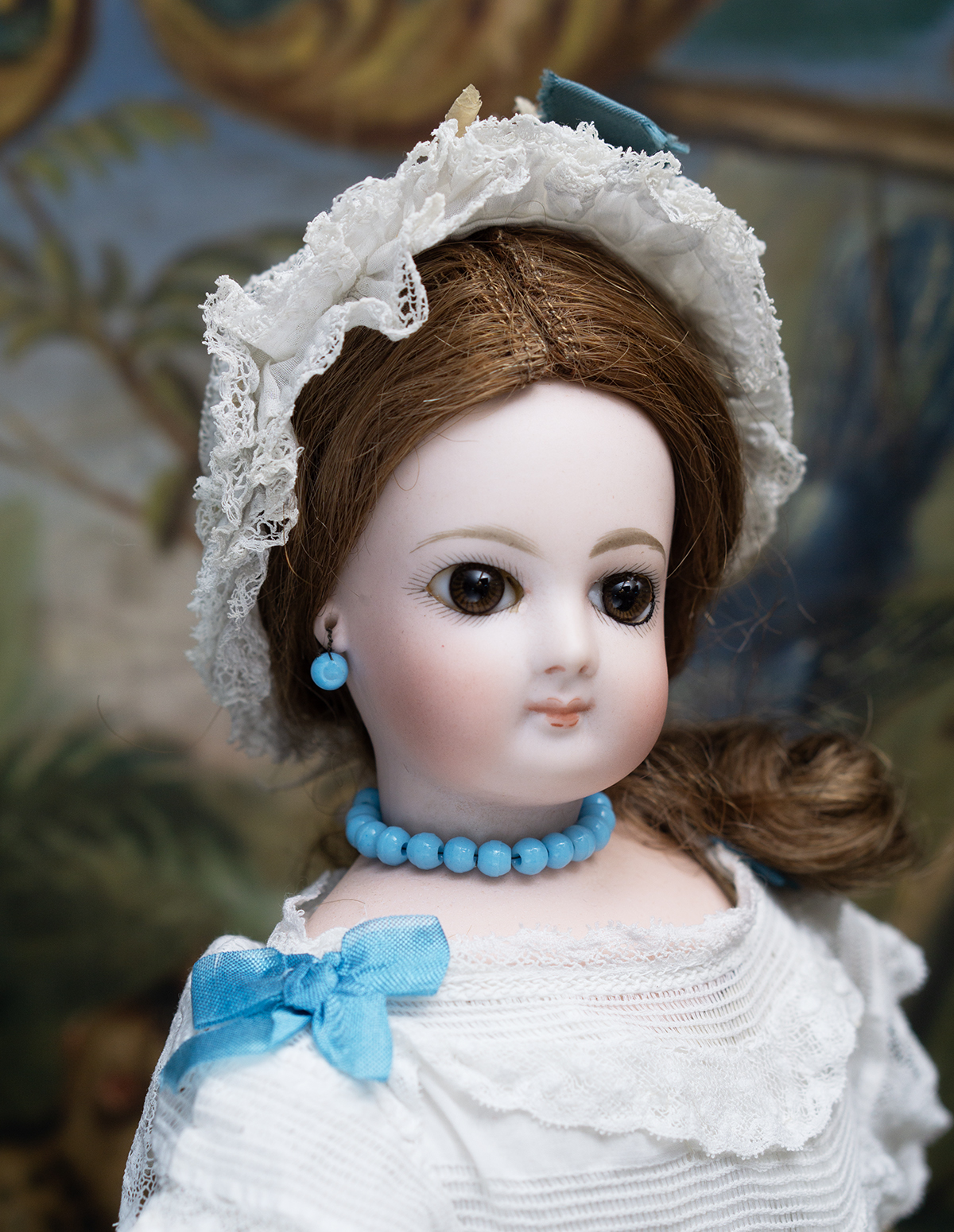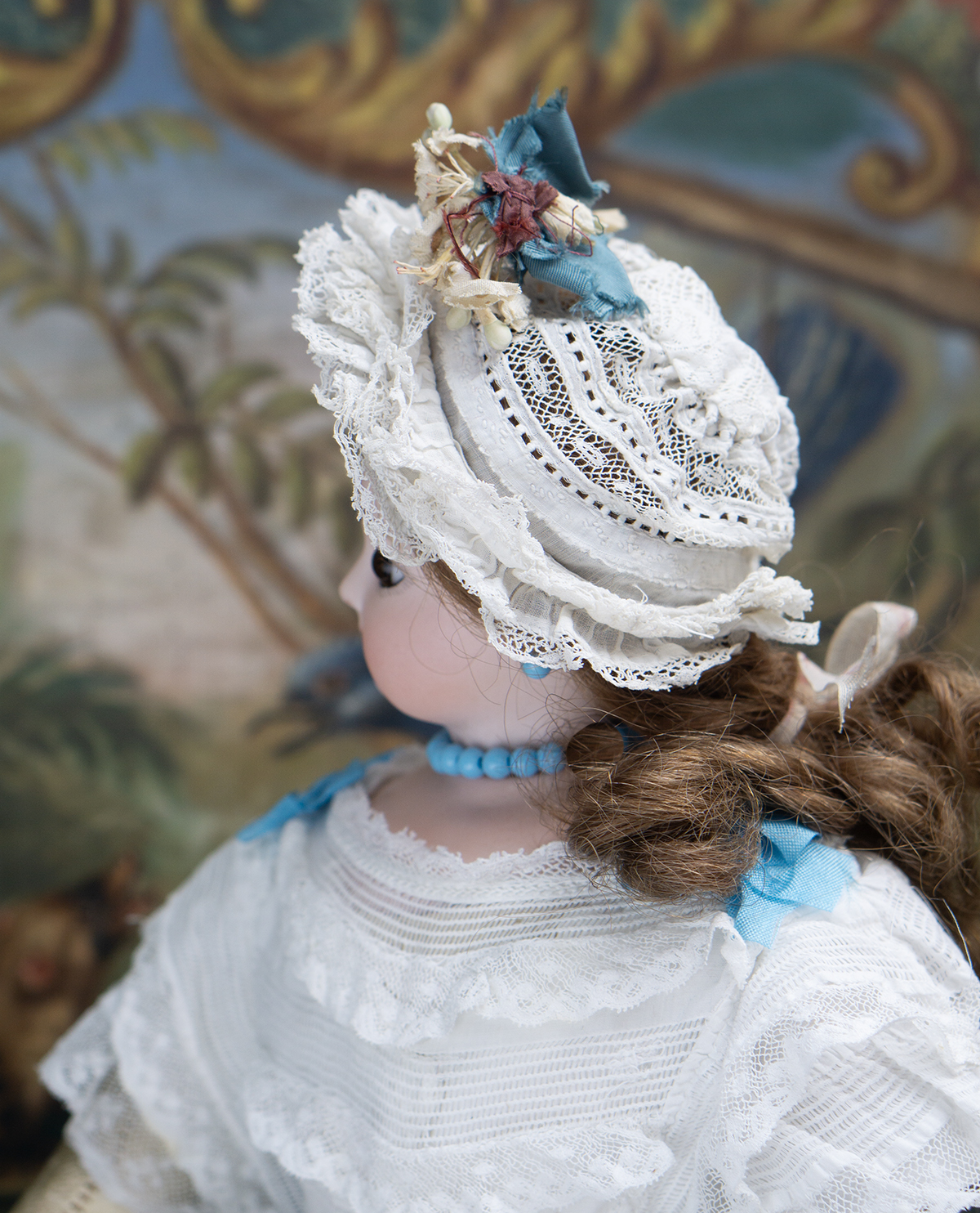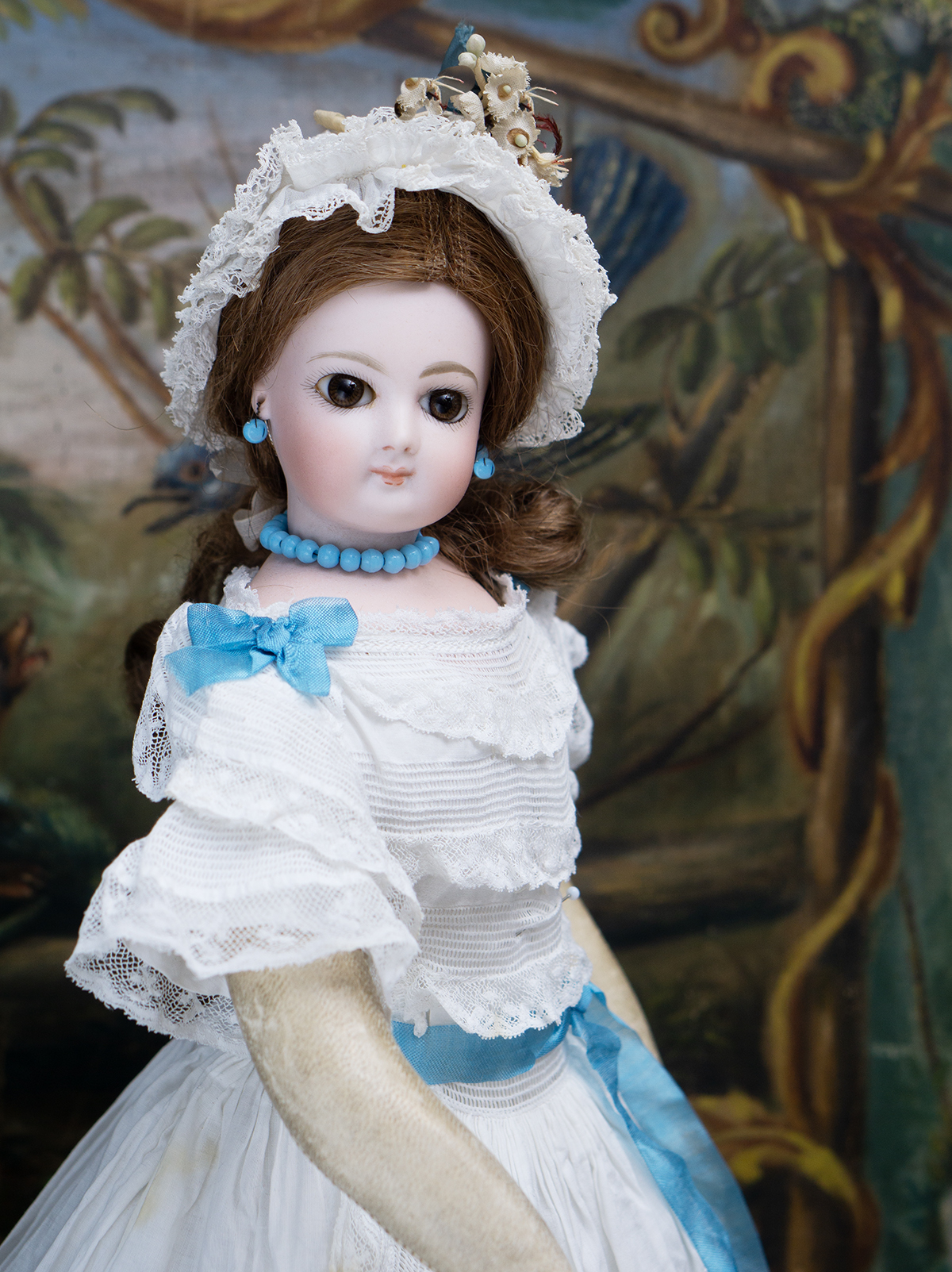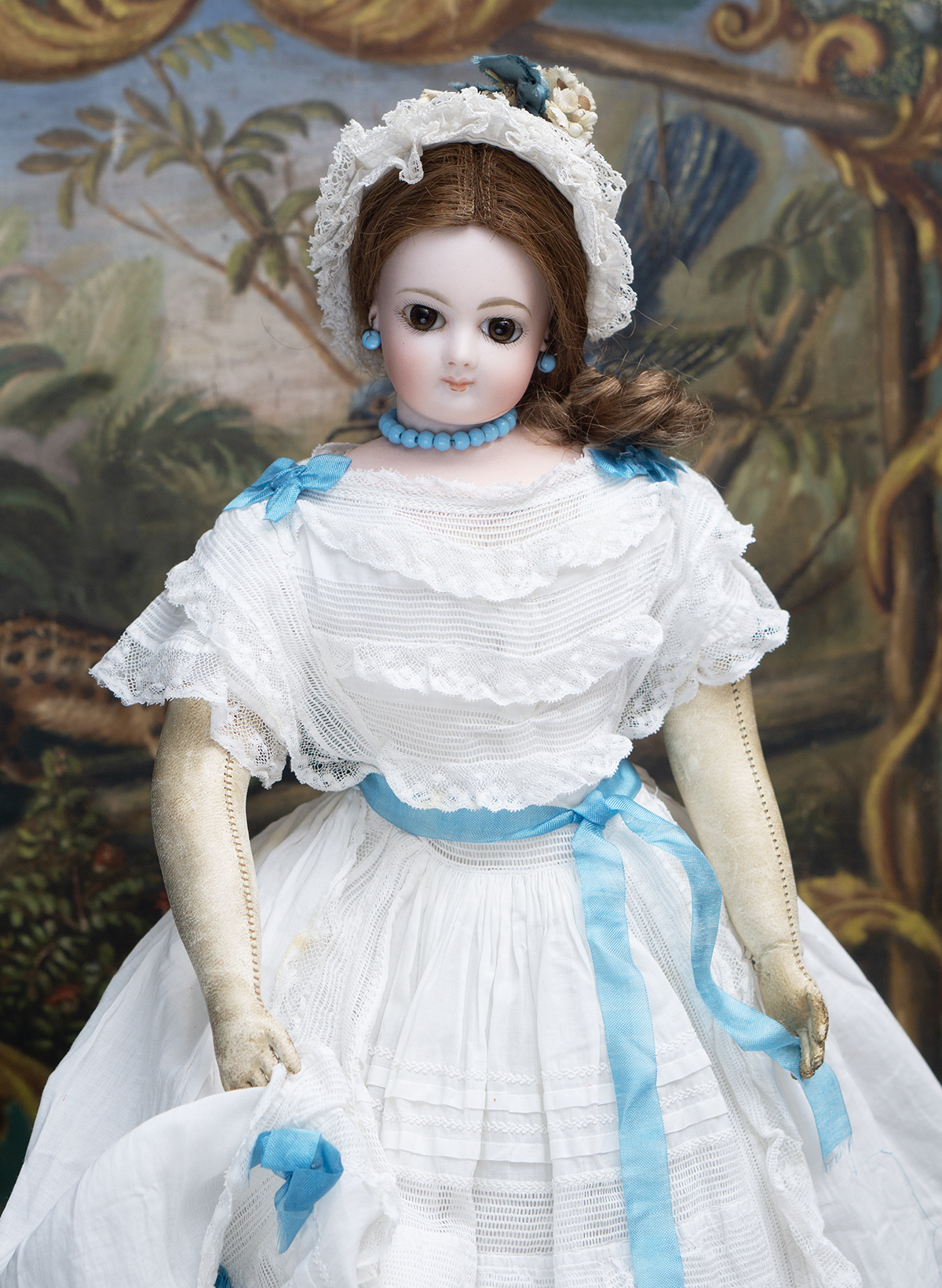 Bisque swivel head on kid-edged bisque shoulderplate, brown glass paperweight inset eyes, dark eyeliner, lushly-painted lashes, brushstroked brows, accented nostrils and eye corners, closed mouth with center accent line, pierced ears, brunette human hair over cork pate, shapely sturdy kid poupee body.