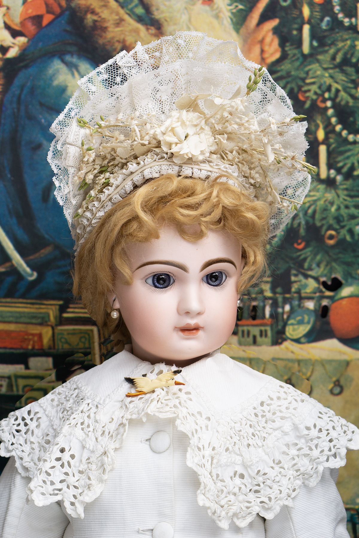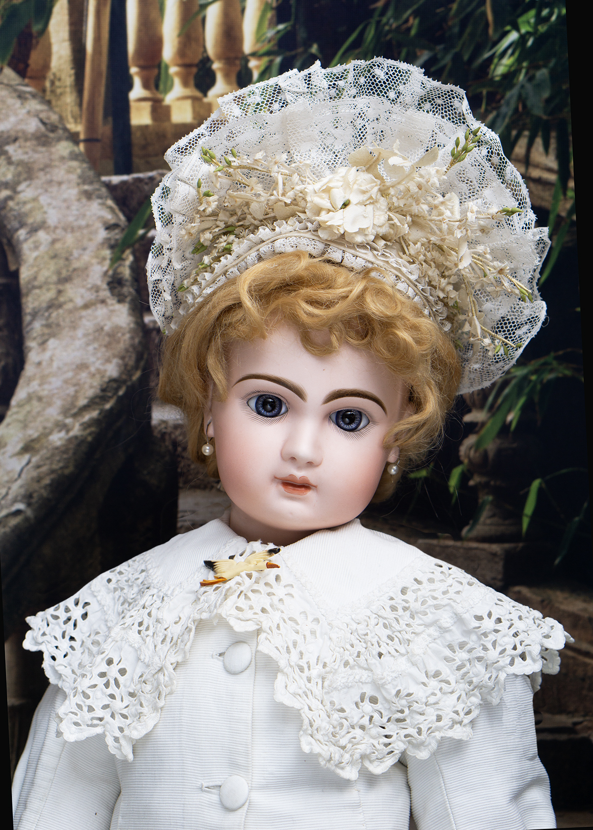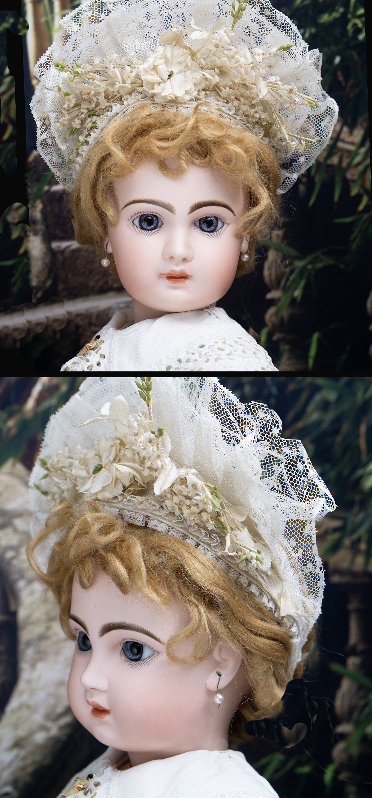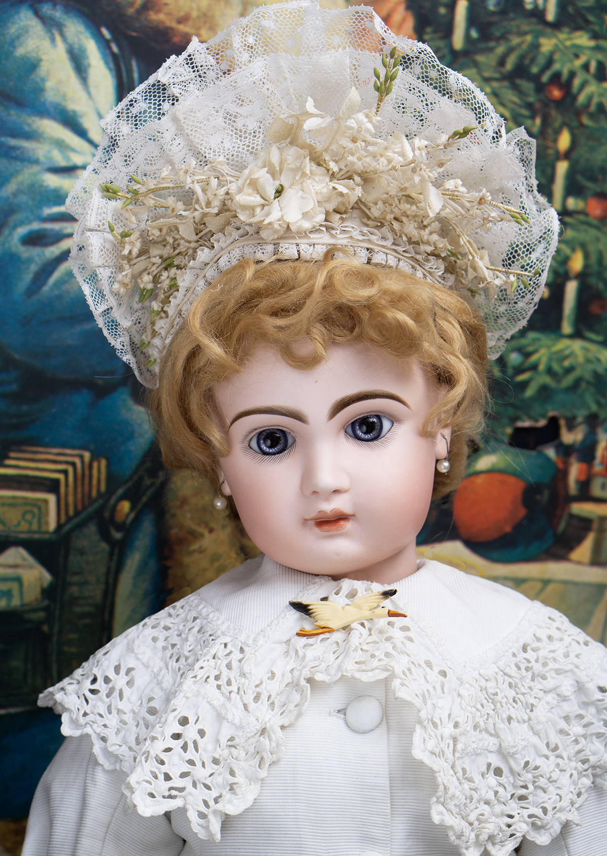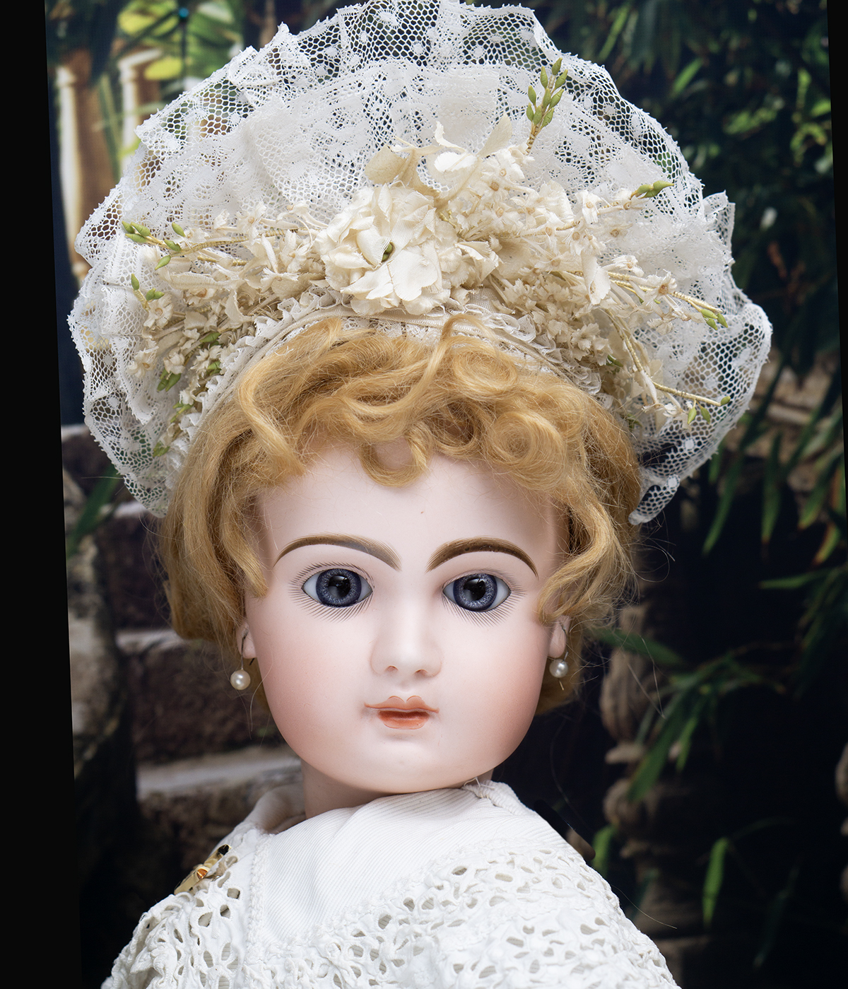 Bisque socket head, deep blue glass paperweight inset eyes, dark painted lashes, brushstroked brows with decorative glaze, shaded nostrils, closed mouth with shaded and outlined lips, pierced ears, original mohair wig over cork pate, French composition and wooden fully-jointed body.