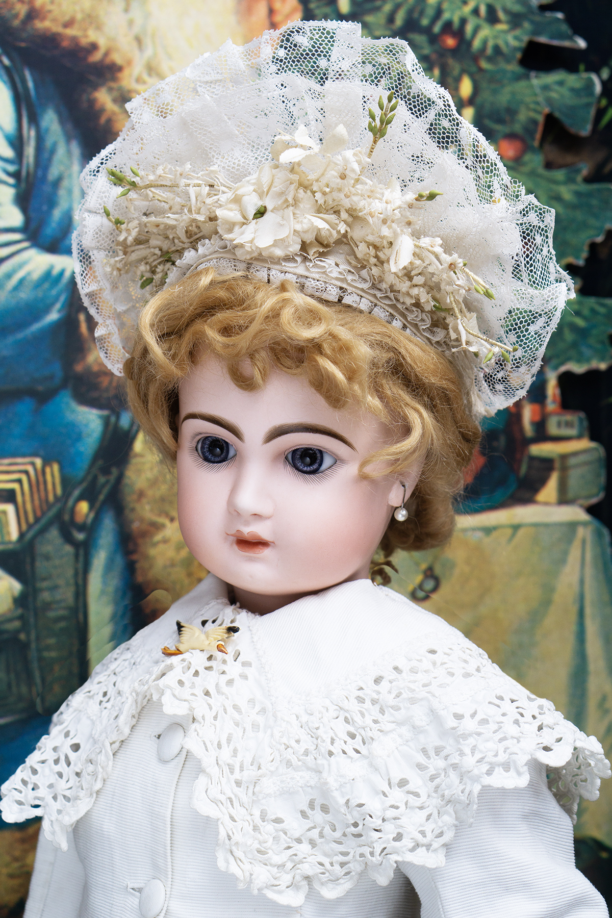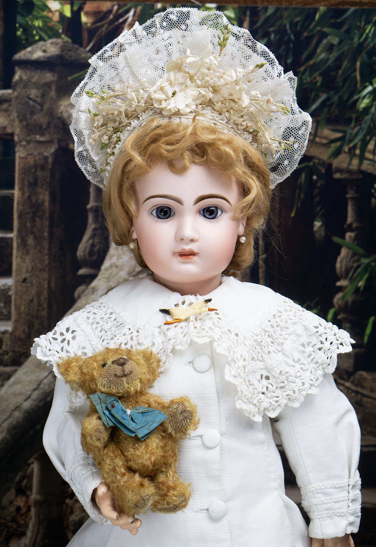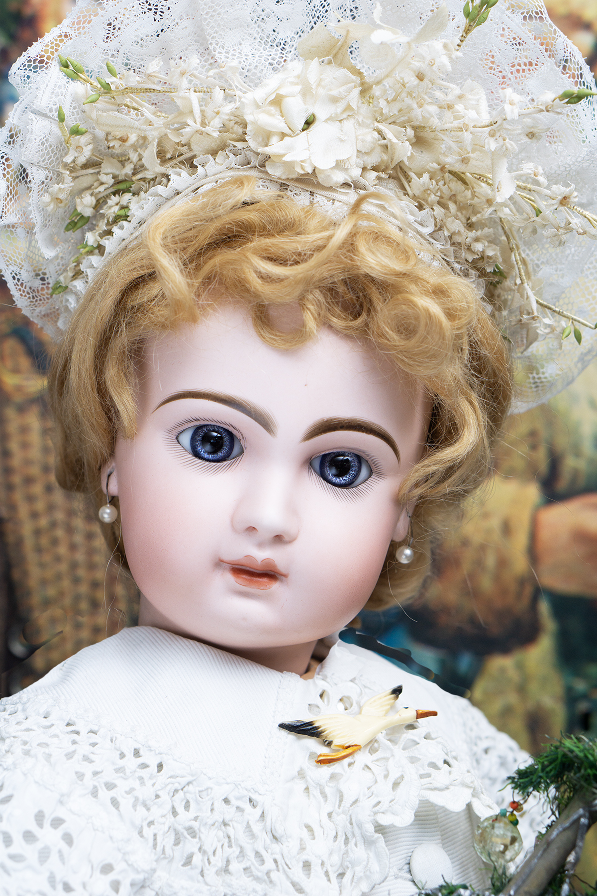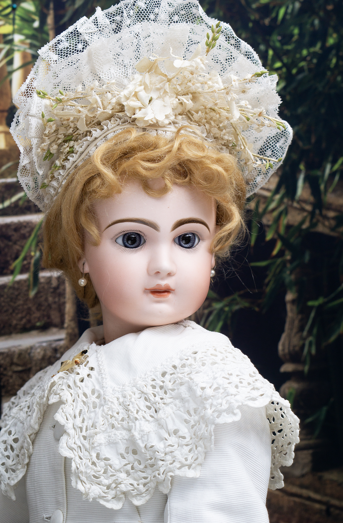 Bisque socket head, deep blue glass paperweight inset eyes, dark painted lashes, brushstroked brows with decorative glaze, shaded nostrils, closed mouth with shaded and outlined lips, pierced ears, original mohair wig over cork pate, French composition and wooden fully-jointed body.