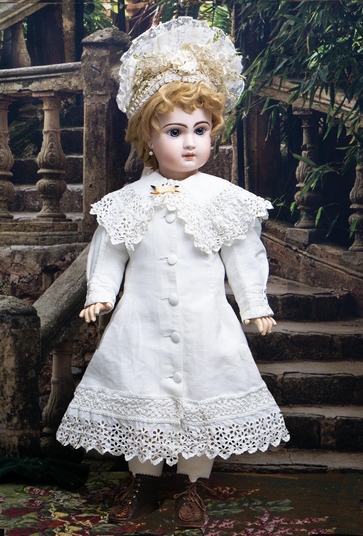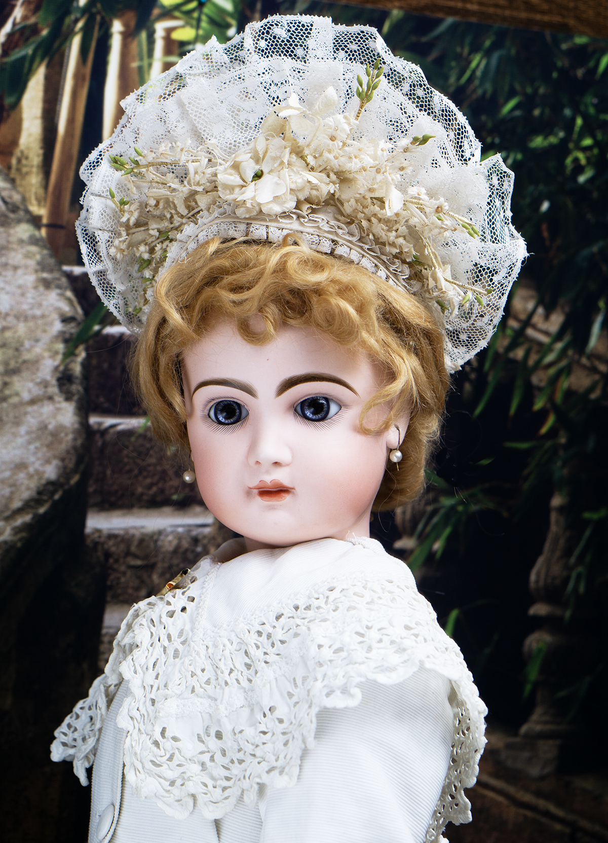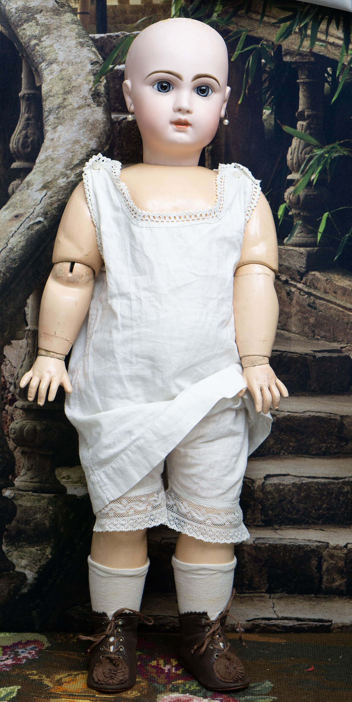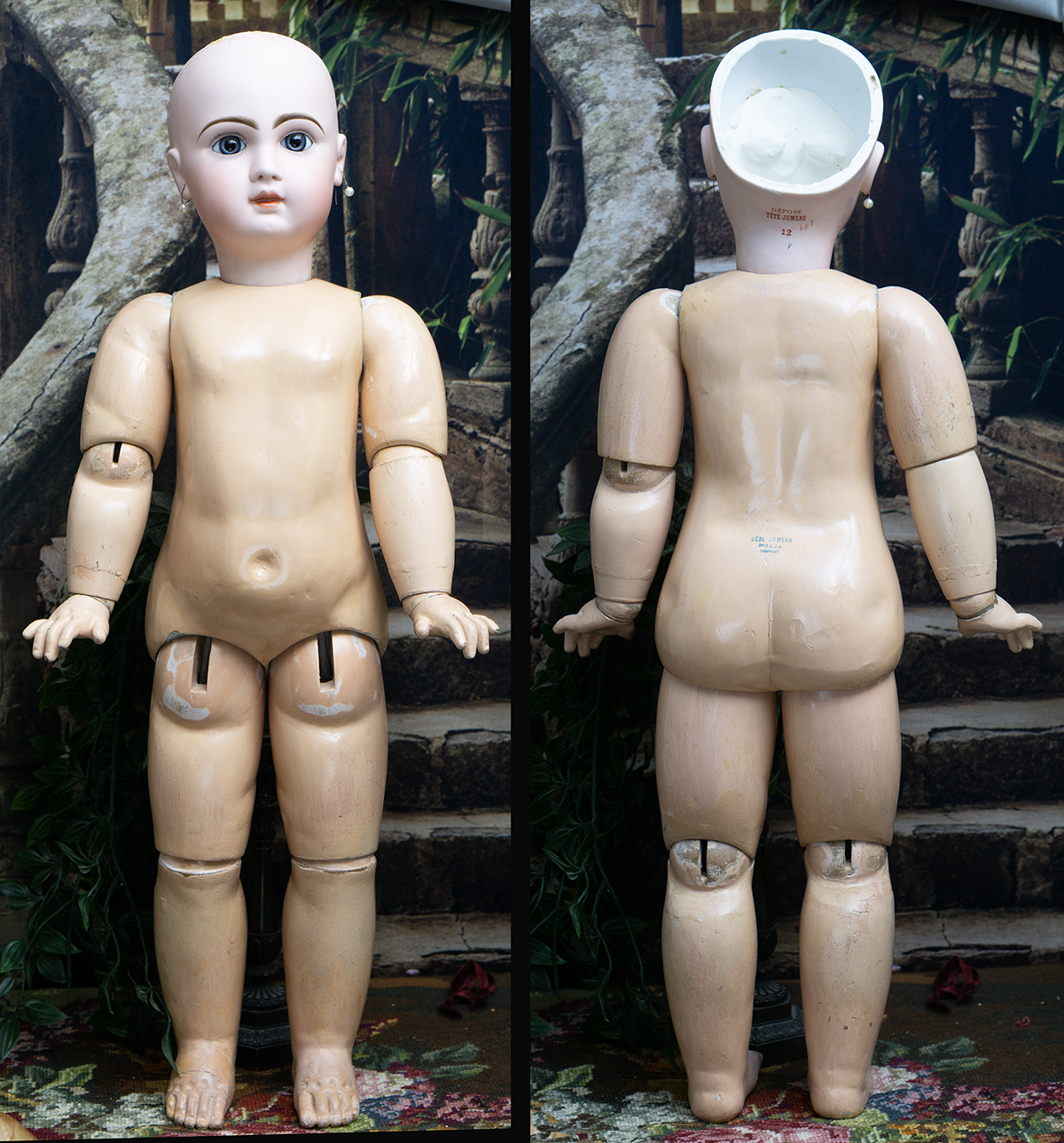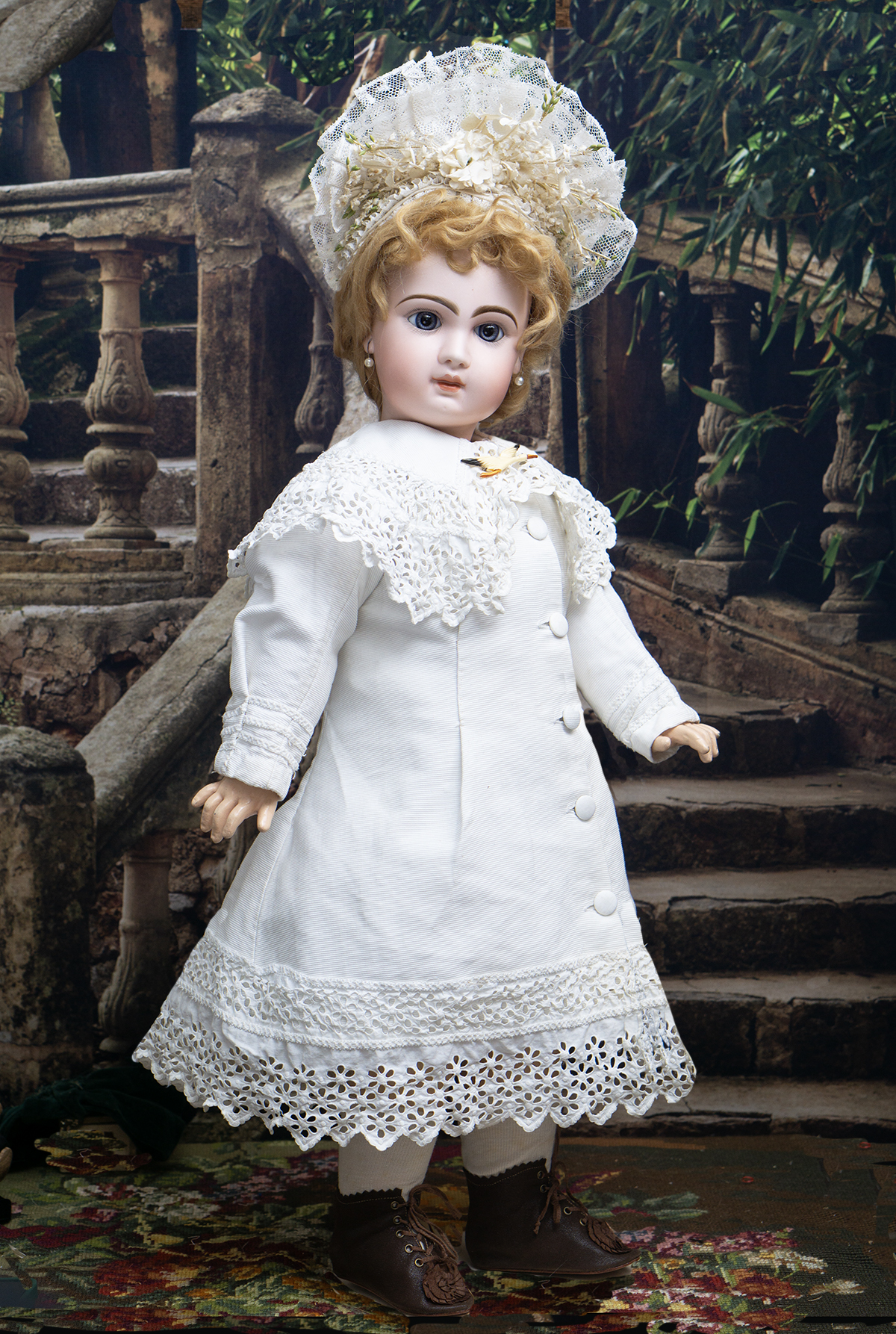 Bisque socket head, deep blue glass paperweight inset eyes, dark painted lashes, brushstroked brows with decorative glaze, shaded nostrils, closed mouth with shaded and outlined lips, pierced ears, original mohair wig over cork pate, French composition and wooden fully-jointed body.