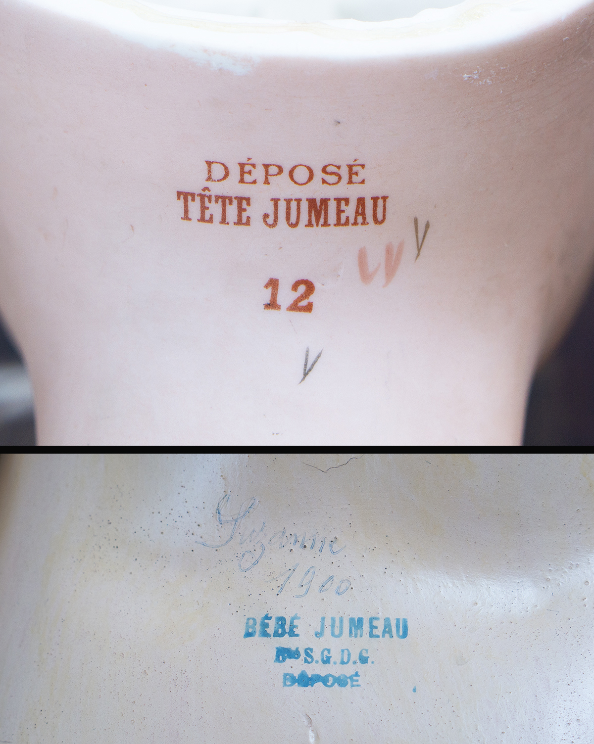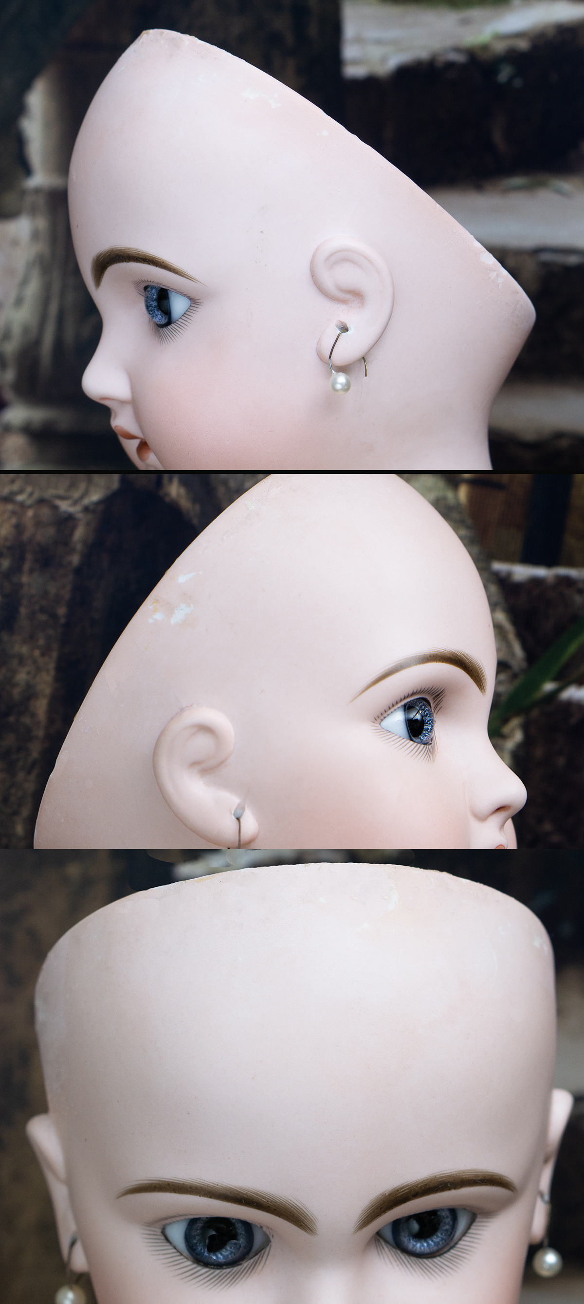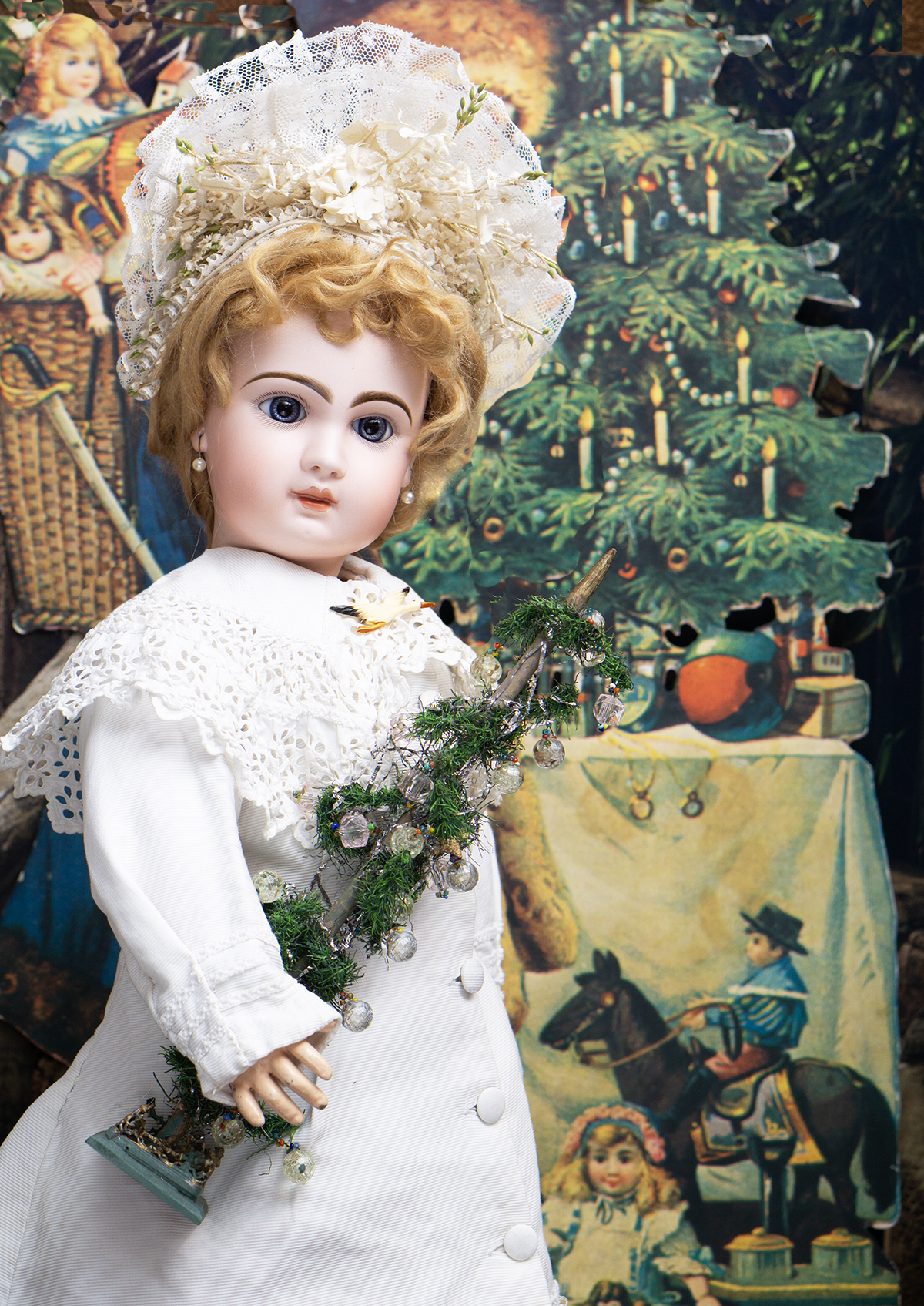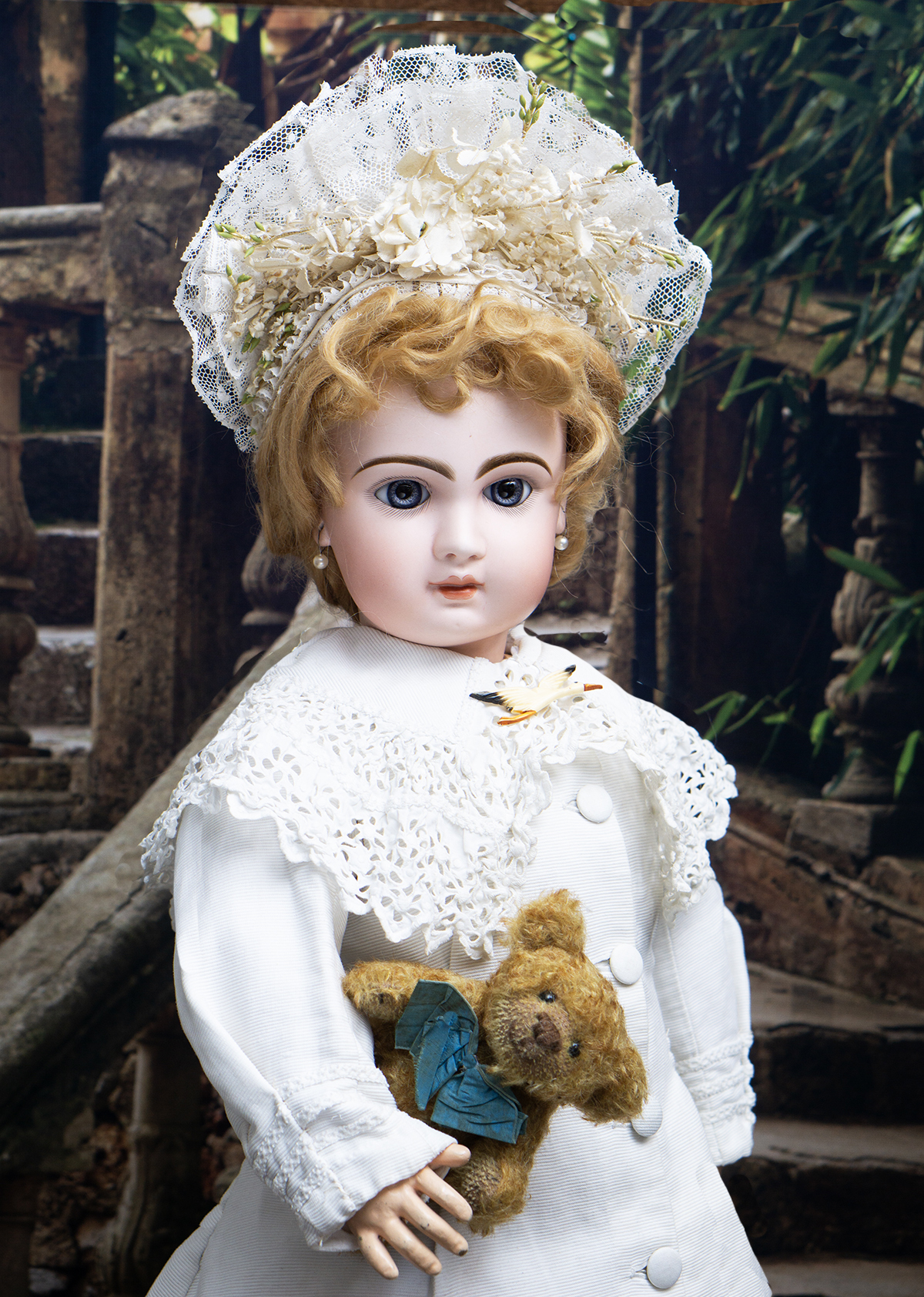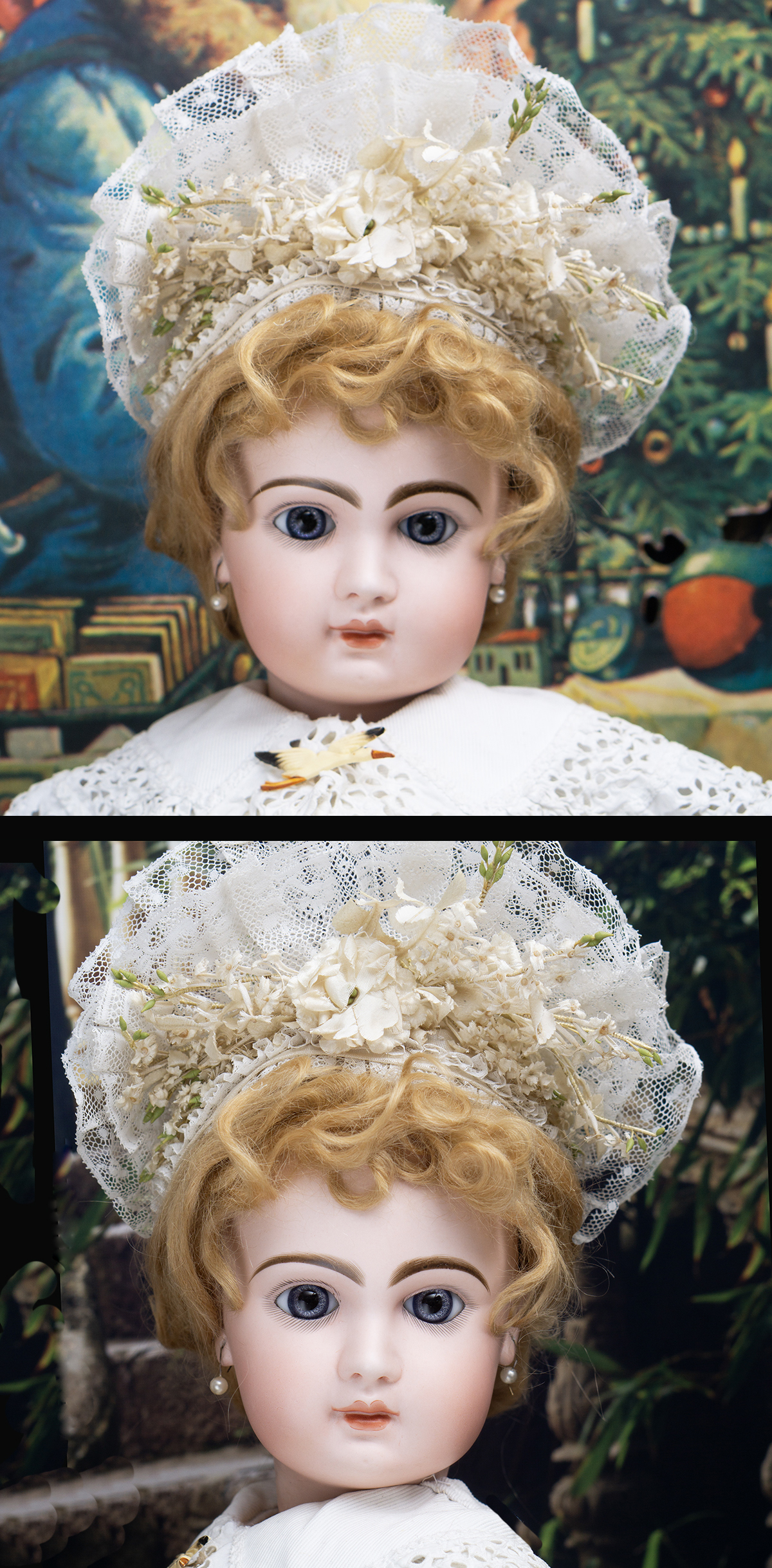 Bisque socket head, deep blue glass paperweight inset eyes, dark painted lashes, brushstroked brows with decorative glaze, shaded nostrils, closed mouth with shaded and outlined lips, pierced ears, original mohair wig over cork pate, French composition and wooden fully-jointed body.