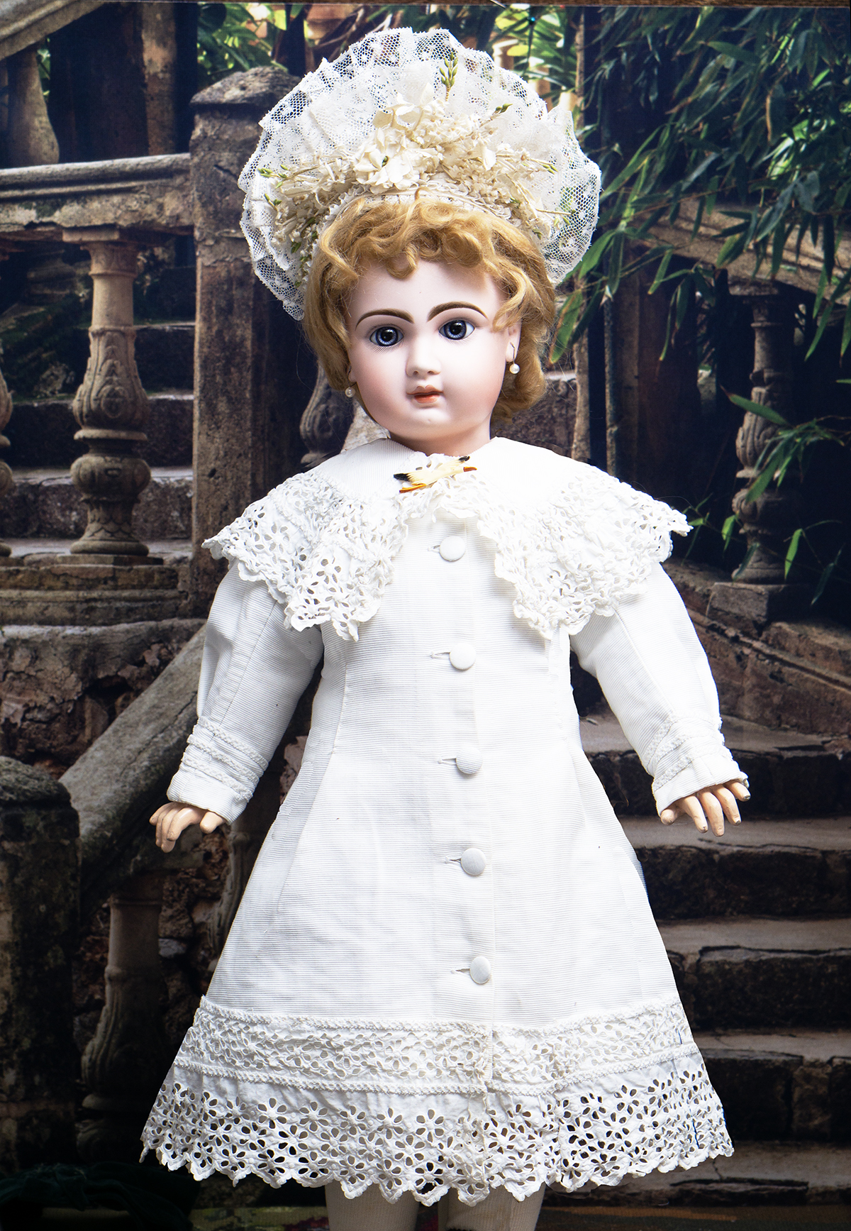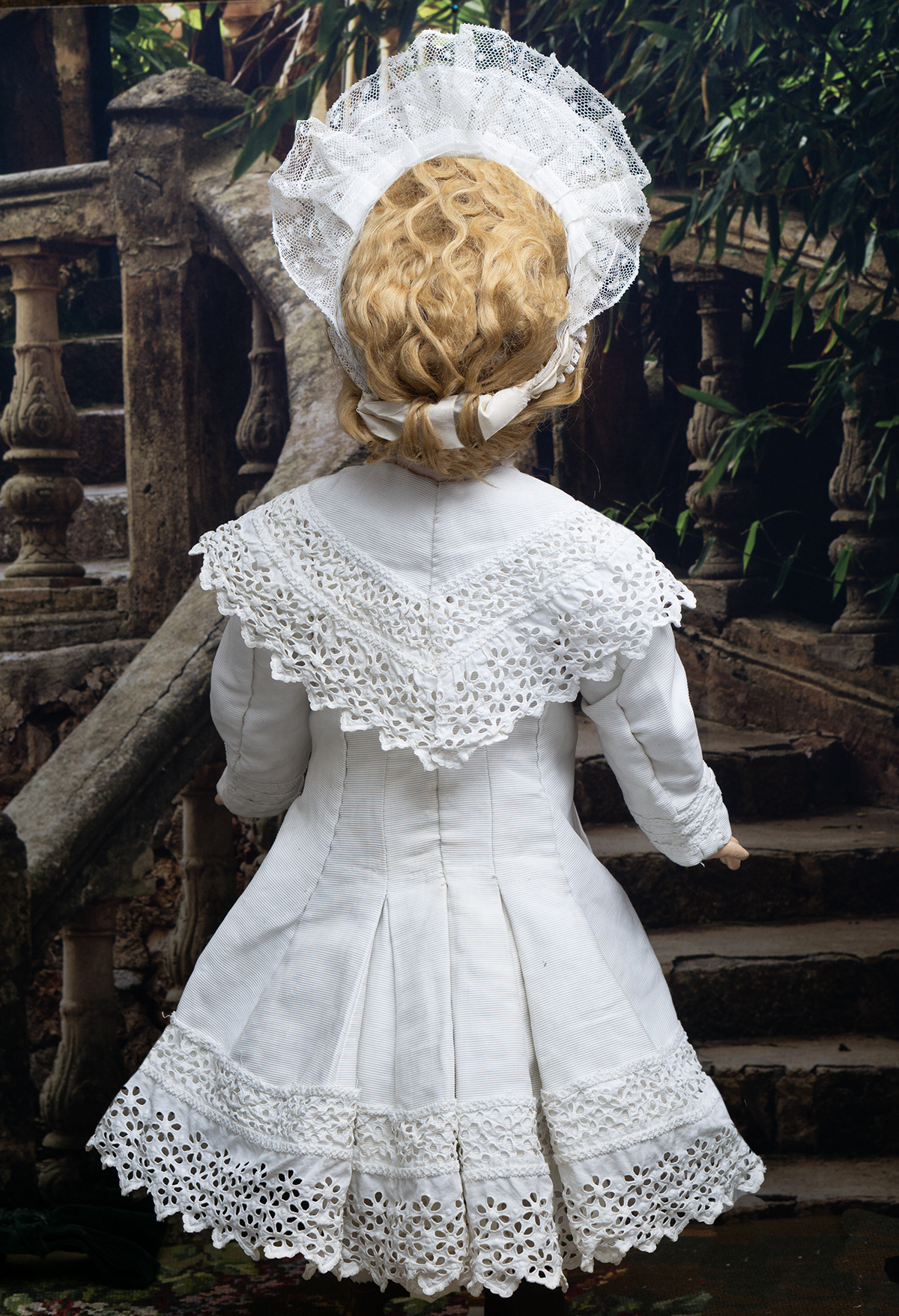 Very beautiful delicately tinted creamy bisque with entrancing eye decoration, gorgeous antique pique dress and bonnet, undergarments, socks, vinbtage leather shoes. Condition: generally excellent, her bisque free of hairline or restoration, very small several wig pulls under the wig, original body and body finish. Marks: Depose Tete Jumeau Bte SGDG 12 (and artist checkmarks) Bebe Jumeau Bte SGDG Paris (torso). Emile Jumeau, circa 1890. 27" (68 cm) tall International shipping cost 75.00 ------------------------------------ I DO A LAYAWAY NO STATE SALES TAX! Thanks for your visit to Respectfulbear doll shop!