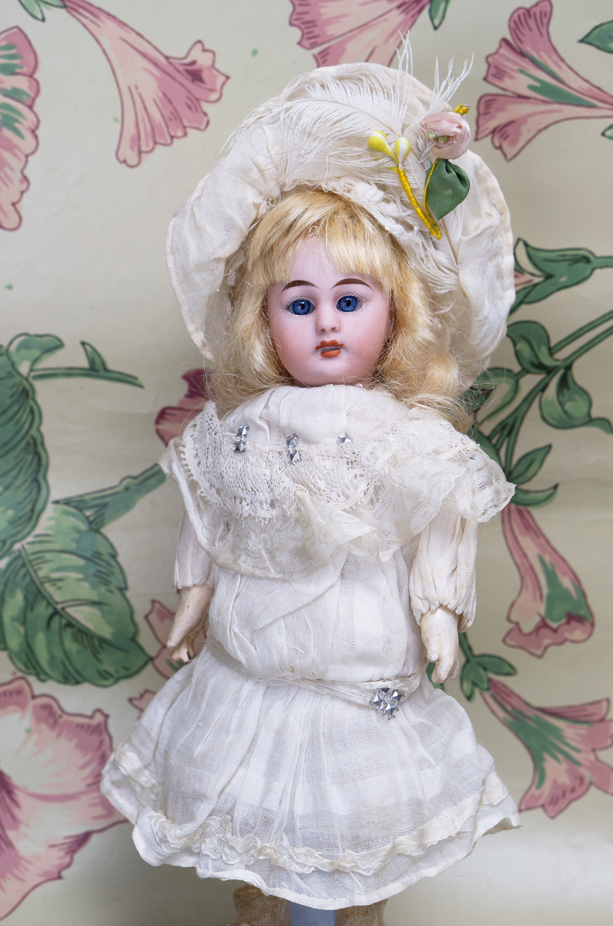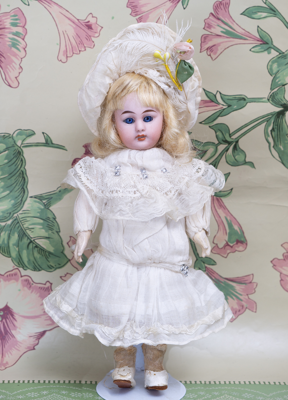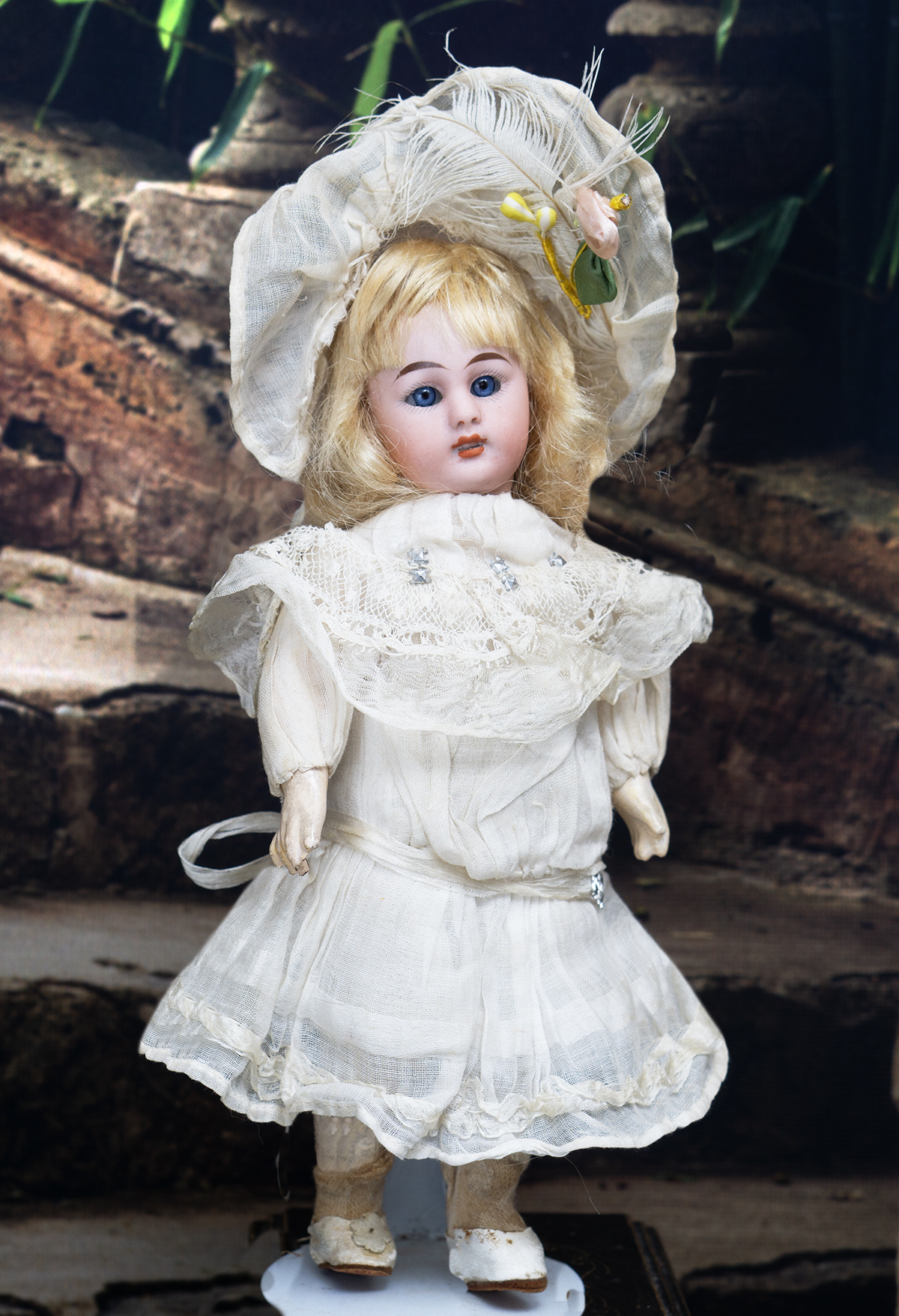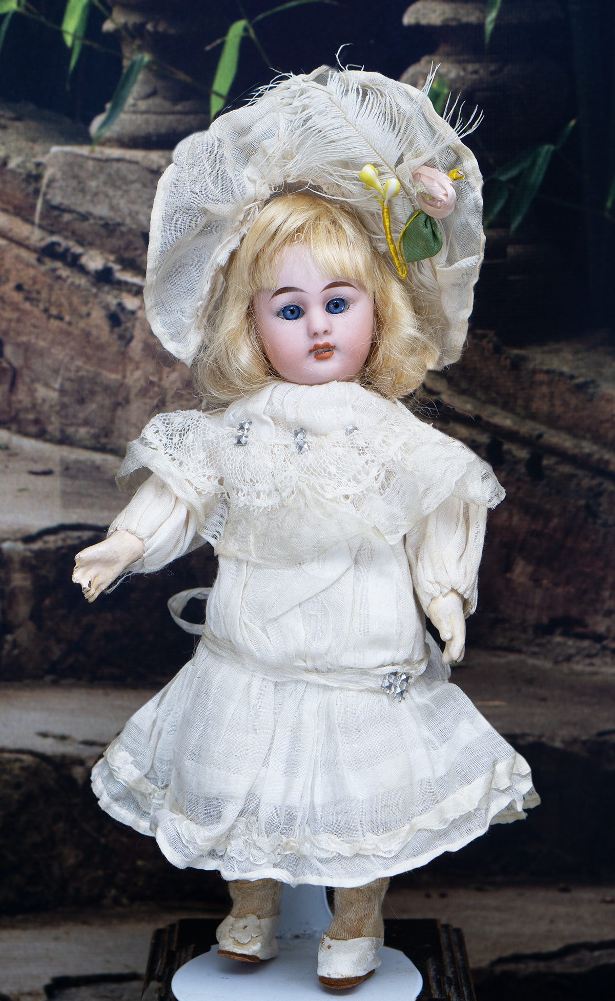 The doll wears her original muslin dress with lace Bertha collar and with silk ruffles, original cotton 7nderwear, white muslin bonnet whit white feather, socks and shoes. Signed "1079 3/0 dep S&H Germany". Simon and Halbig, circa 1900. 8" (20 cm) tall. Very good condition to age. ------------------------------------ I DO A LAYAWAY (max. 12 months with monthly payments). NO ANY SALES TAX! International shipping cost $45.00. If you have any questions please email me to respectfulbear@respectfulbear.com. Thanks for your visit to Respectfulbear doll shop! ------------------------------------ I DO A LAYAWAY NO STATE SALES TAX! Thanks for your visit to Respectfulbear doll shop!