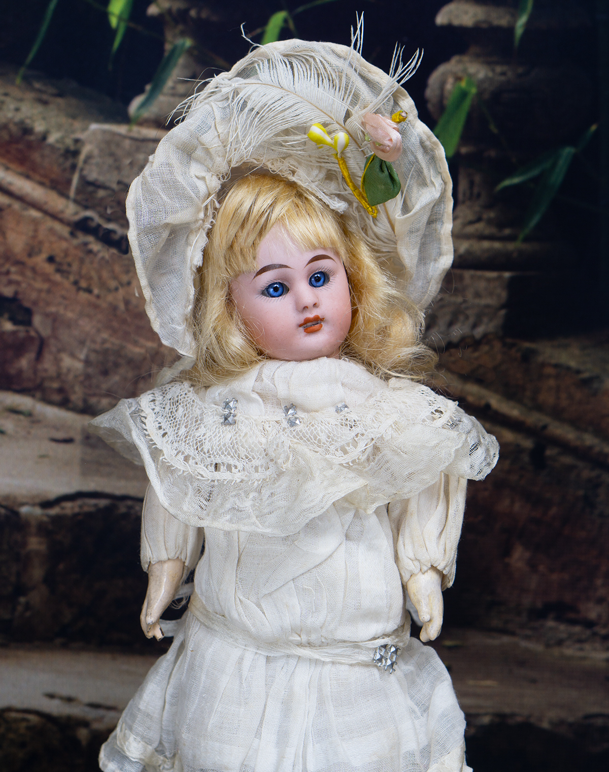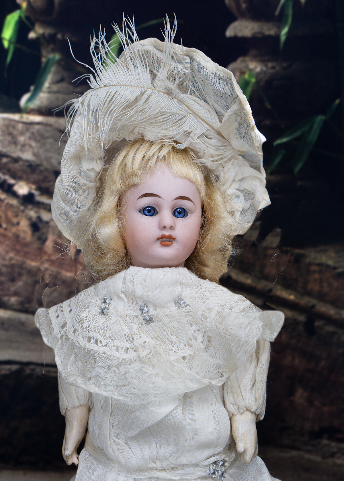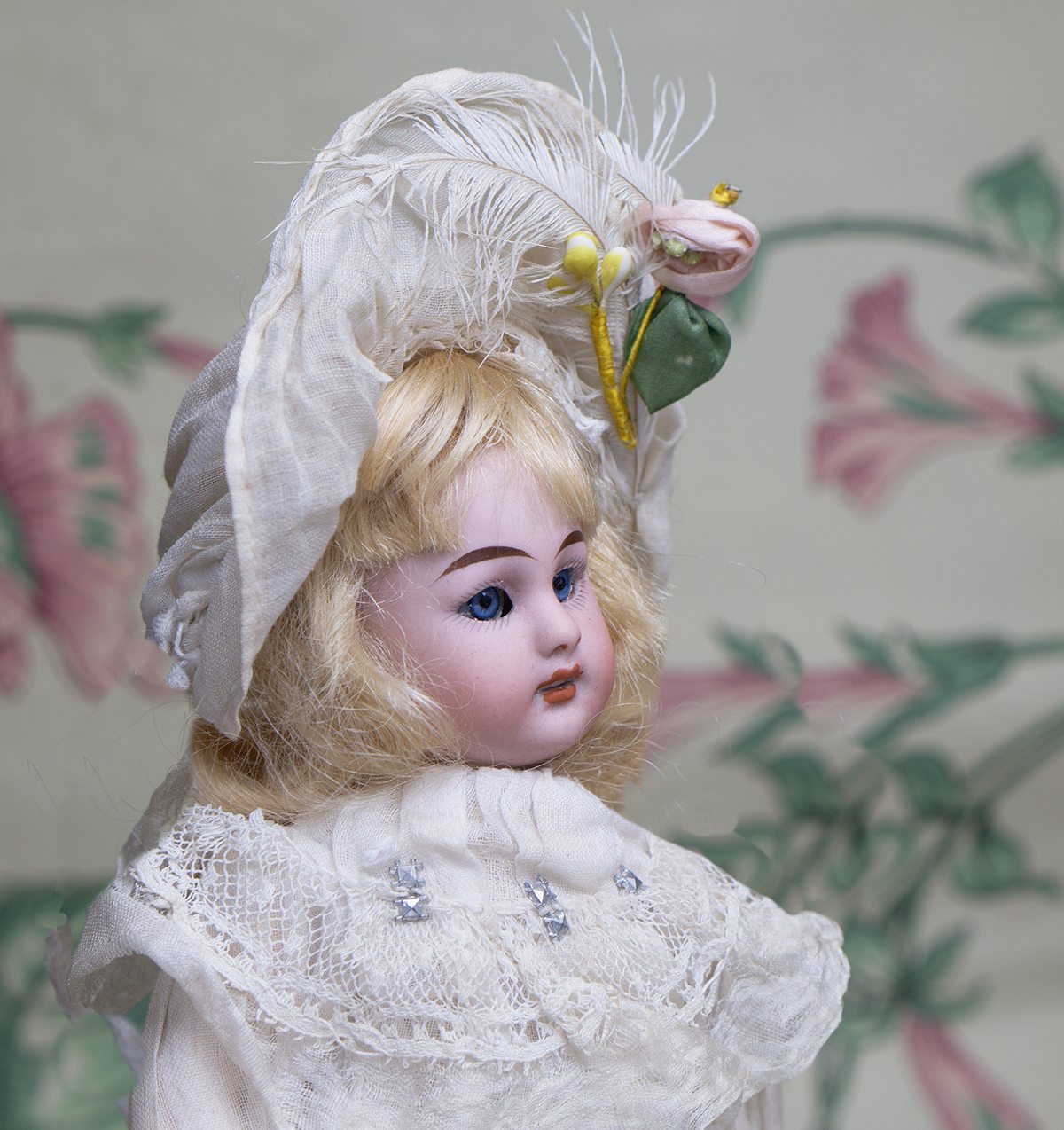 The doll wears her original muslin dress with lace Bertha collar and with silk ruffles, original cotton 7nderwear, white muslin bonnet whit white feather, socks and shoes. Signed "1079 3/0 dep S&H Germany". Simon and Halbig, circa 1900. 8" (20 cm) tall. Very good condition to age. ------------------------------------ I DO A LAYAWAY (max. 12 months with monthly payments). NO ANY SALES TAX! International shipping cost $45.00. If you have any questions please email me to respectfulbear@respectfulbear.com. Thanks for your visit to Respectfulbear doll shop! ------------------------------------ I DO A LAYAWAY NO STATE SALES TAX! Thanks for your visit to Respectfulbear doll shop!