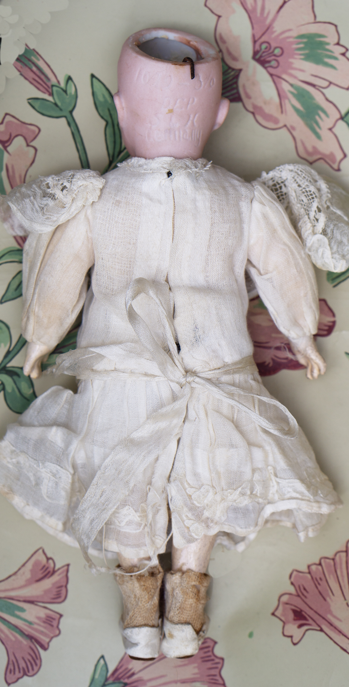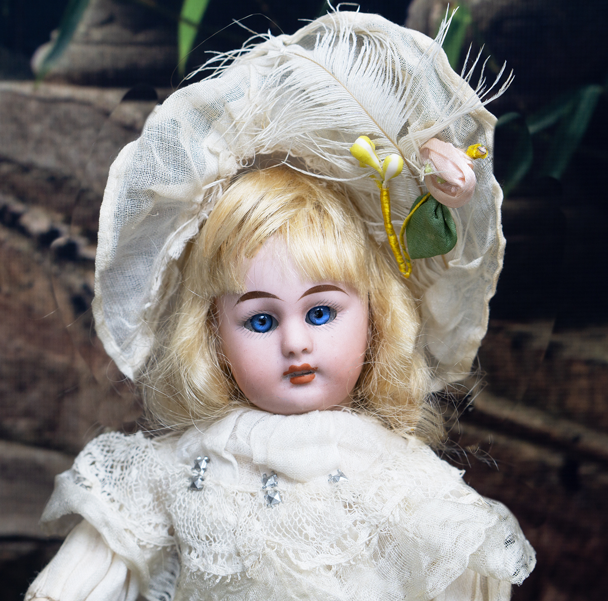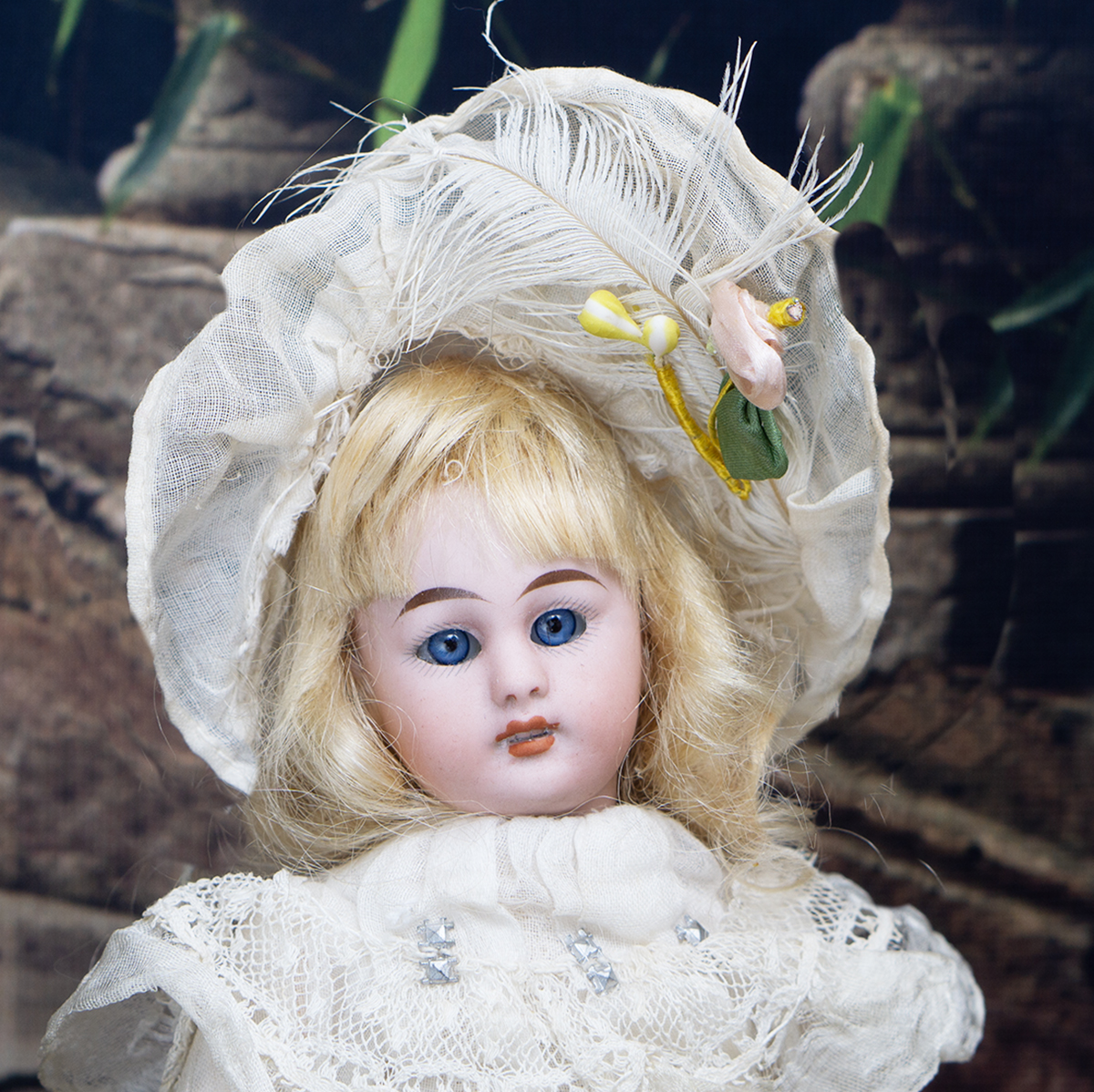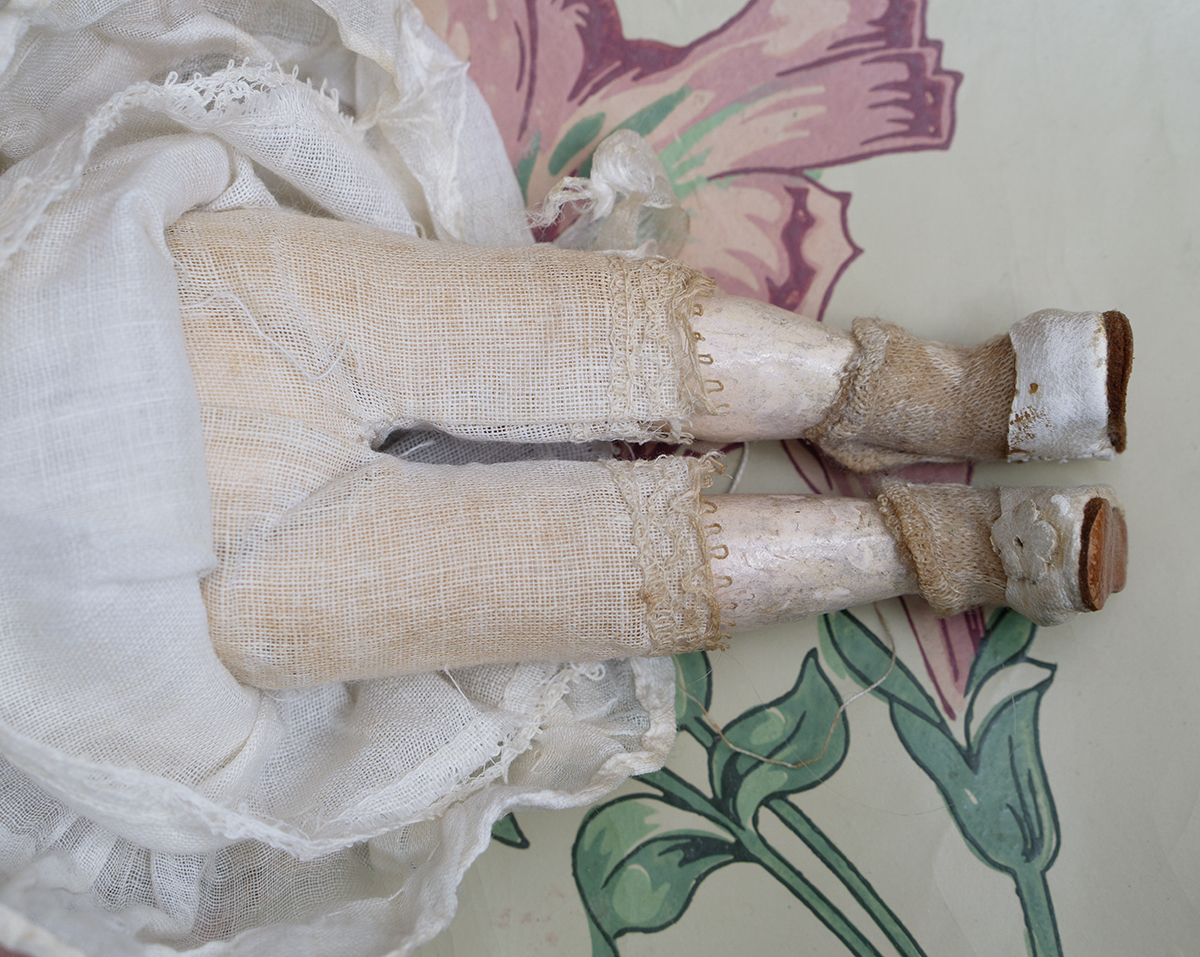 The doll wears her original muslin dress with lace Bertha collar and with silk ruffles, original cotton 7nderwear, white muslin bonnet whit white feather, socks and shoes. Signed "1079 3/0 dep S&H Germany". Simon and Halbig, circa 1900. 8" (20 cm) tall. Very good condition to age. ------------------------------------ I DO A LAYAWAY (max. 12 months with monthly payments). NO ANY SALES TAX! International shipping cost $45.00. If you have any questions please email me to respectfulbear@respectfulbear.com. Thanks for your visit to Respectfulbear doll shop! ------------------------------------ I DO A LAYAWAY NO STATE SALES TAX! Thanks for your visit to Respectfulbear doll shop!