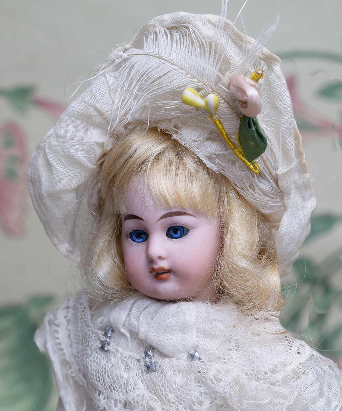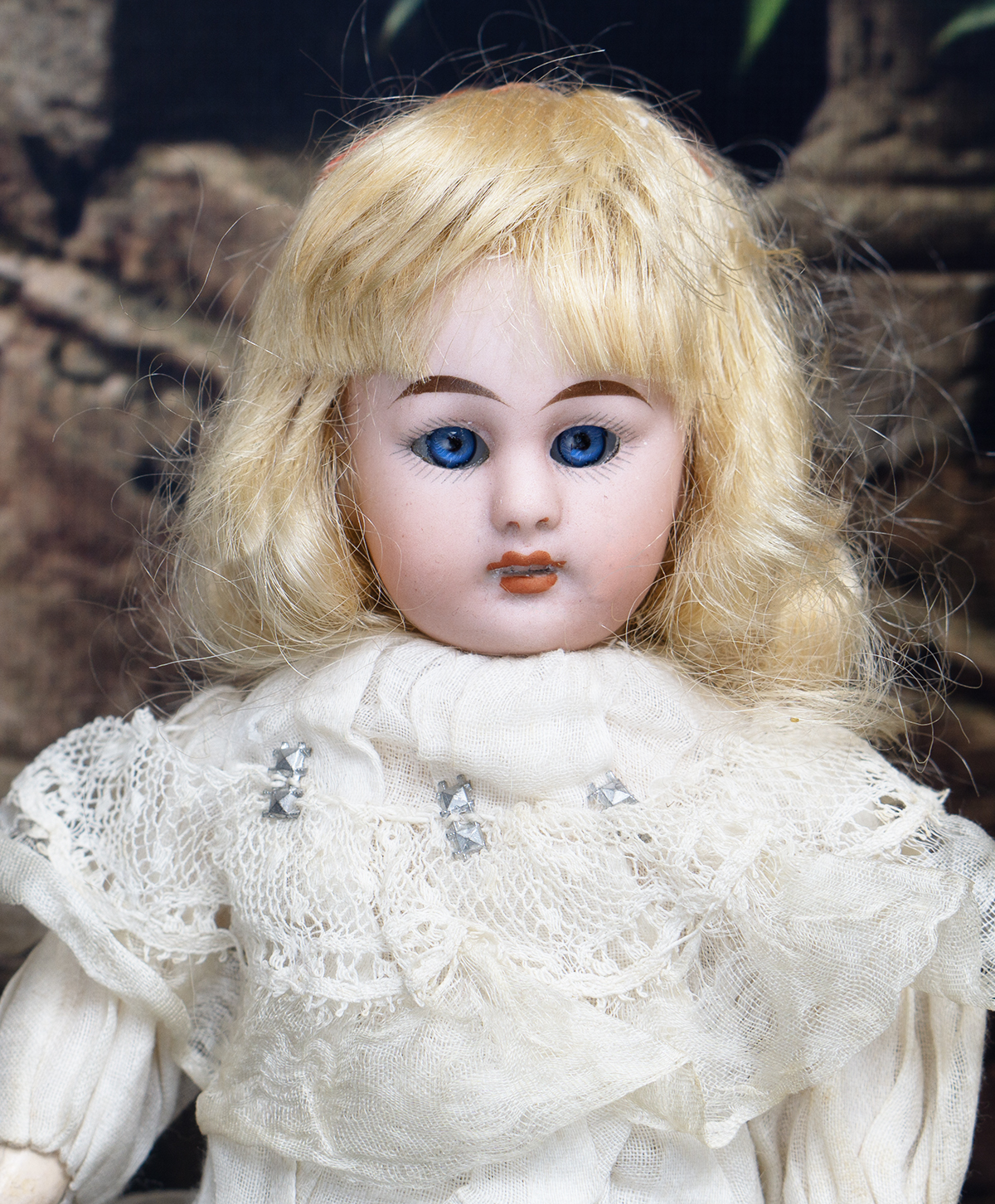 The bisque socket head doll has blue glass sleep eyes, painted lashes, brushstroked and feathered brows, accented nostrils and eye corners, open mouth with accented lips, four porcelain teeth, blonde mohair wig, original composition and wooden ball-jointed body.