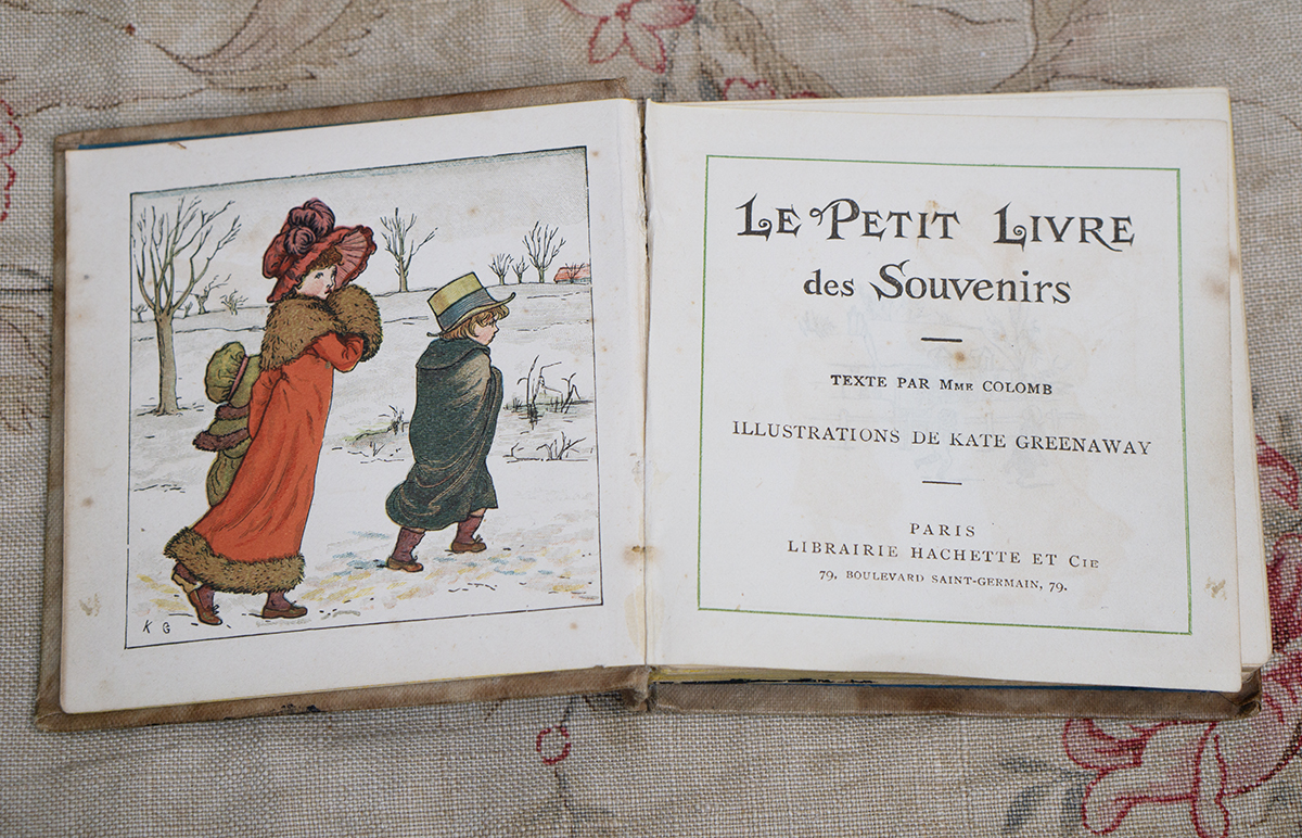 Written by Mmr.Colomb,translated into French from the original English,published by Libraire Hachette et Cie, Paris, 1870, the rare book LE PETIT LUVRE DES SOUVENIRS features 35 vignettes illustrations by Kate Greenaway,each featuring children, as well as little side sketches of flowers or accessories.