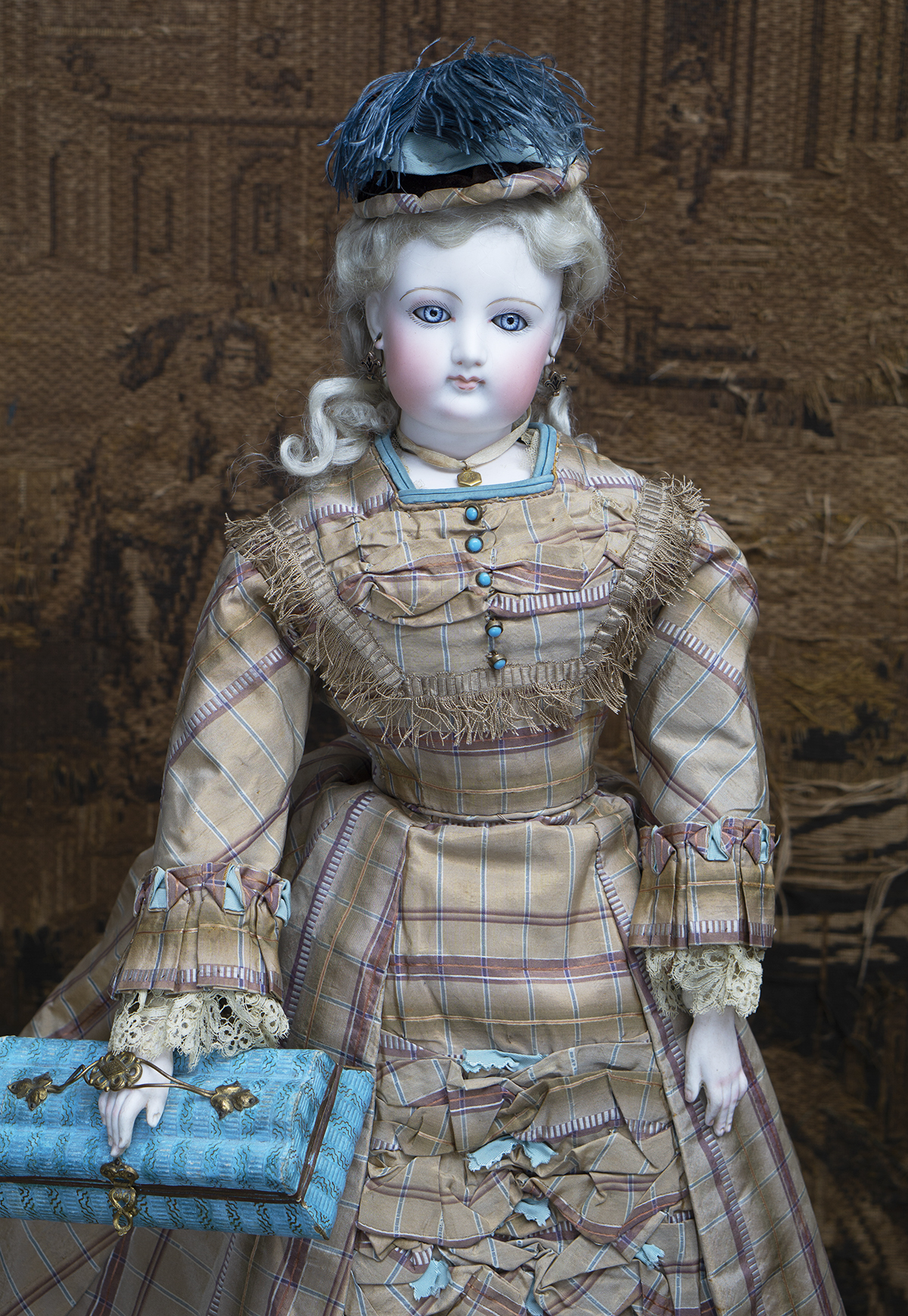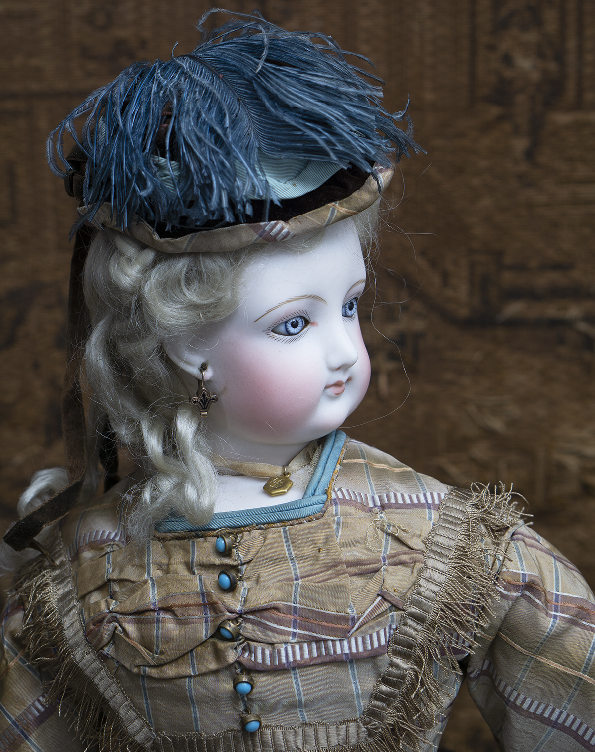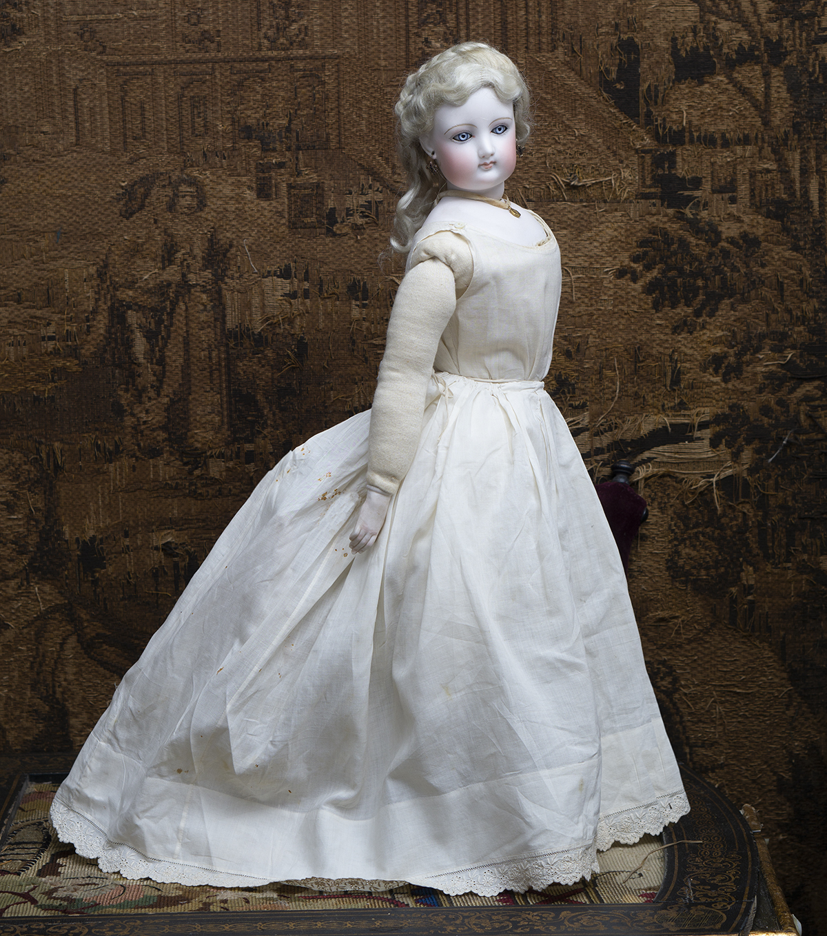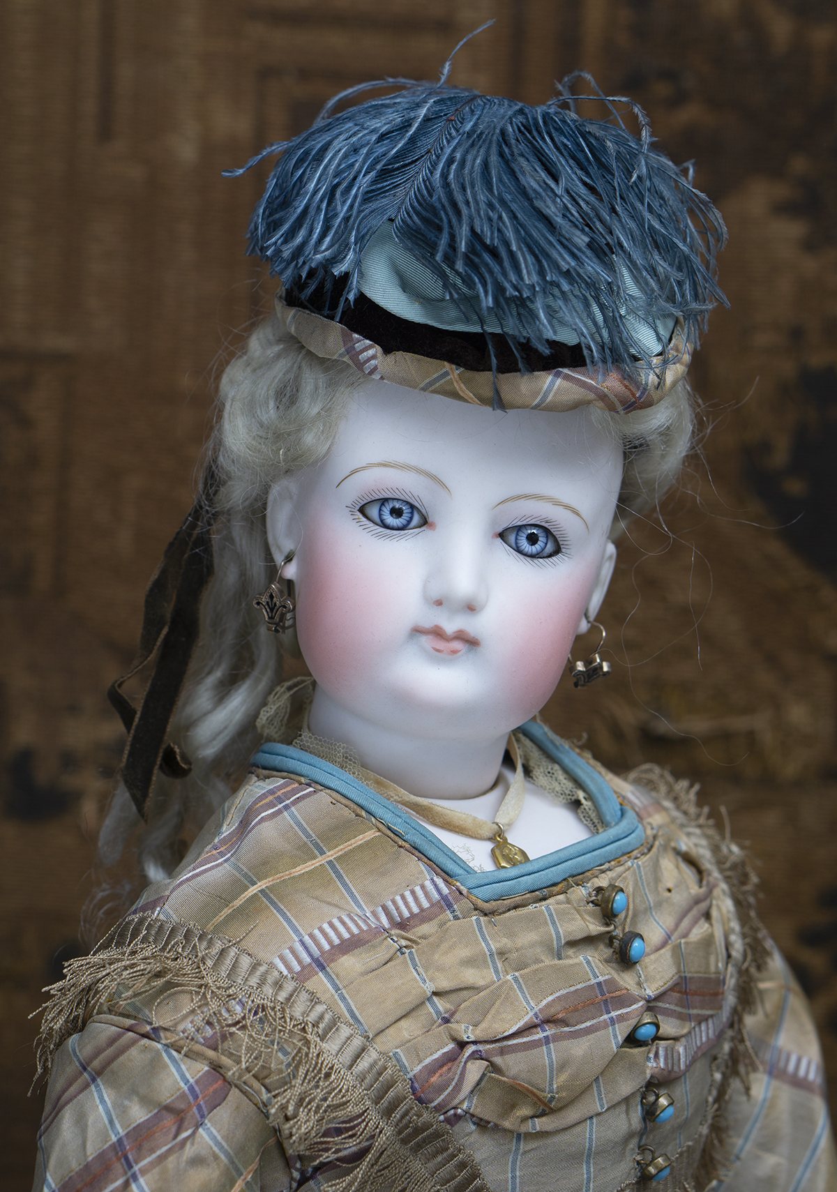 Bisque swivel head on kid-edged bisque shoulder plate, blue glass enamel inset eyes, dark eyeliner,painted lashes, feathered brows,accented nostrils and eye corners, closed mouth with outlined lips, pierced ears, wonderful original blonde mohair wig over cork pate,French metal armature body with padded stockinette cover allowing infinite articulation, bisque hands and bisque lower legs and feet.