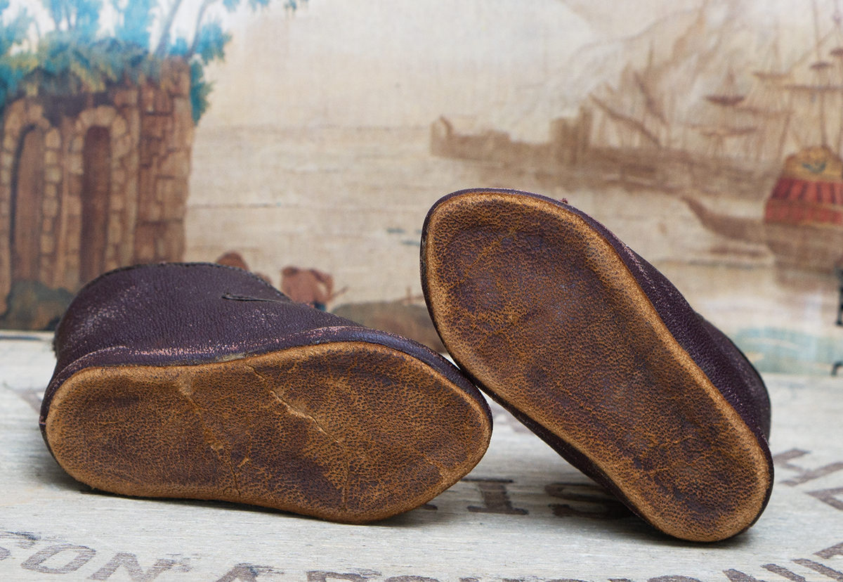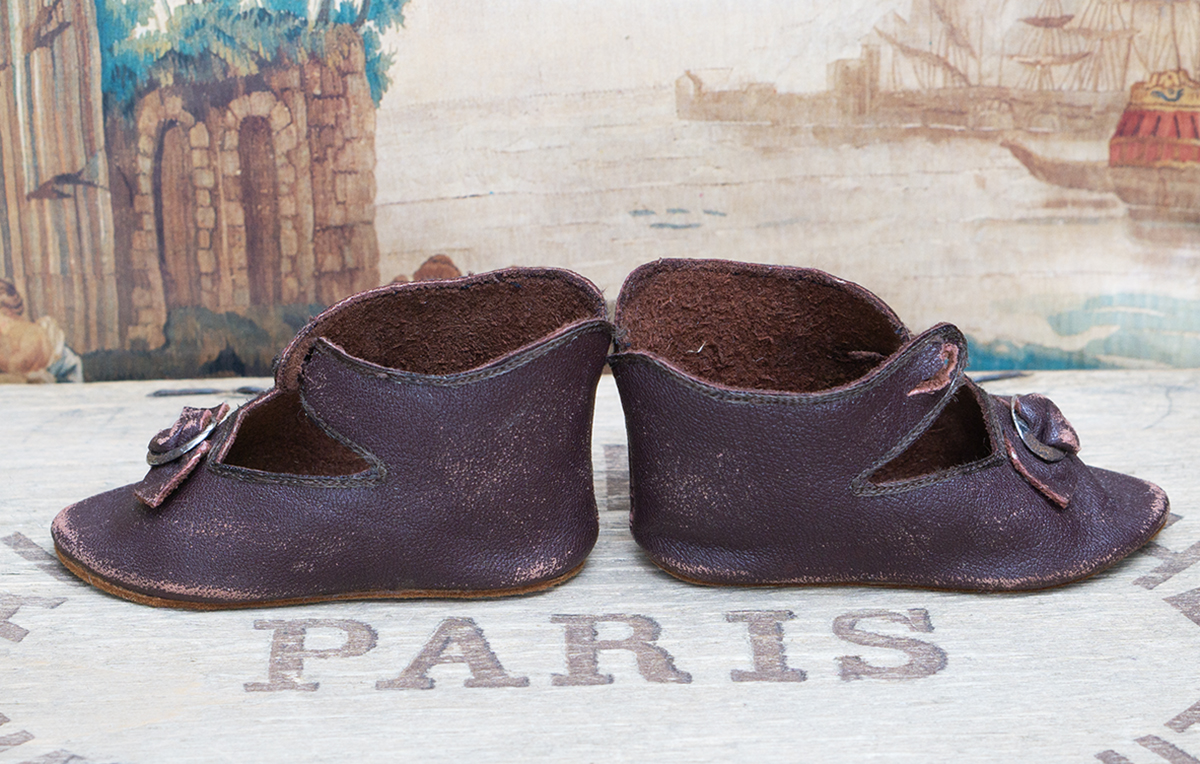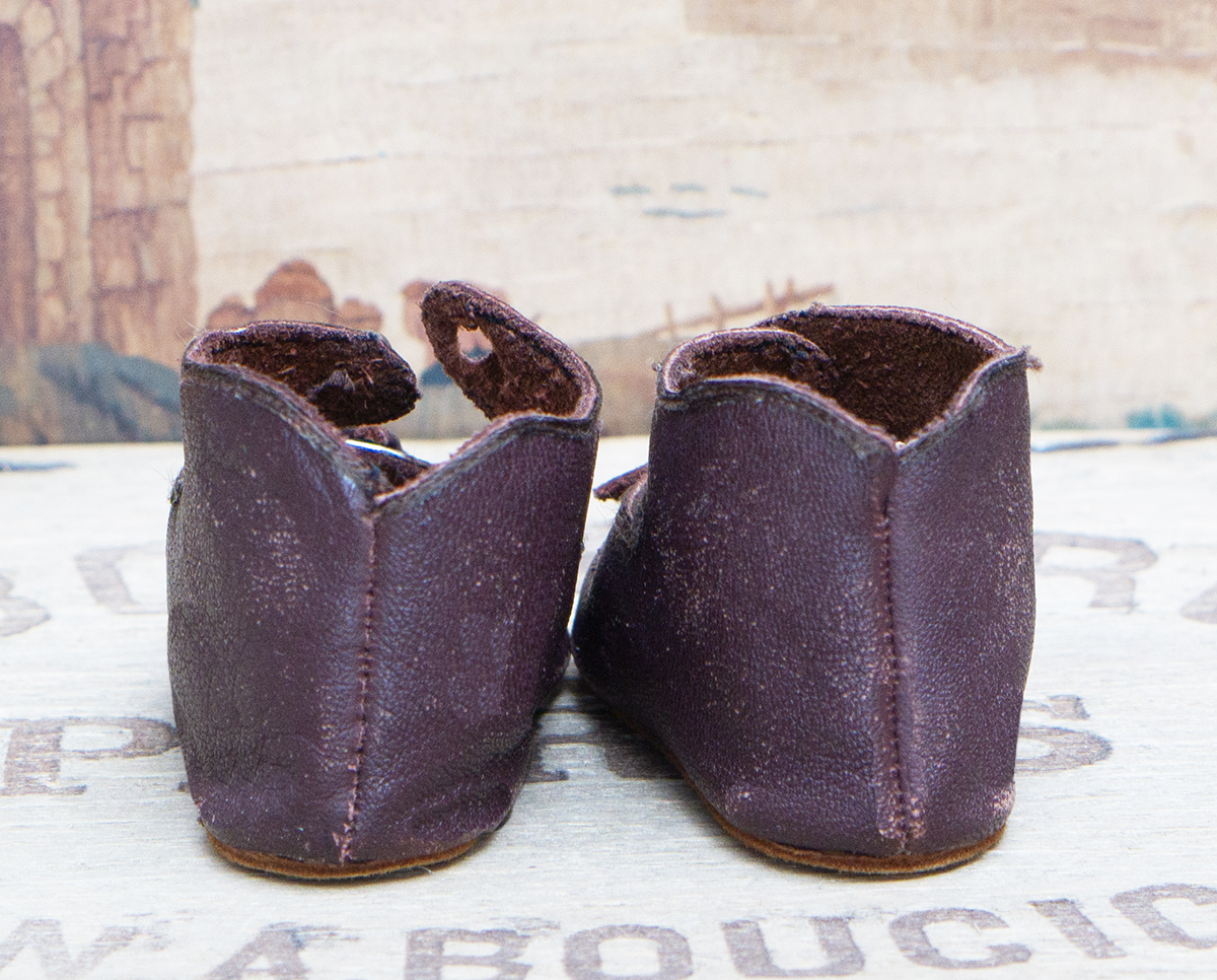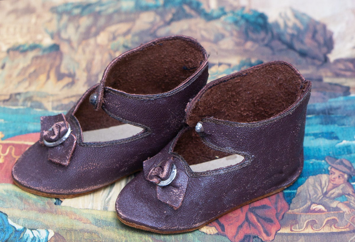 A very nice brown leather french doll shoes are in good condition to age. The toe decoration is original.