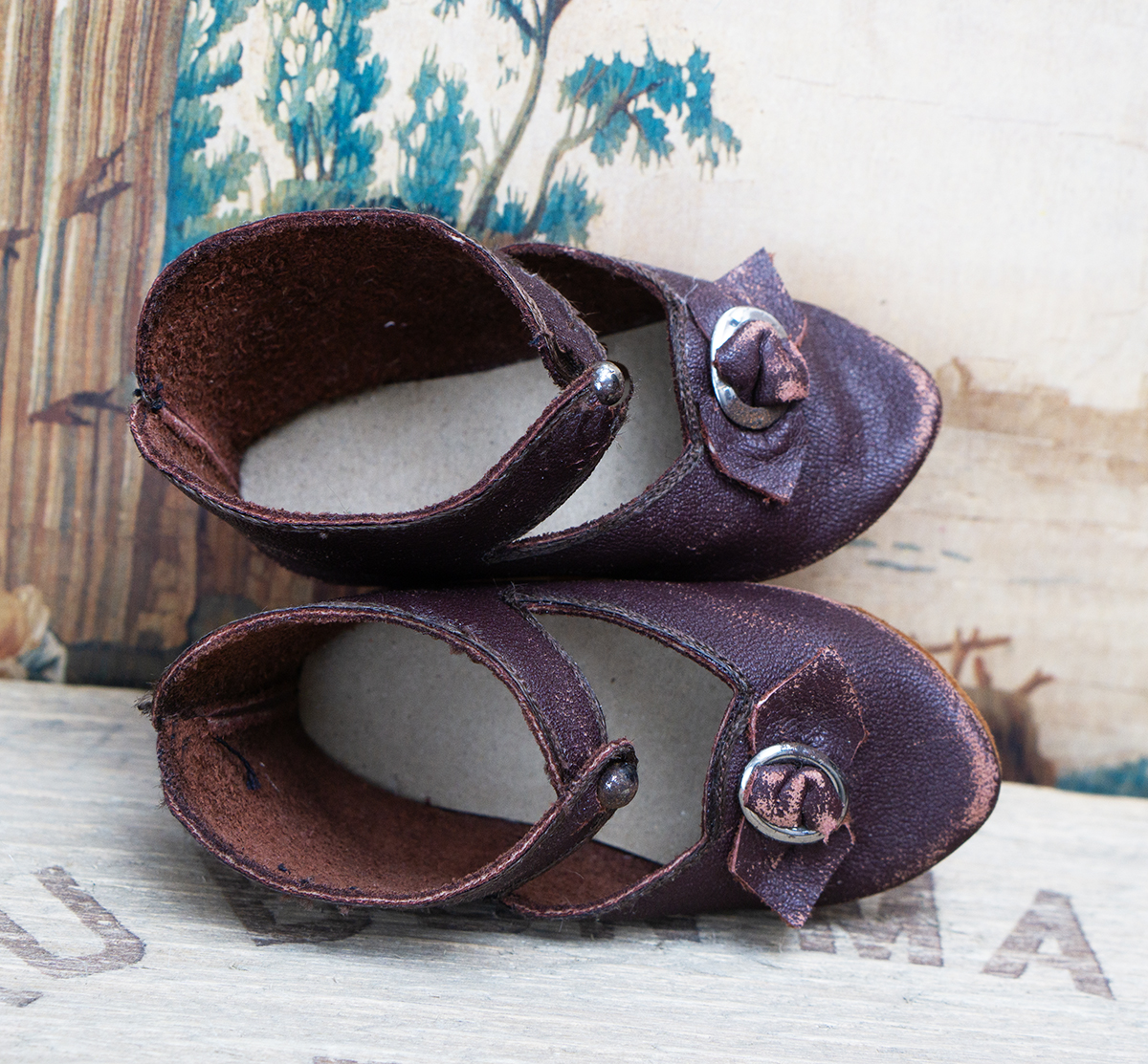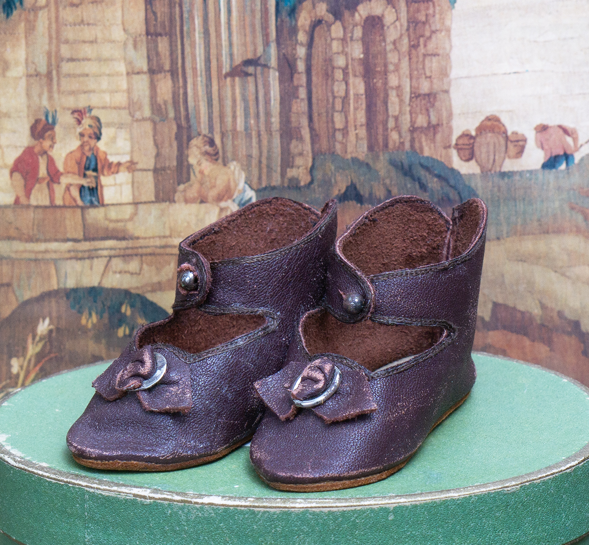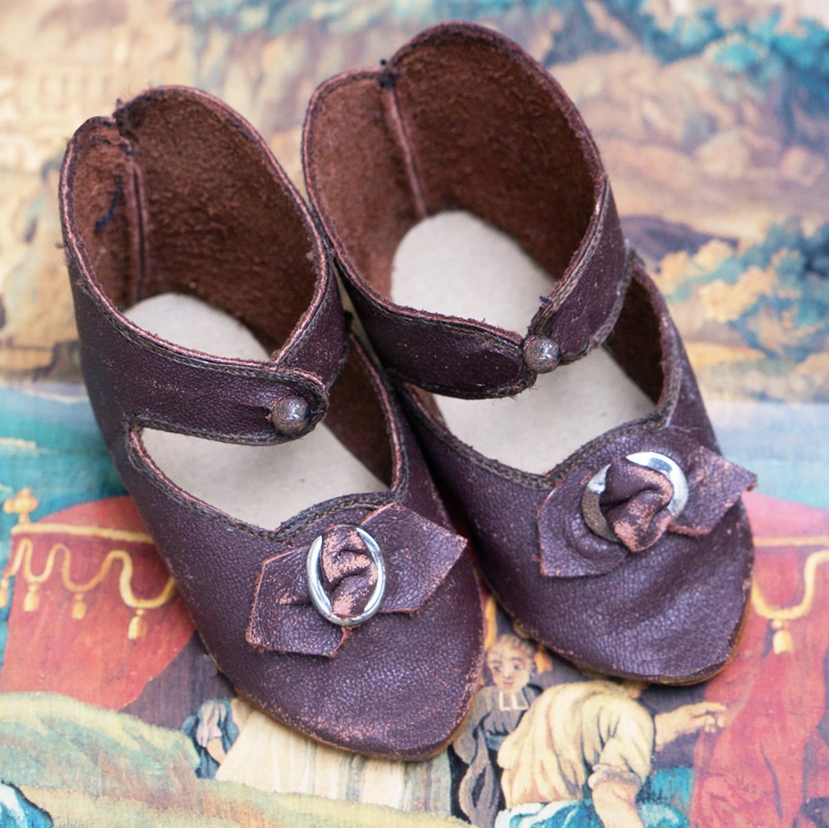 A very nice brown leather french doll shoes are in good condition to age. The toe decoration is original.
