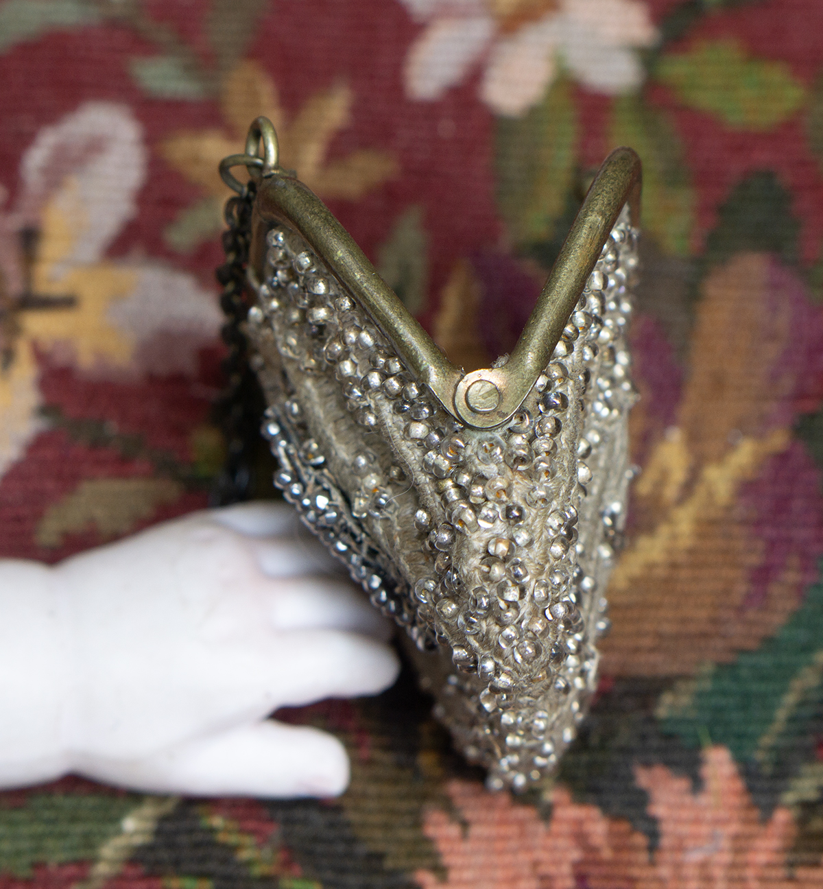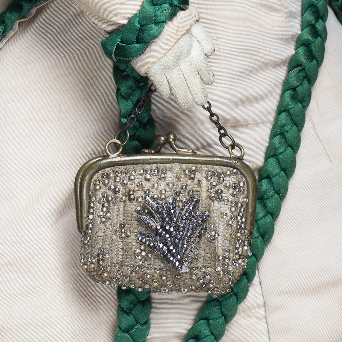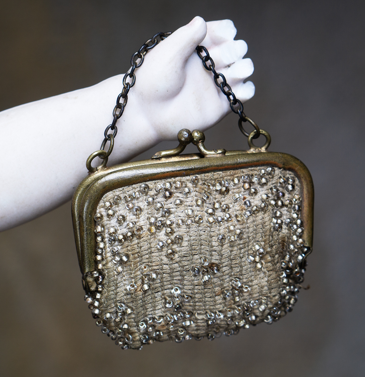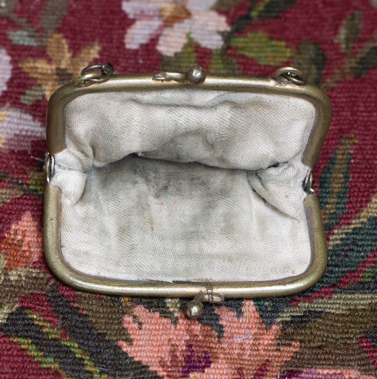 This wonderful original miniature silk purse with chine, opens and have fitted interiors in tan silk.