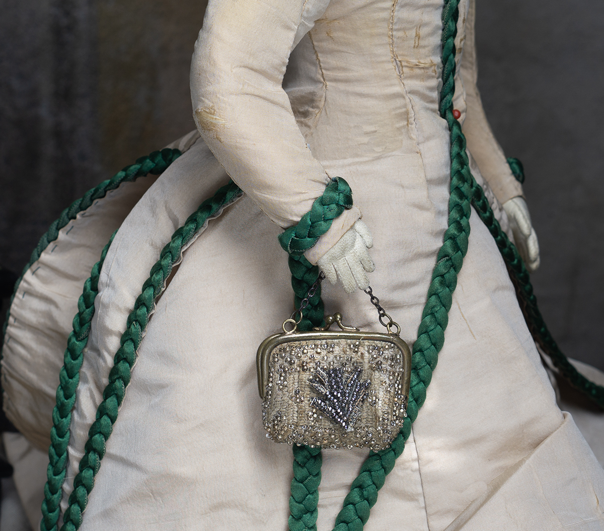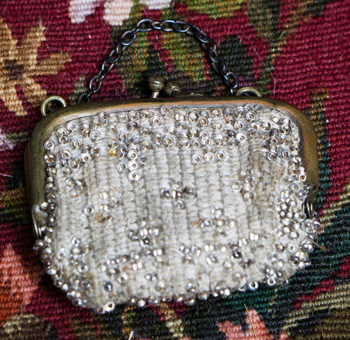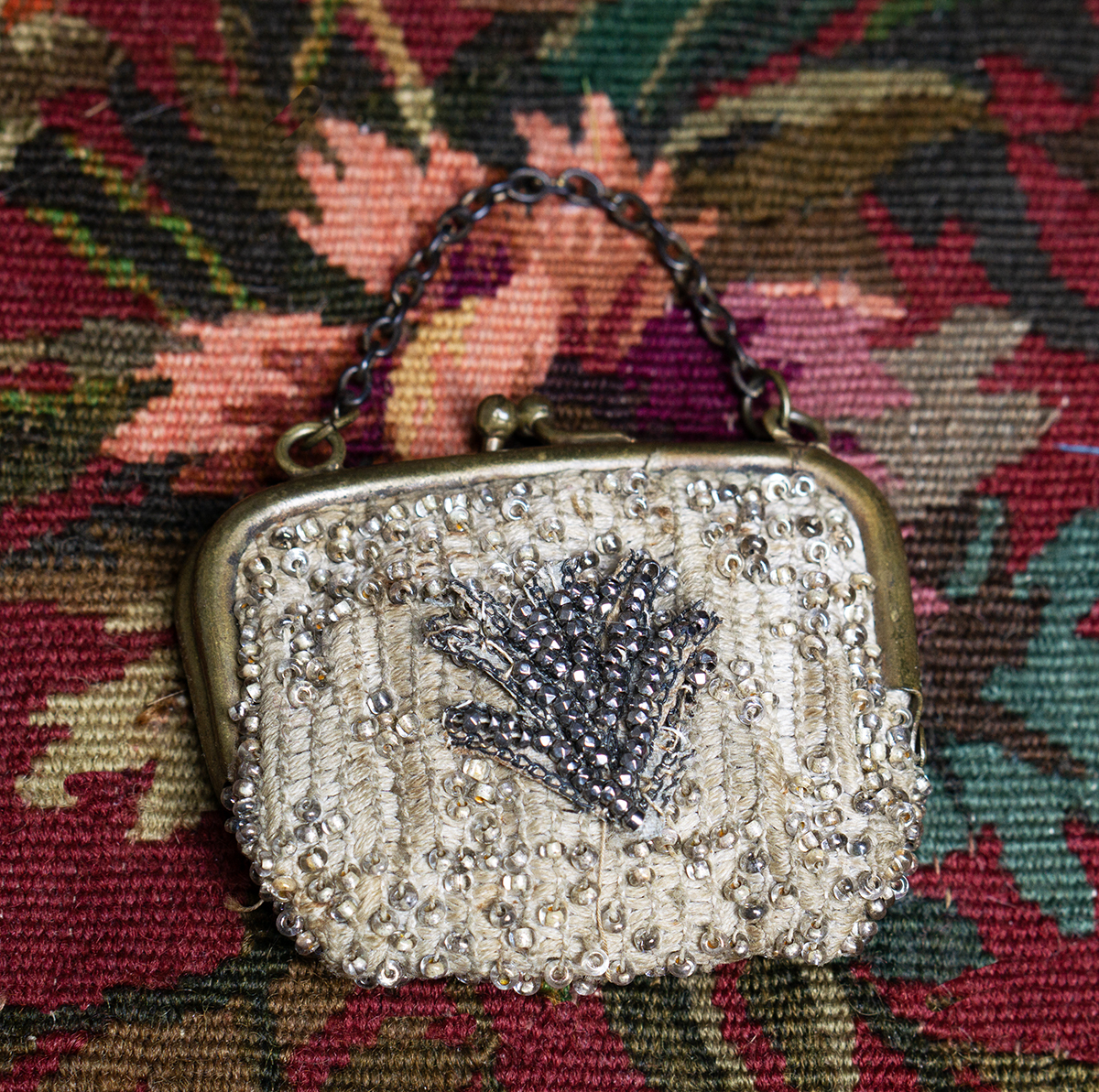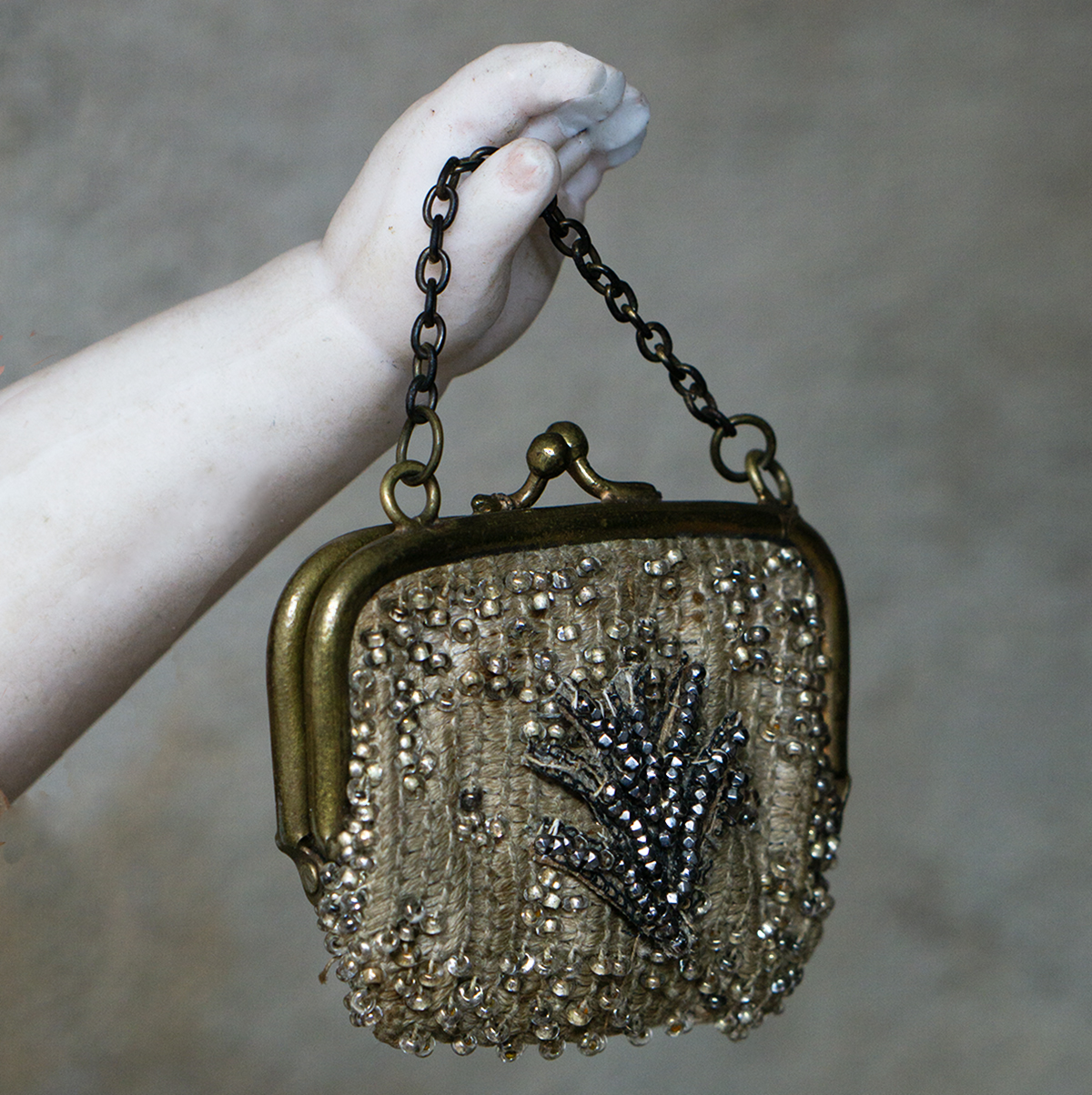 This wonderful original miniature silk purse with chine, opens and have fitted interiors in tan silk.