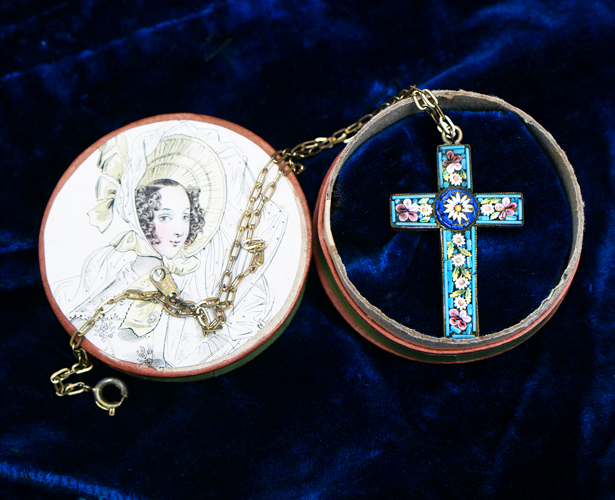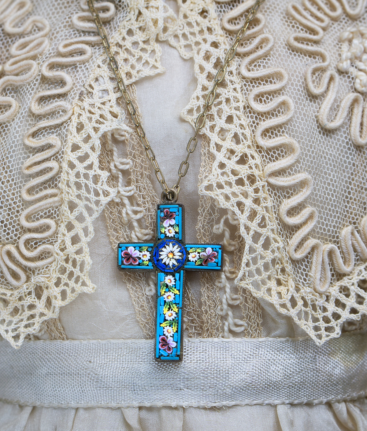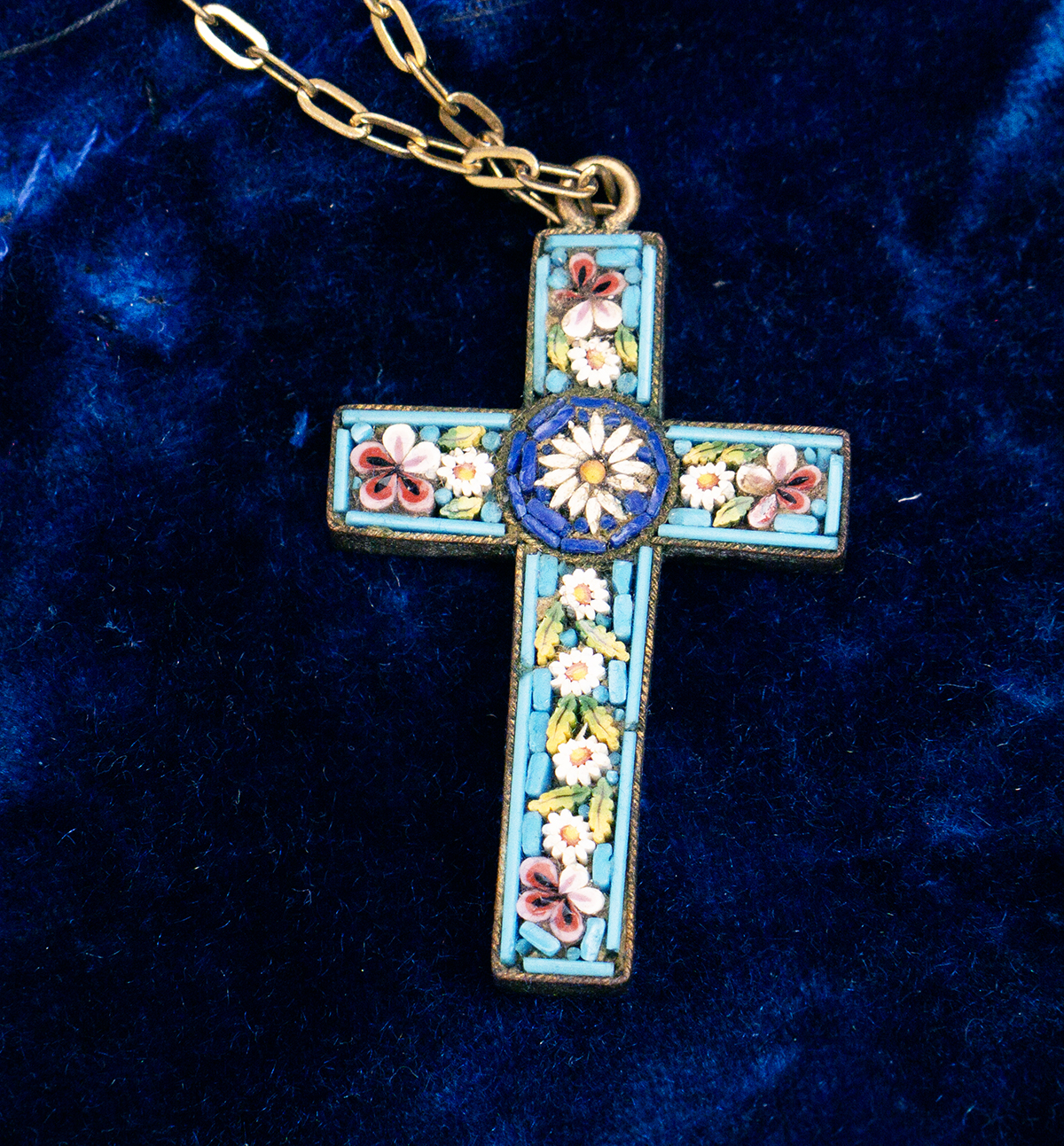Delicate antique micro mosaic cross pendant with its original glass tesserae in beautiful turquoise and blue tones. The front is densely set with tiny hand-cut glass pieces forming white daisies and small mauve flowers around a central round rosette. Mounted in a gold-tone metal frame together with a gold-tone chain.