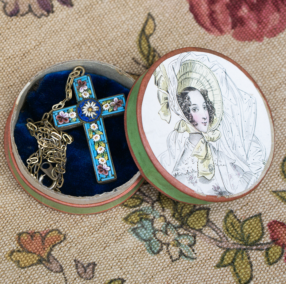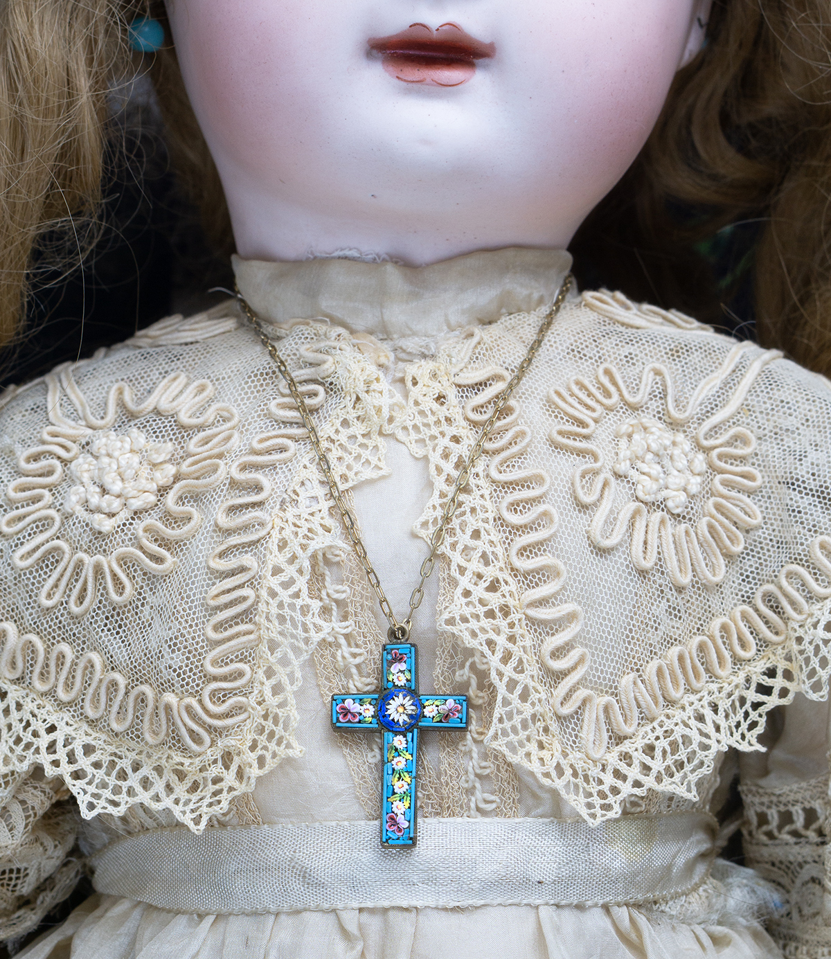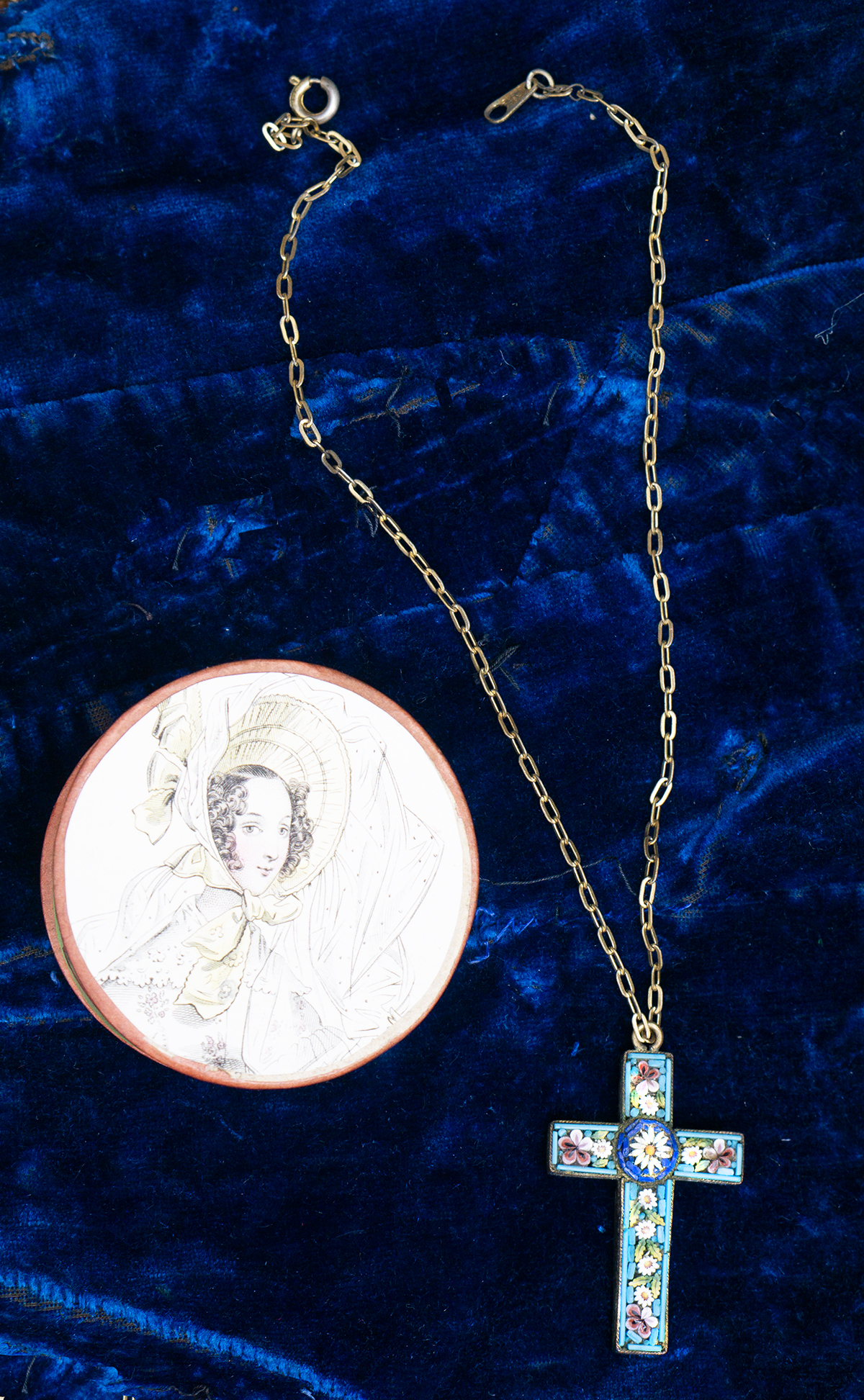 Delicate antique micro mosaic cross pendant with its original glass tesserae in beautiful turquoise and blue tones. The front is densely set with tiny hand-cut glass pieces forming white daisies and small mauve flowers around a central round rosette. Mounted in a gold-tone metal frame together with a gold-tone chain.