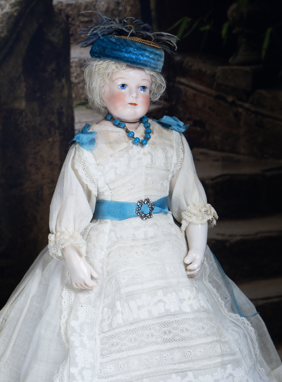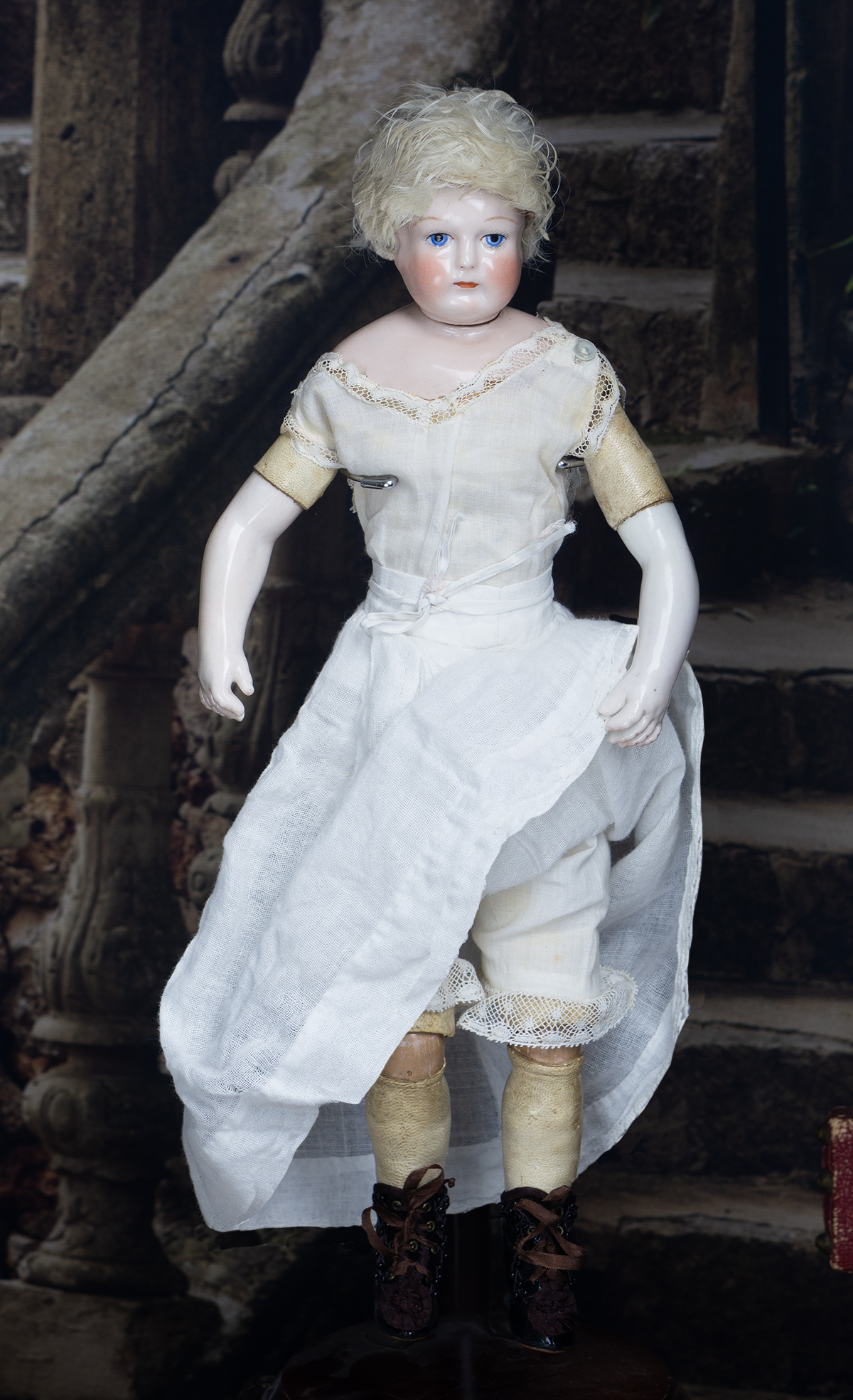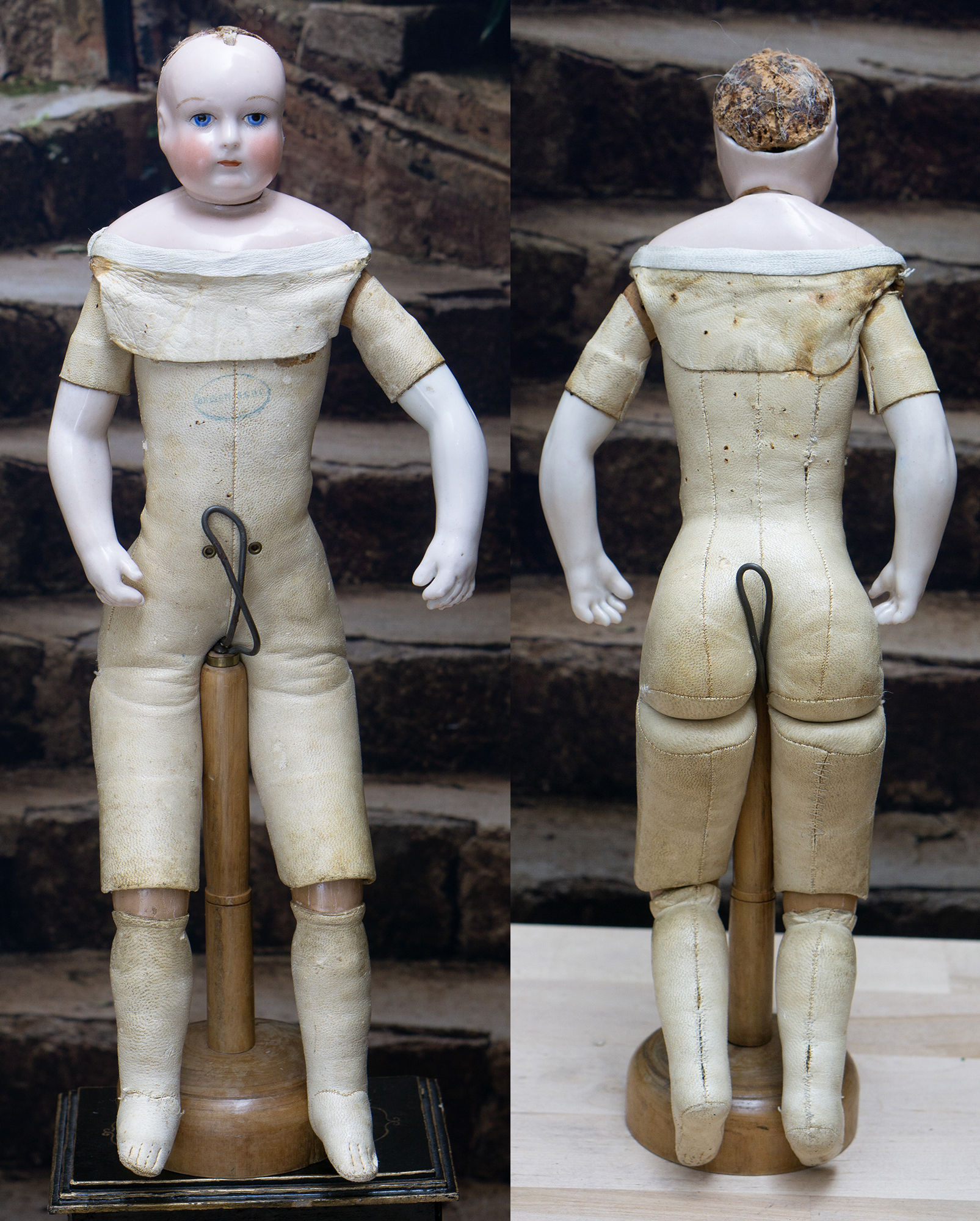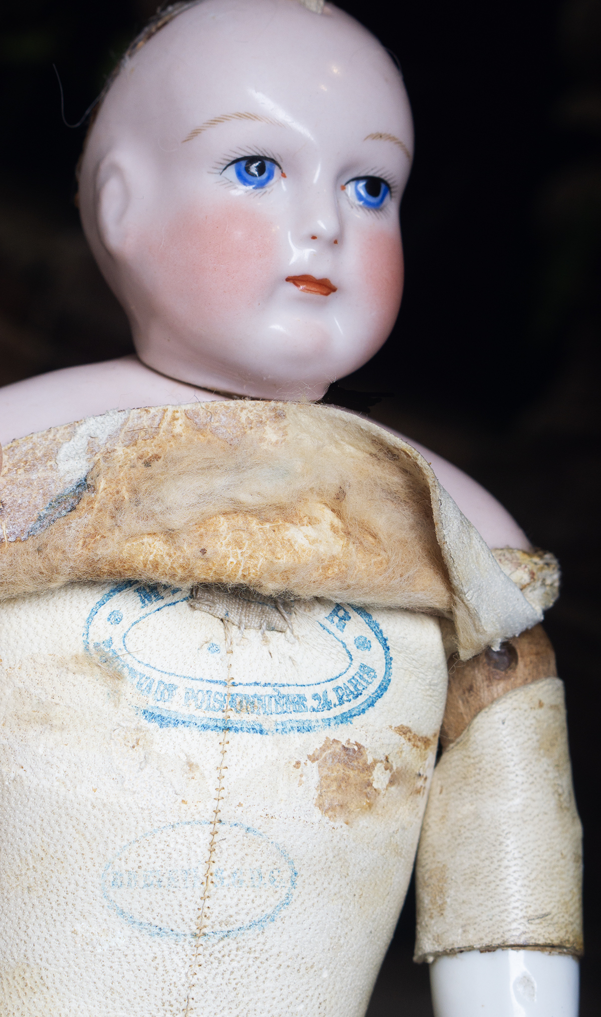 Porcelain swivel head with flat-cut neck socket on original porcelain shoulder plate, lightly-tinted complexion, blue upper glancing eyes with darker blue outer rims, black upper eyeliner, painted lashes, lightly feathered brows, accented nostrils, closed mouth with downcast pouty lips, lambswool wig over cork pate, softy-stuffed kid poupee body in the classic Rohmer manner with pull-strings in torso designed for seating pose (the cord is missing), kid-over-wooden upper arms, porcelain arms to above the elbows, wooden ball-joints in knees under kid cover.