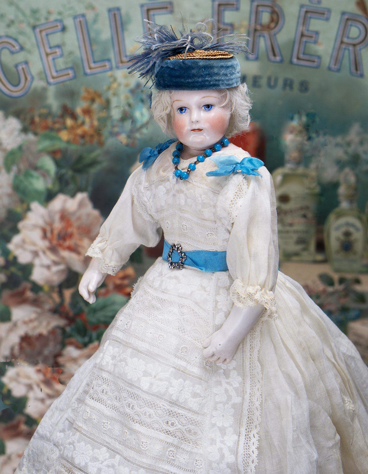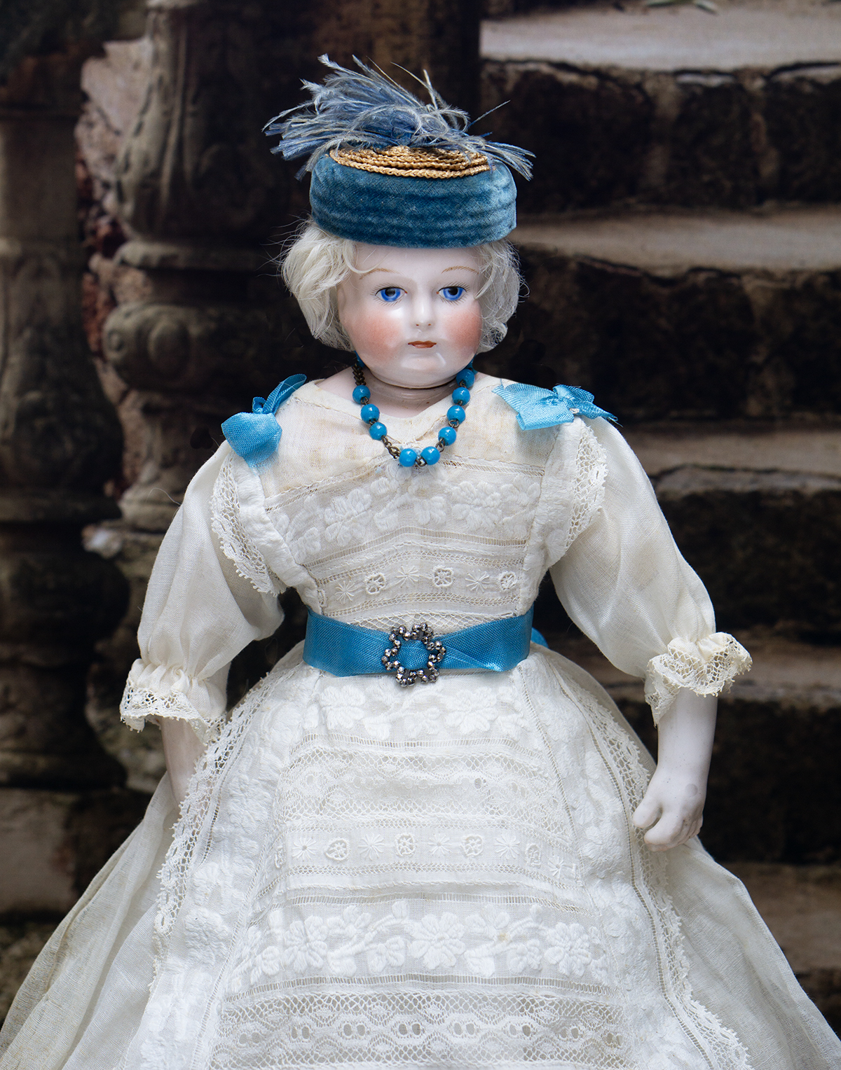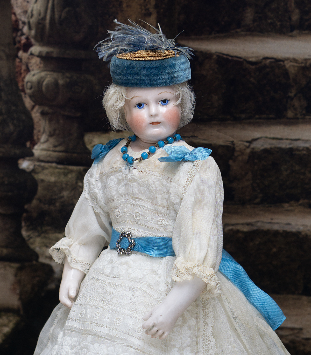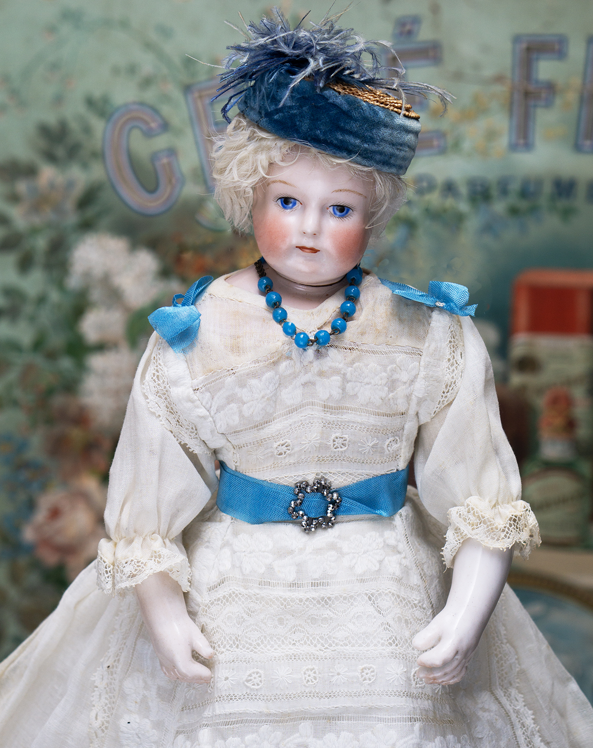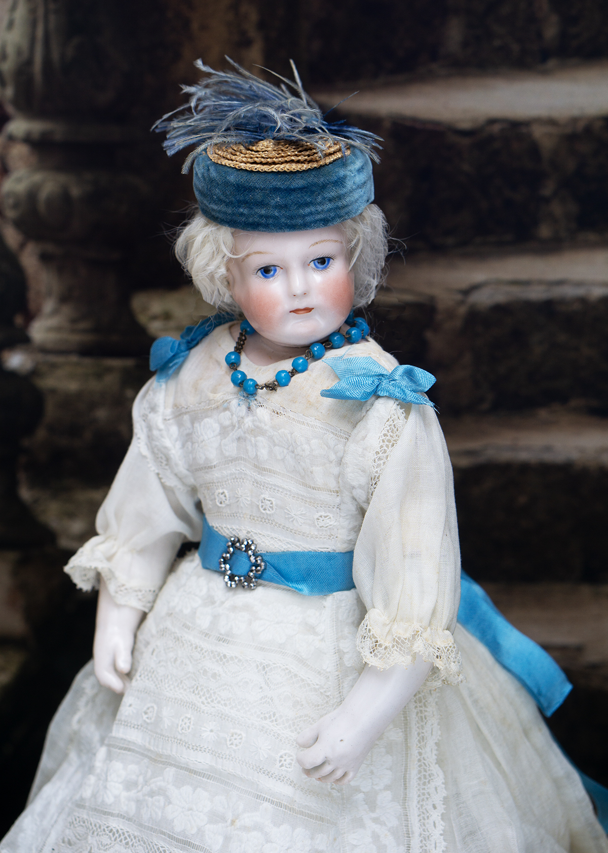 Porcelain swivel head with flat-cut neck socket on original porcelain shoulder plate, lightly-tinted complexion, blue upper glancing eyes with darker blue outer rims, black upper eyeliner, painted lashes, lightly feathered brows, accented nostrils, closed mouth with downcast pouty lips, lambswool wig over cork pate, softy-stuffed kid poupee body in the classic Rohmer manner with pull-strings in torso designed for seating pose (the cord is missing), kid-over-wooden upper arms, porcelain arms to above the elbows, wooden ball-joints in knees under kid cover.