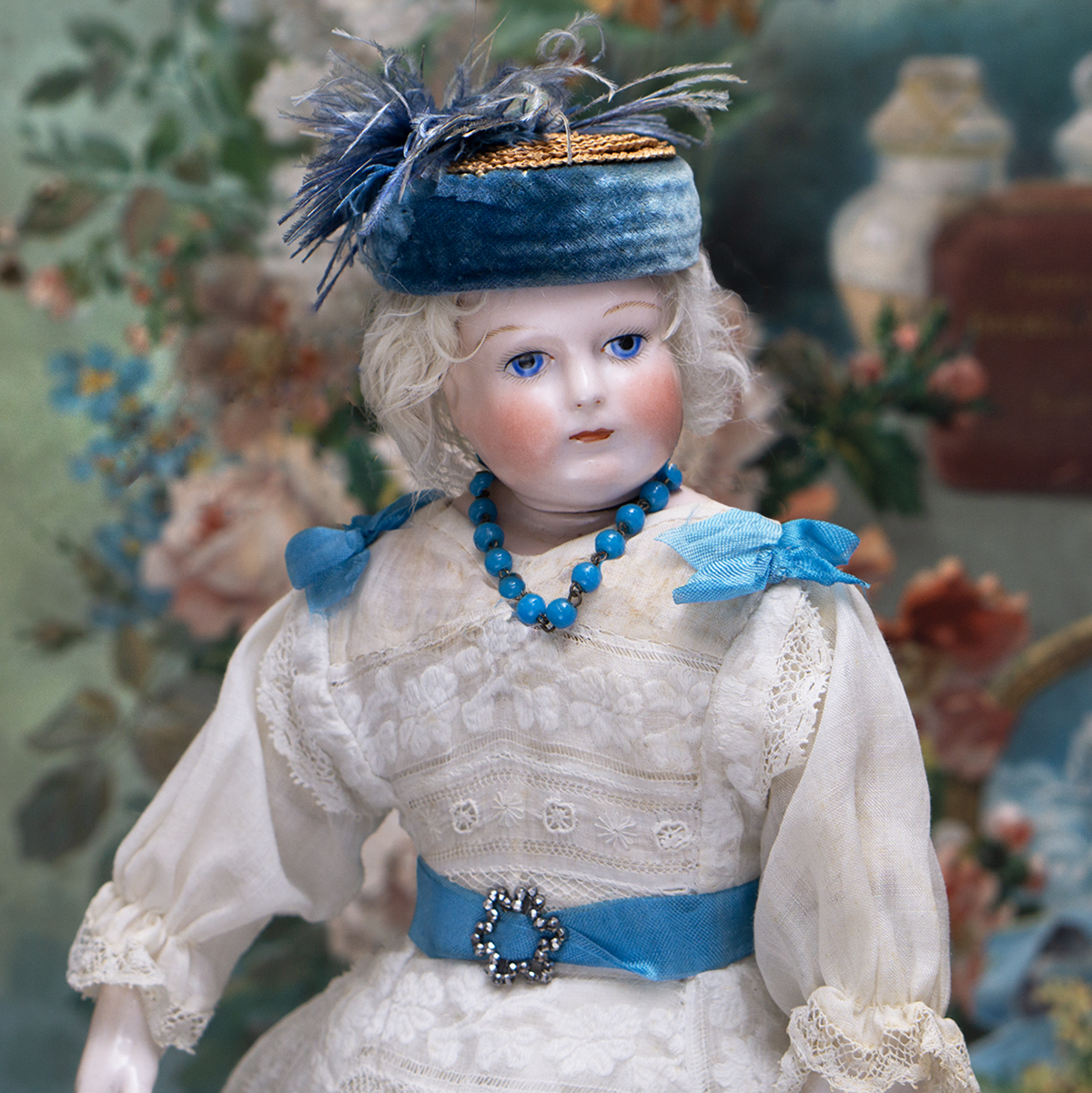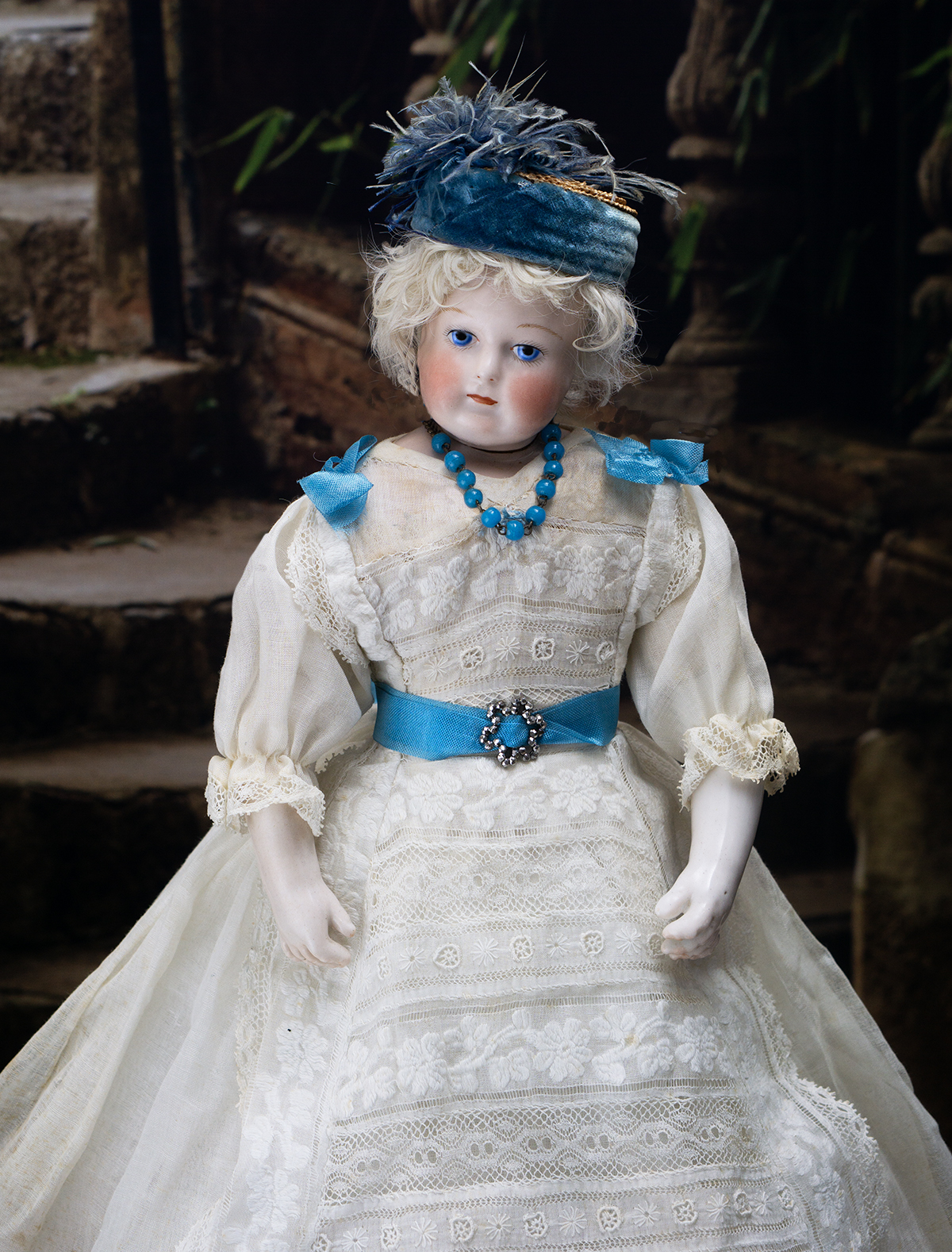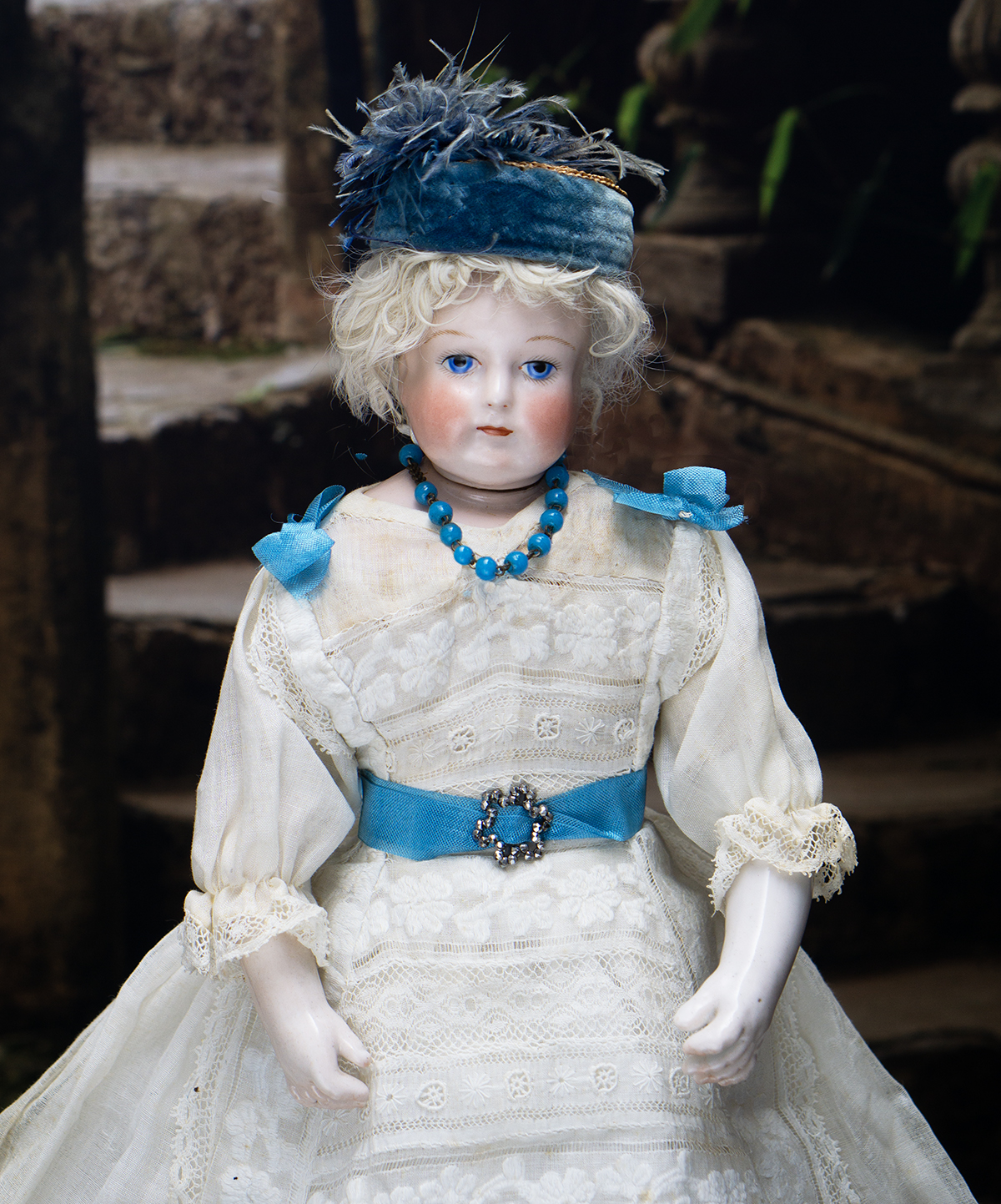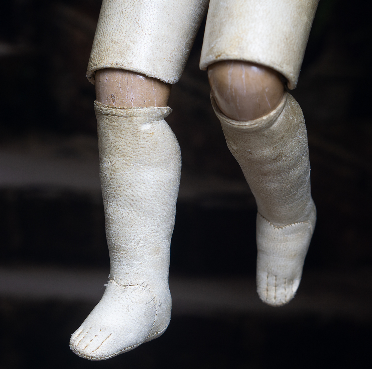 Porcelain swivel head with flat-cut neck socket on original porcelain shoulder plate, lightly-tinted complexion, blue upper glancing eyes with darker blue outer rims, black upper eyeliner, painted lashes, lightly feathered brows, accented nostrils, closed mouth with downcast pouty lips, lambswool wig over cork pate, softy-stuffed kid poupee body in the classic Rohmer manner with pull-strings in torso designed for seating pose (the cord is missing), kid-over-wooden upper arms, porcelain arms to above the elbows, wooden ball-joints in knees under kid cover.