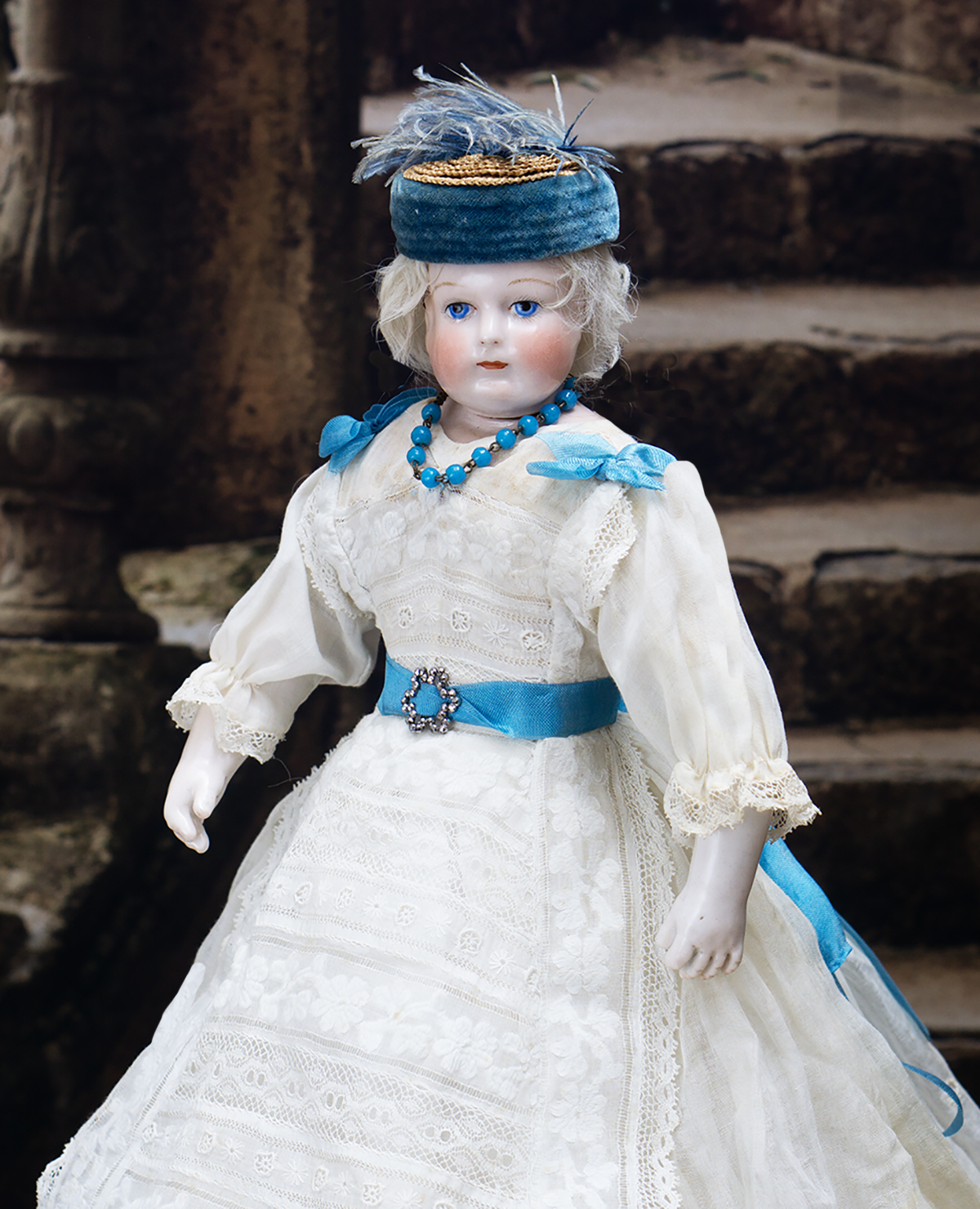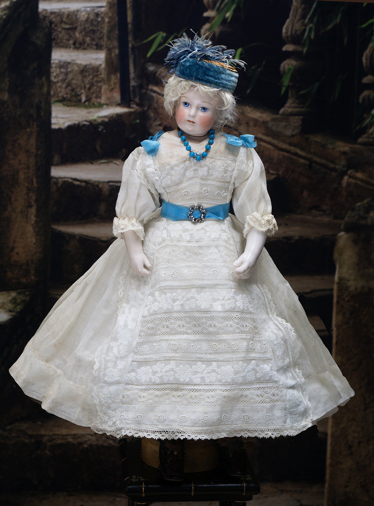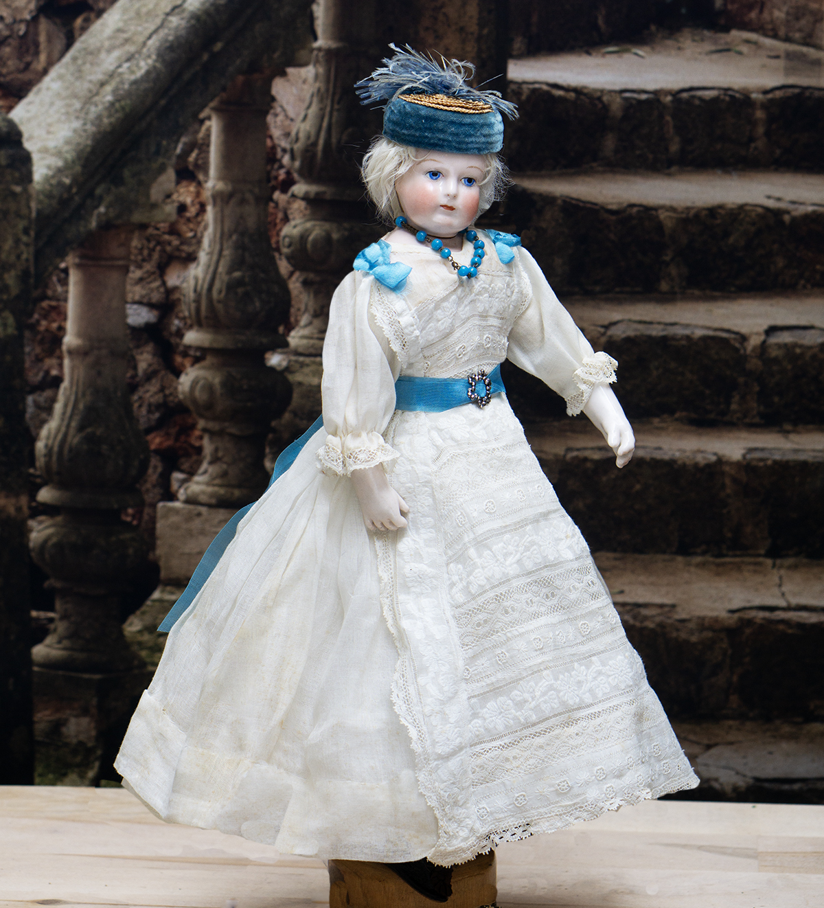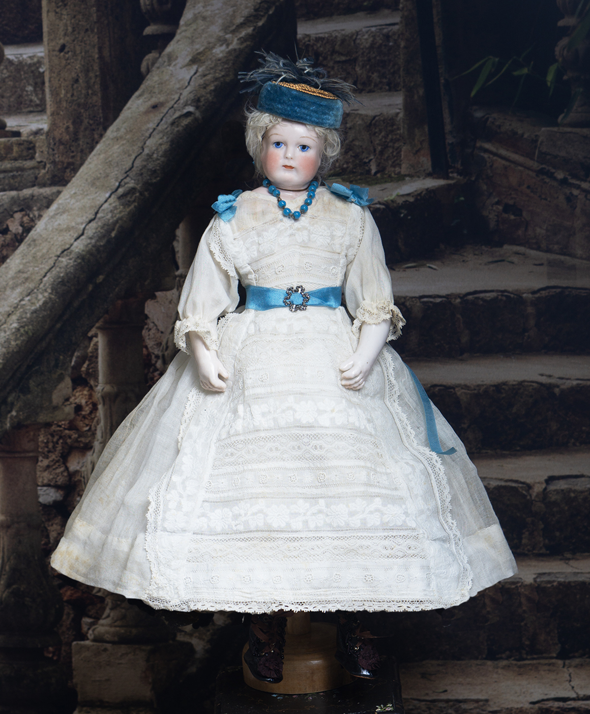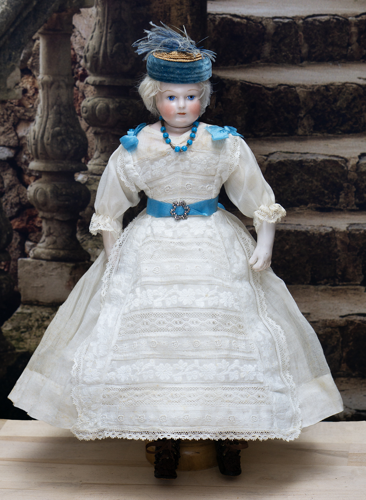 Porcelain swivel head with flat-cut neck socket on original porcelain shoulder plate, lightly-tinted complexion, blue upper glancing eyes with darker blue outer rims, black upper eyeliner, painted lashes, lightly feathered brows, accented nostrils, closed mouth with downcast pouty lips, lambswool wig over cork pate, softy-stuffed kid poupee body in the classic Rohmer manner with pull-strings in torso designed for seating pose (the cord is missing), kid-over-wooden upper arms, porcelain arms to above the elbows, wooden ball-joints in knees under kid cover.