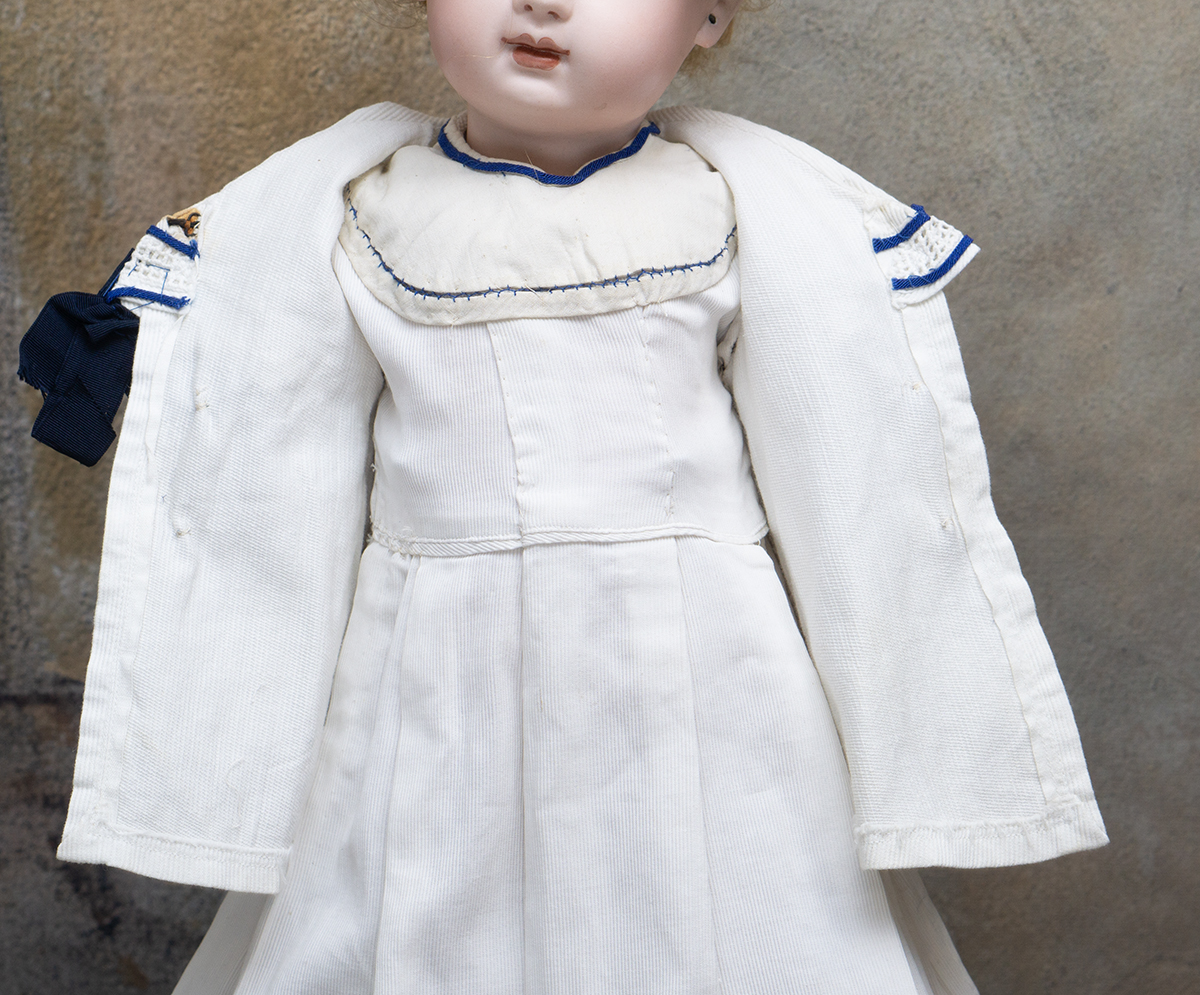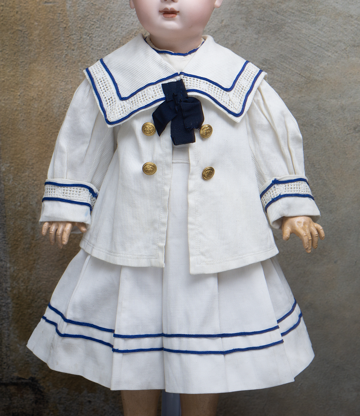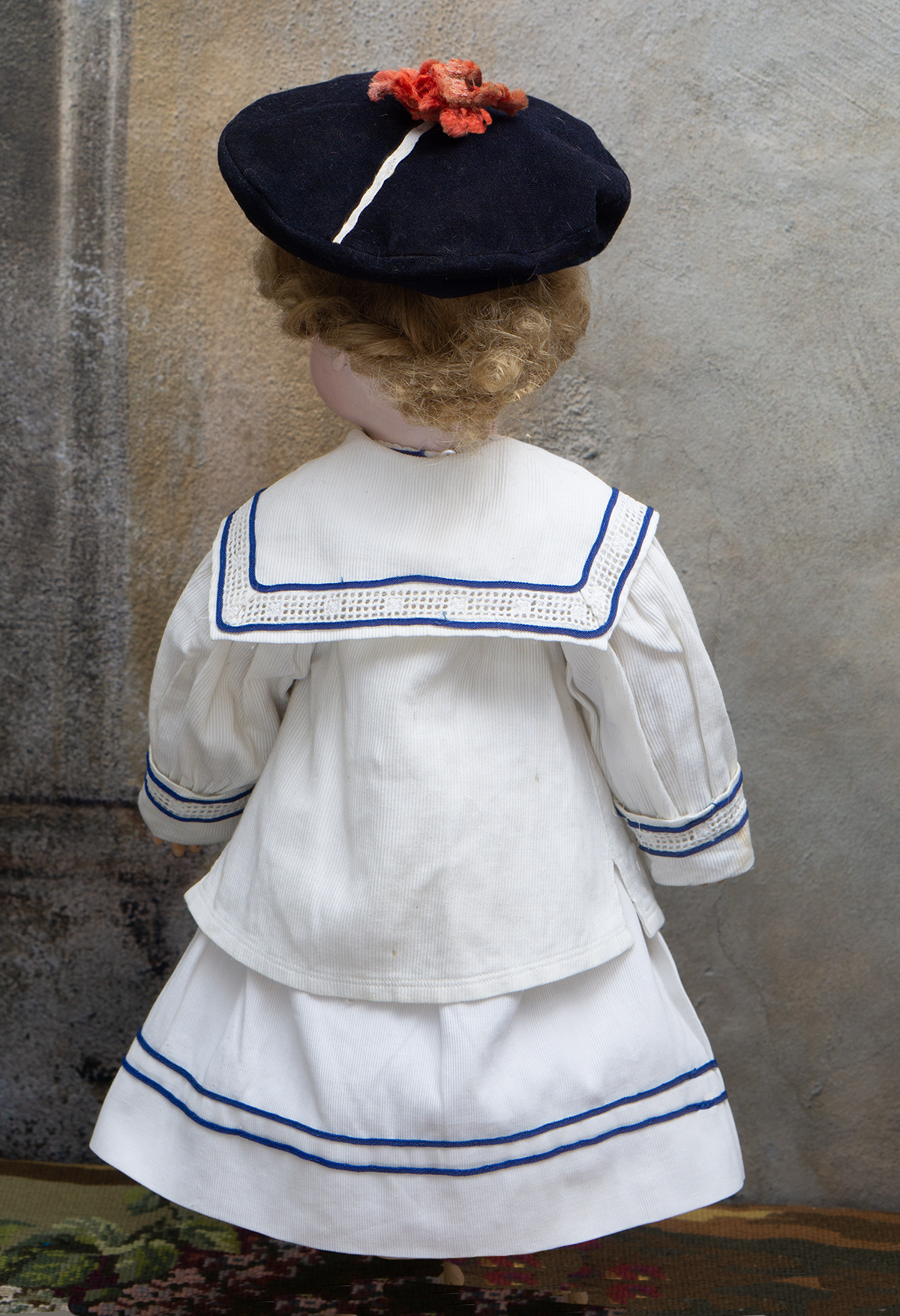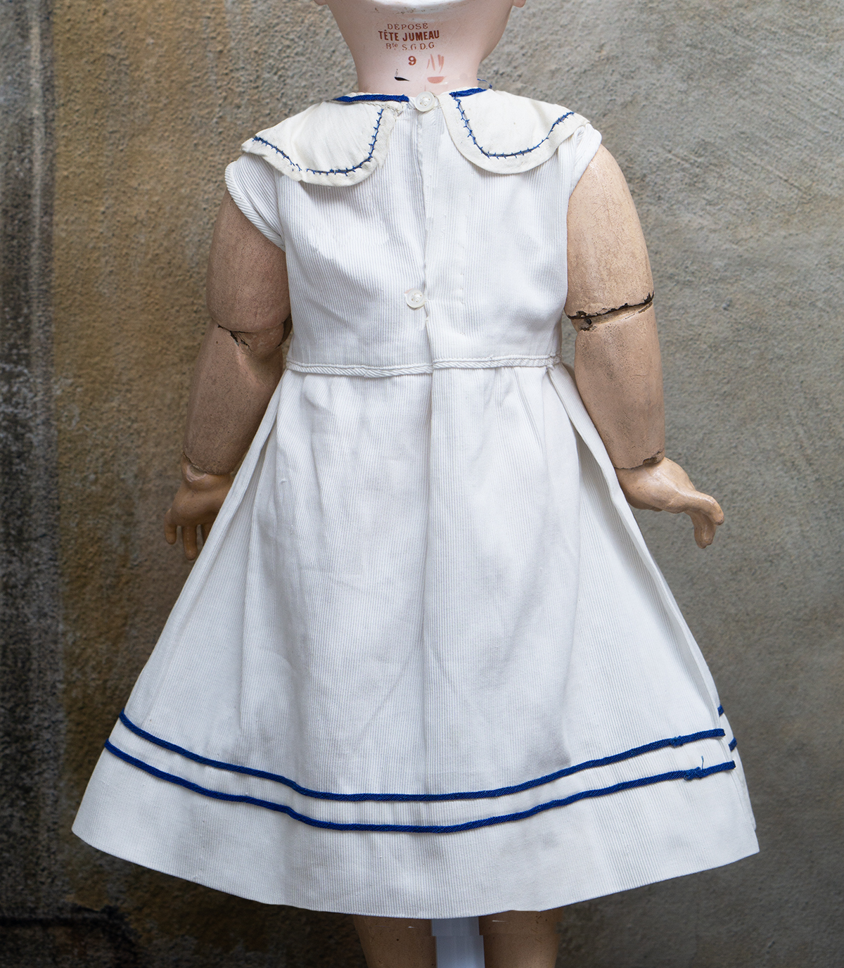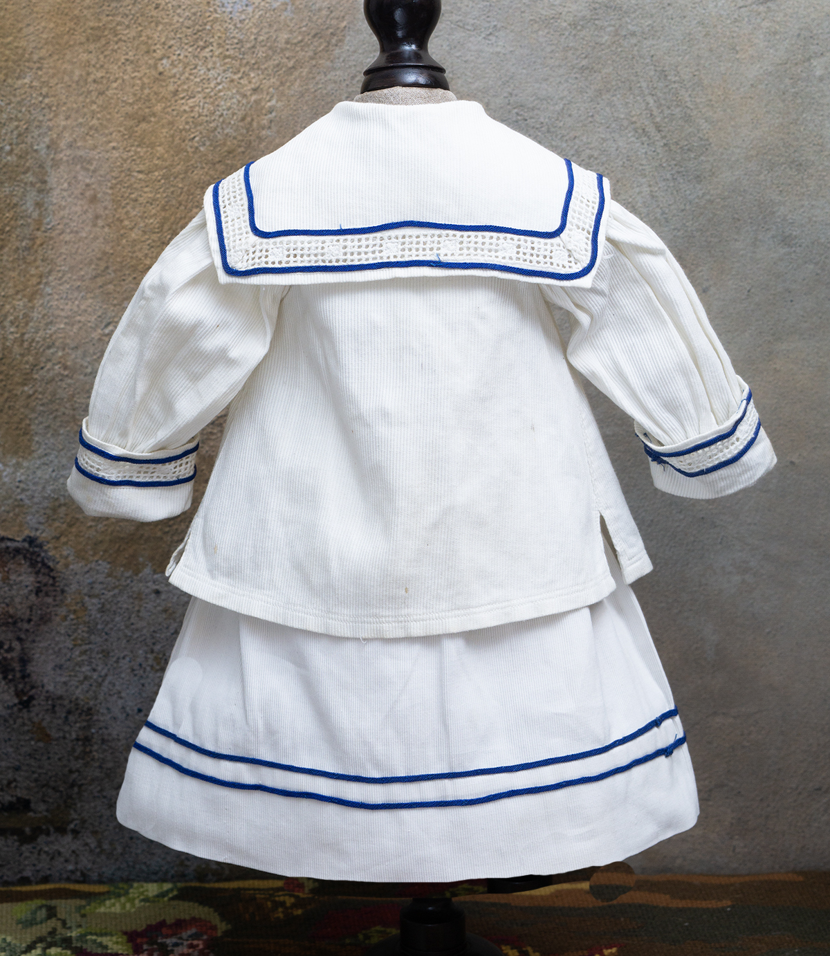 Very good condition to age. French, circa 1890. Fit for french bebe doll about 20-21" (50-53cm) Measures The jacket 8 1/2" (22cm) length, 6" (16cm) shoulders, 6" (16cm) sleeve. the dress 13" (34cm) length, 12 1/2" (32cm) waist, 6 1/2" (17cm) shoulders. The cap 4 1/2" (12cm) wide inside and 14" (36cm) circumference. International shipping cost by UPS $55.00 ------------------------------------ I DO A LAYAWAY NO STATE SALES TAX! Thanks for your visit to Respectfulbear doll shop!