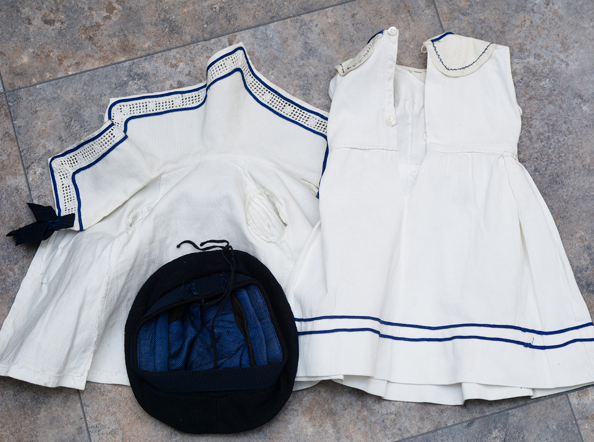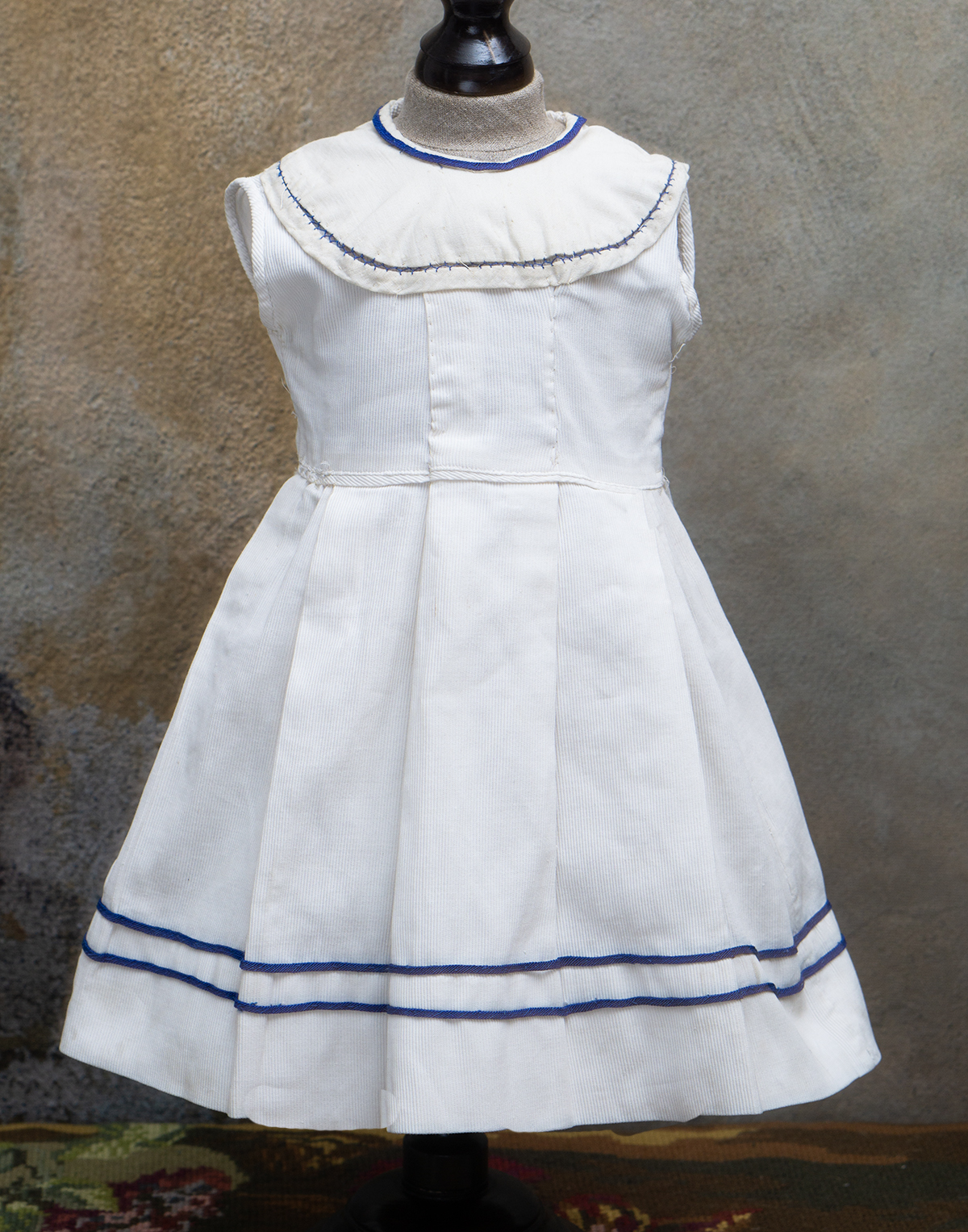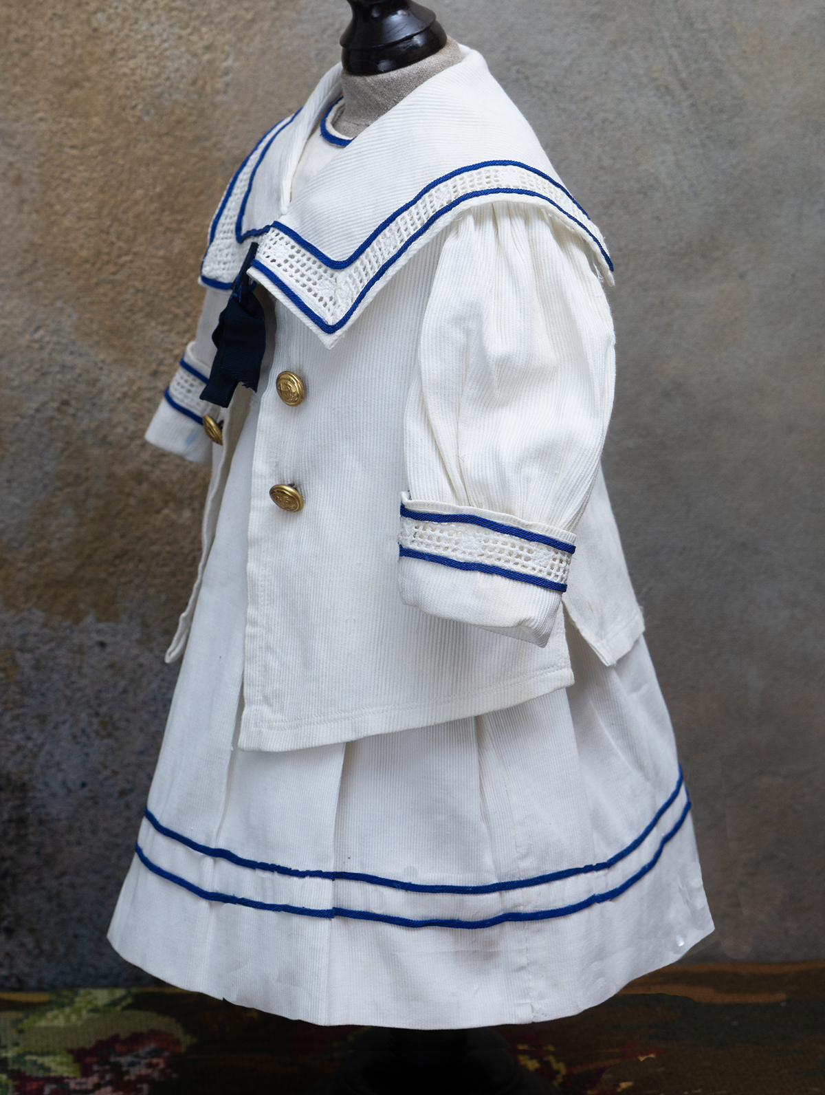 Of vertically banded white pique, the three piece ensemble comprising sleeveless dress with pleated skirt, original woolen hat with blue silk lining, middle jacket with a very full sleeves captured into fitted cuffs, flap-front bodice with brass buttons, wide sailor collar with blue tie.