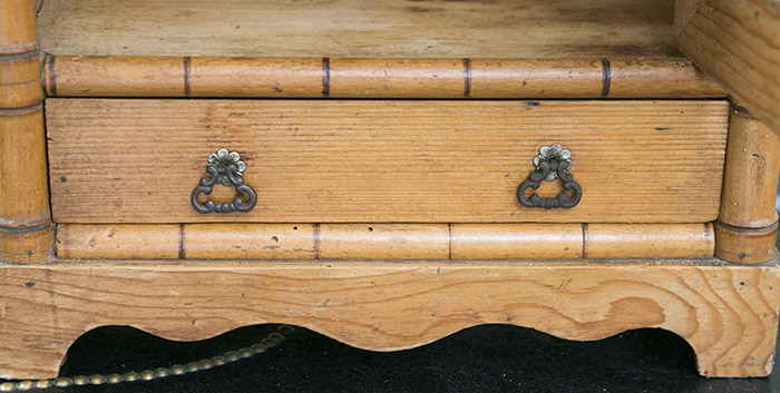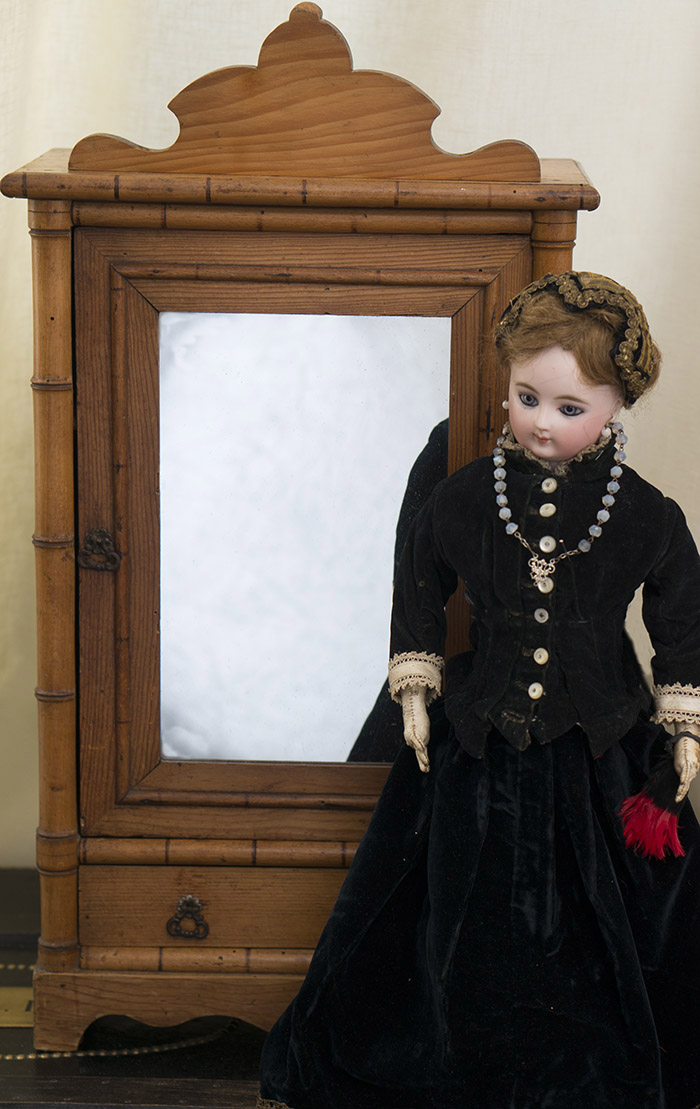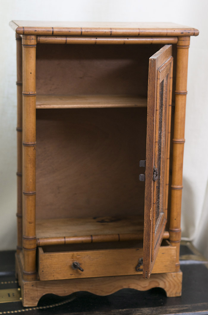 Very nice a French faux bamboo piece for your e fashions or doll or bebes. This classic Armoire features a mirrored door that swings opens to reveal an interior with one shelf, plus do not miss the handy drawer found below. Circa 1900-1920, freshly waxed, in good condition overall, and showing evidence of scattered worming that is found on most imported French faux bamboo.