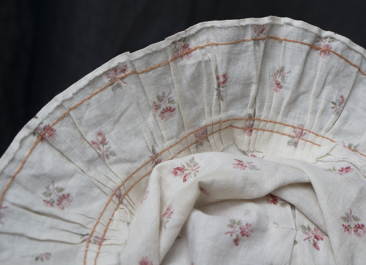 Of white muslin printed with signature design of red wildflowers, the dress features a pleated yoke with matching bretelles that extend over puffed sleeves, with generous lace edging at yoke, neckline, bretelles and sleeves. Box pleats fall from the yoke giving fullness to the dress and a border of ruffled fabric. The dress has self-sash with red silk trim.