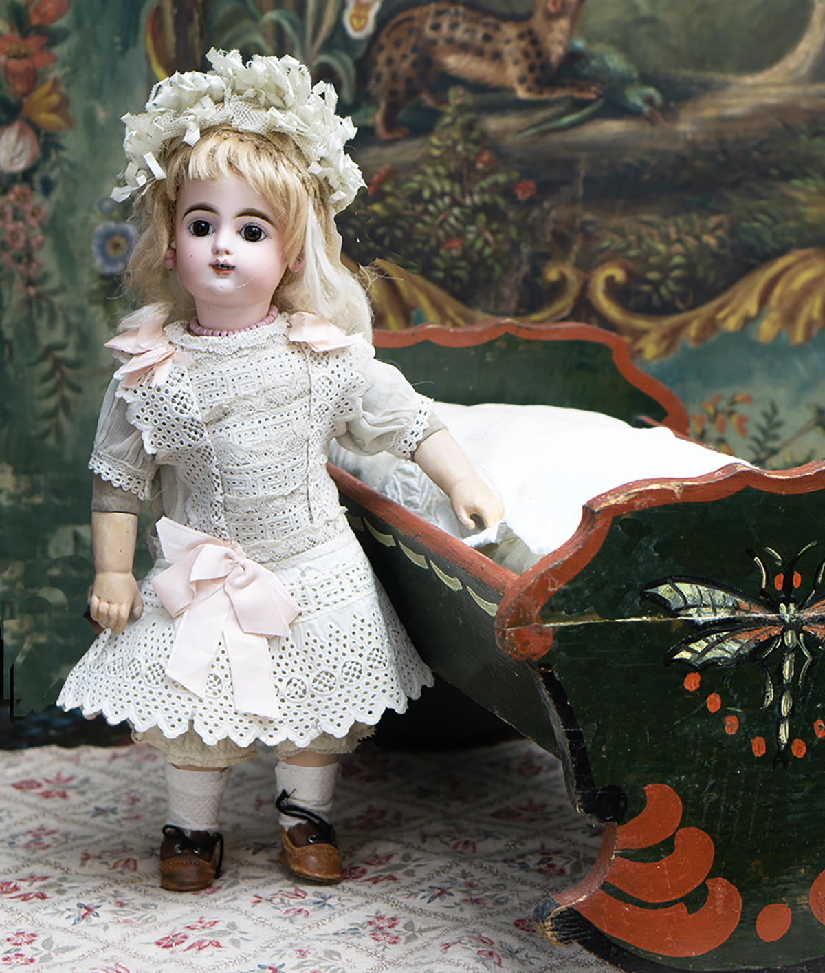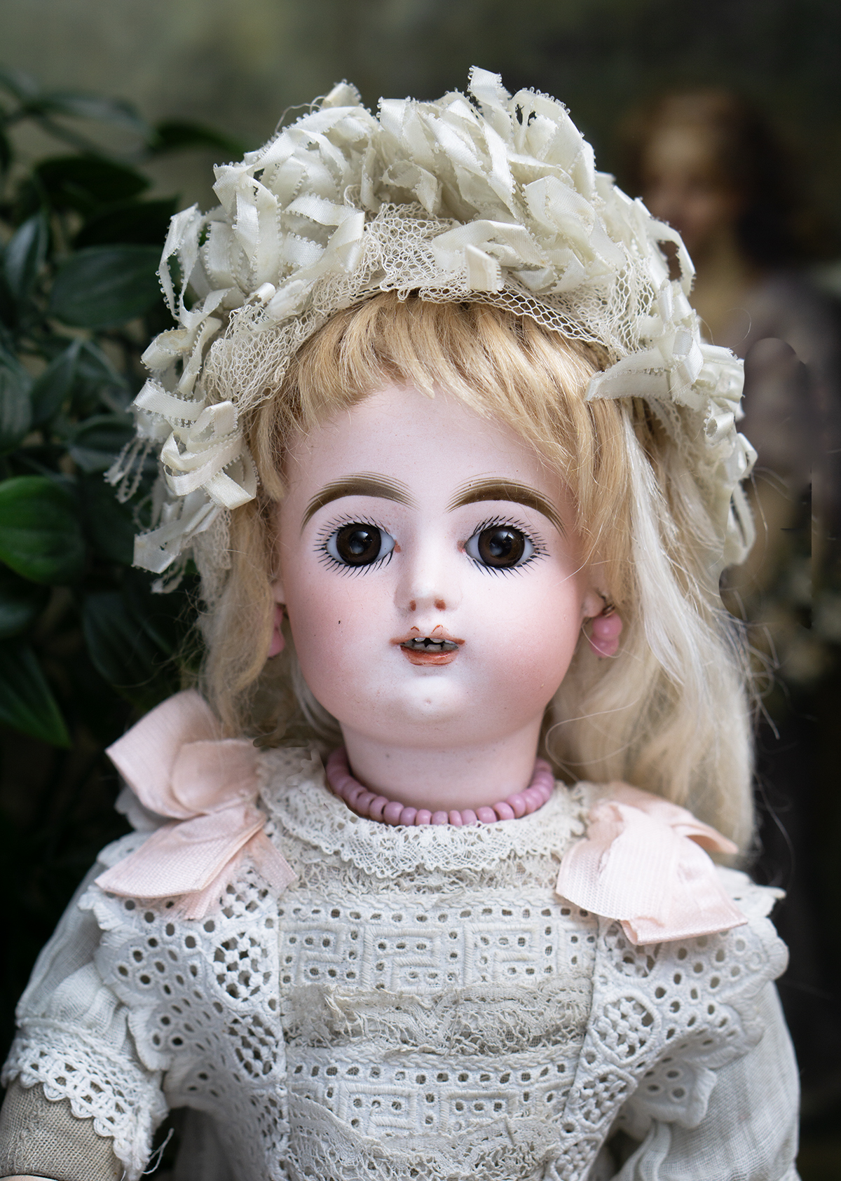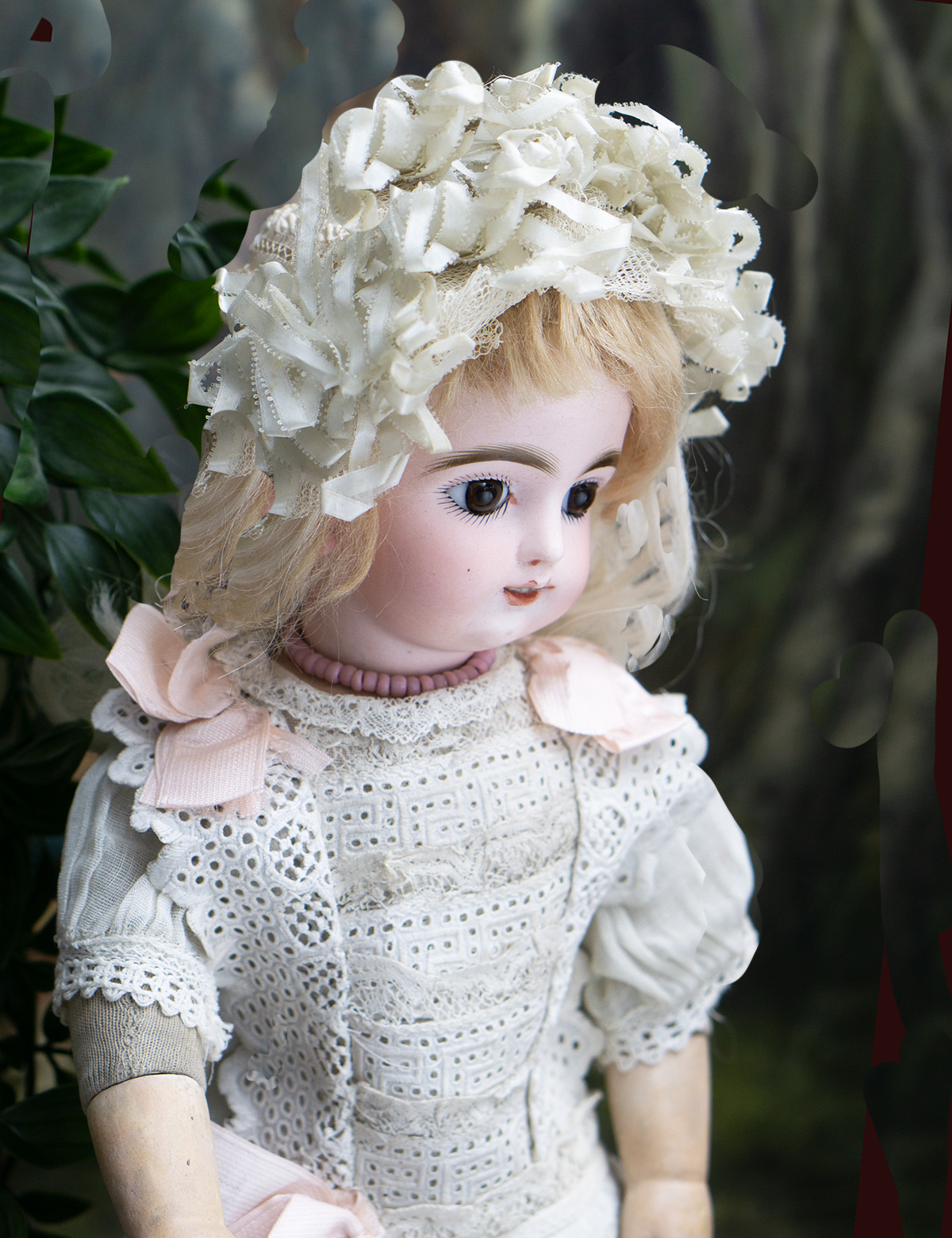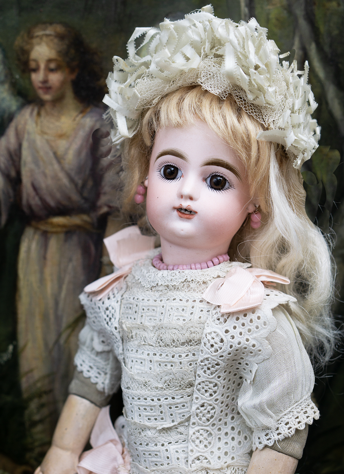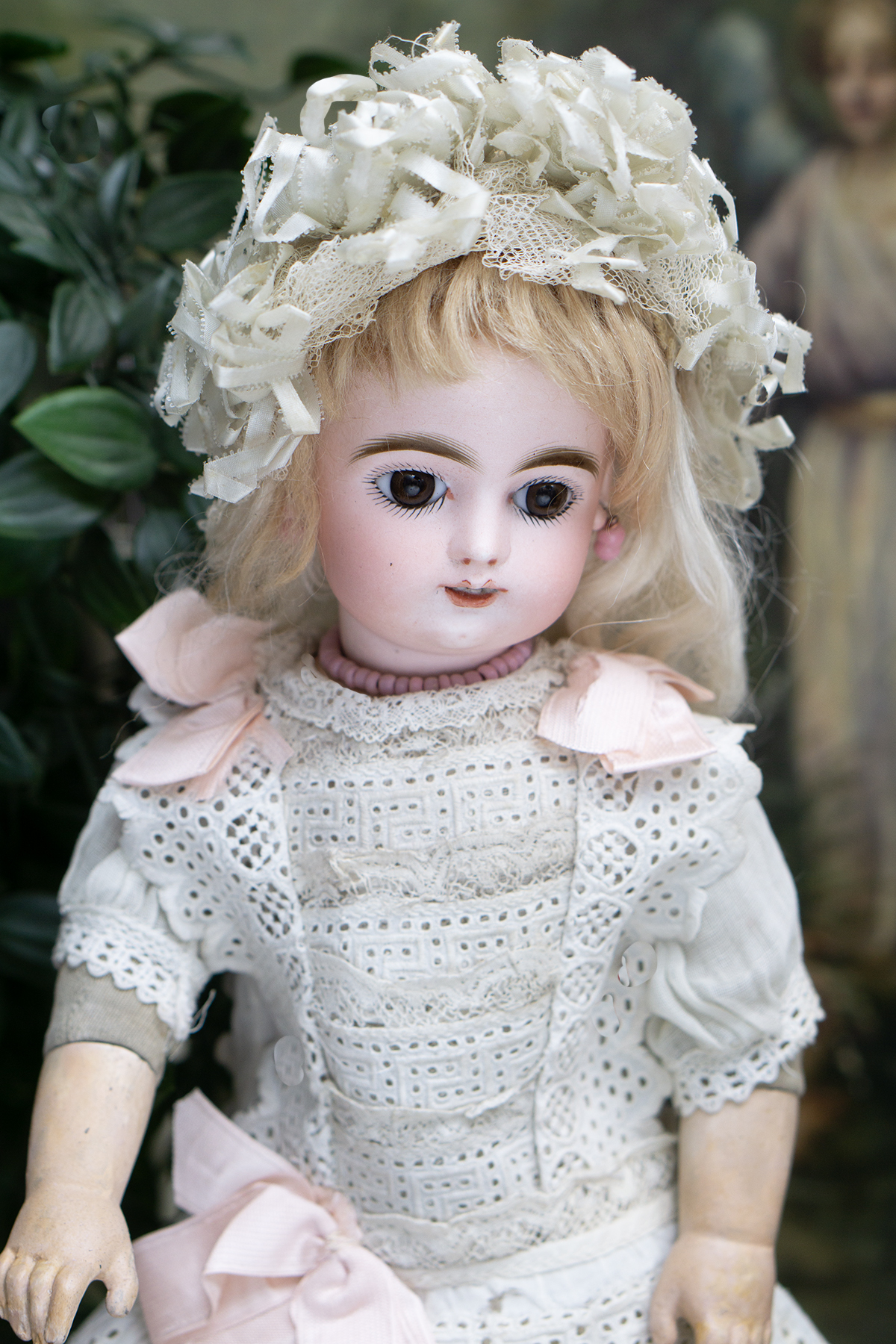 Bisque socket head with very plump face, brown glass paperweight inset eyes, dark eyeliner, painted lashes, widely-arched feathered brows, accented eye corners and nostrils, open mouth with two rows teeth, pierced ears, blonde mohair wig over cork pate, Gesland body with composition shoulder plate and lower limbs, padded stockinette armature torso and upper limbs.