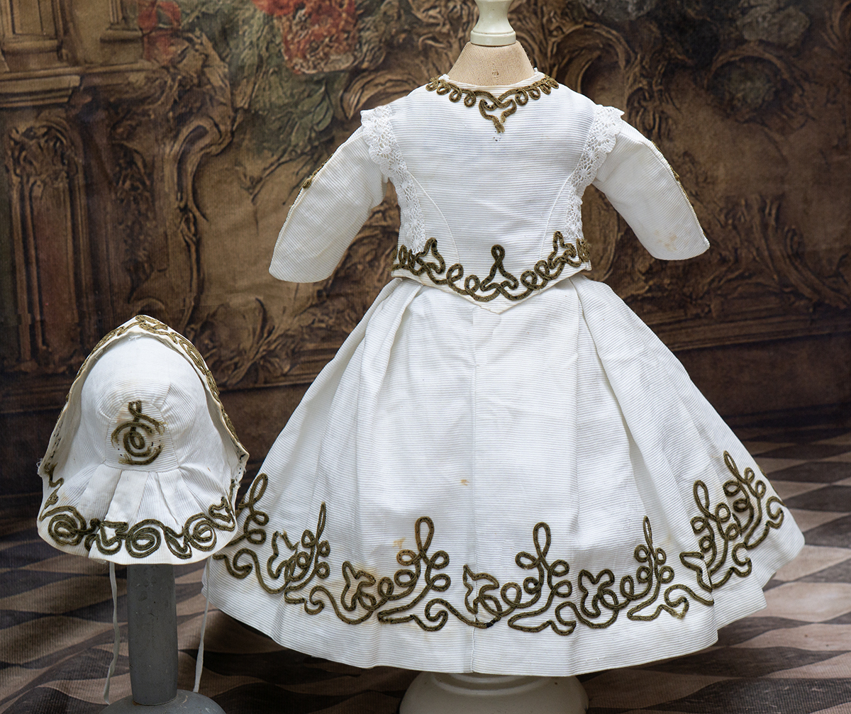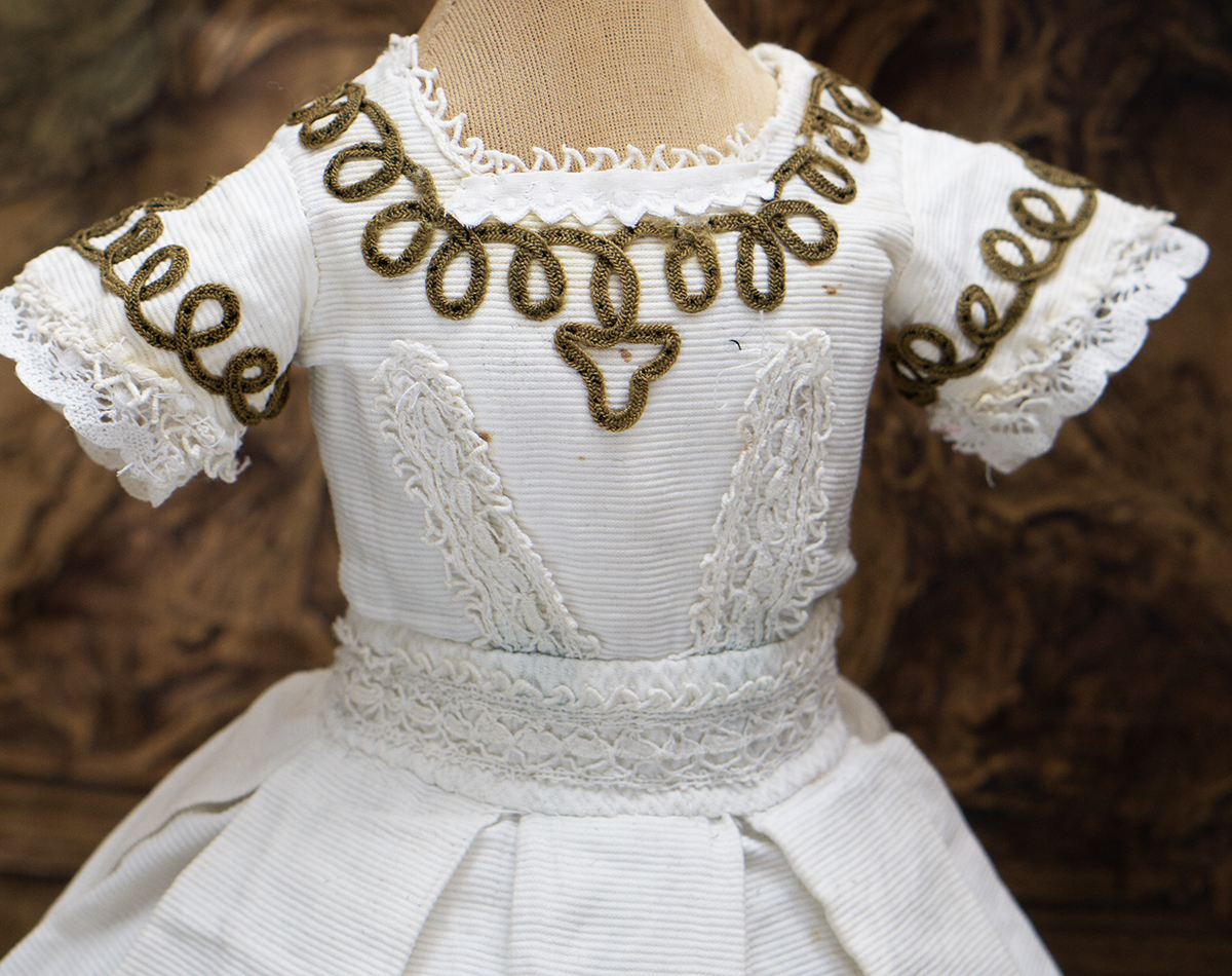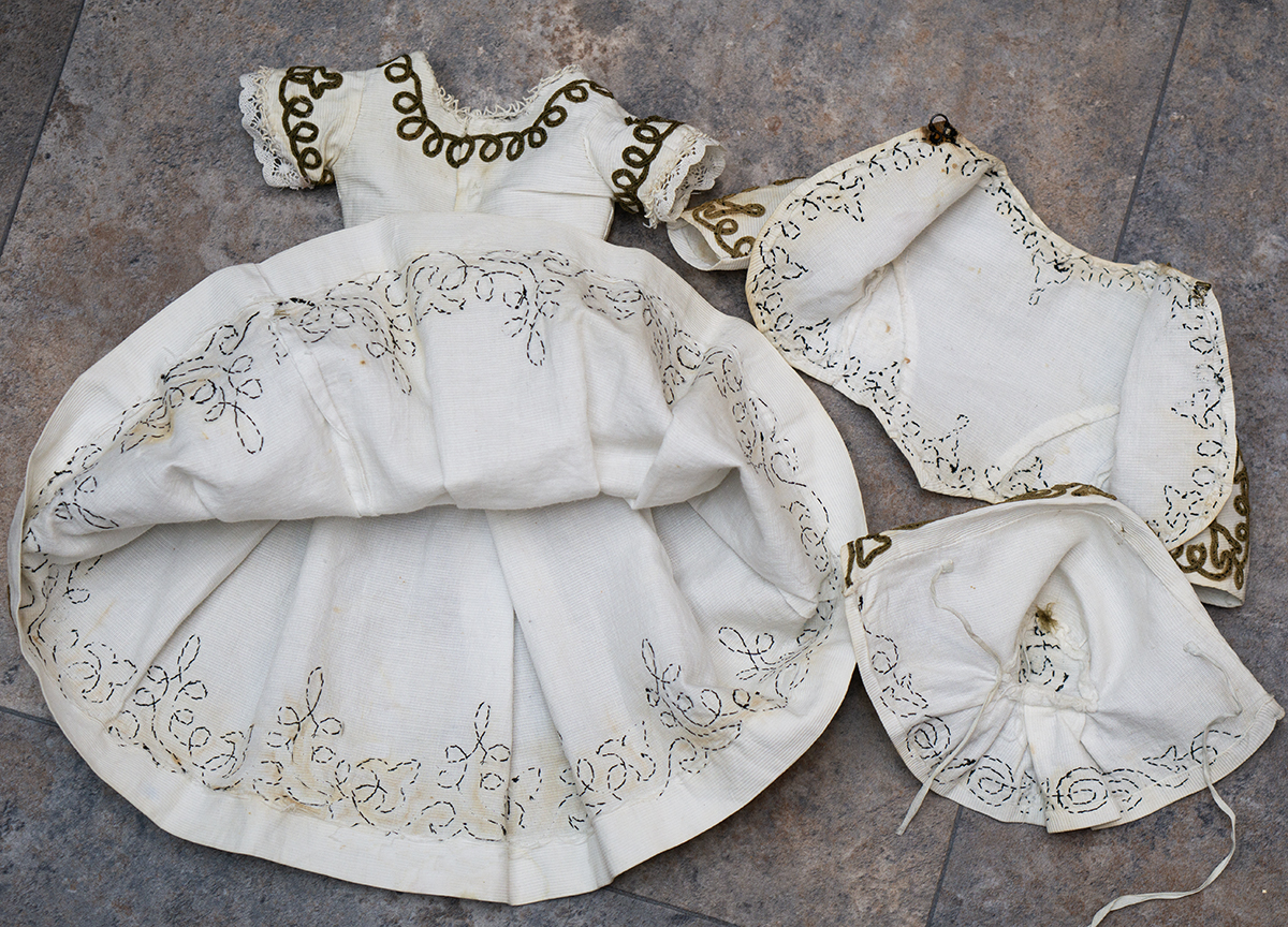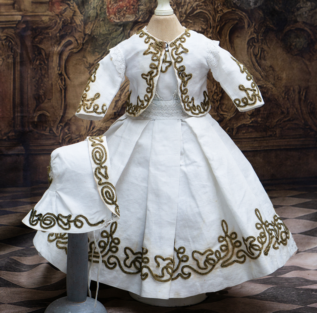 - French white pique poupee dress with Brown Soutache Trim. Of white pique with horizontal ribbing, the dress features capelet sleeves, set-in waist, and box-pleated full skirt, richly enhanced with brown soutache embroidery, decorated with cotton lace trim, closure at the back with hook and eye; - a short jacket with coat sleeves decorated with borders of brown soutache; - white pique bonnet with bavolet pleats at the back nape, decorated of brown soutache embroidery. Good condition, minor age-related yellowing along the soutache because age. Measures: 12" (30cm) length, 8" (20 cm) waist, 4" shoulder width, For 15"-16" fashion doll. French, circa 1860. ------------------------------------ I DO A LAYAWAY NO STATE SALES TAX! Thanks for your visit to Respectfulbear doll shop!