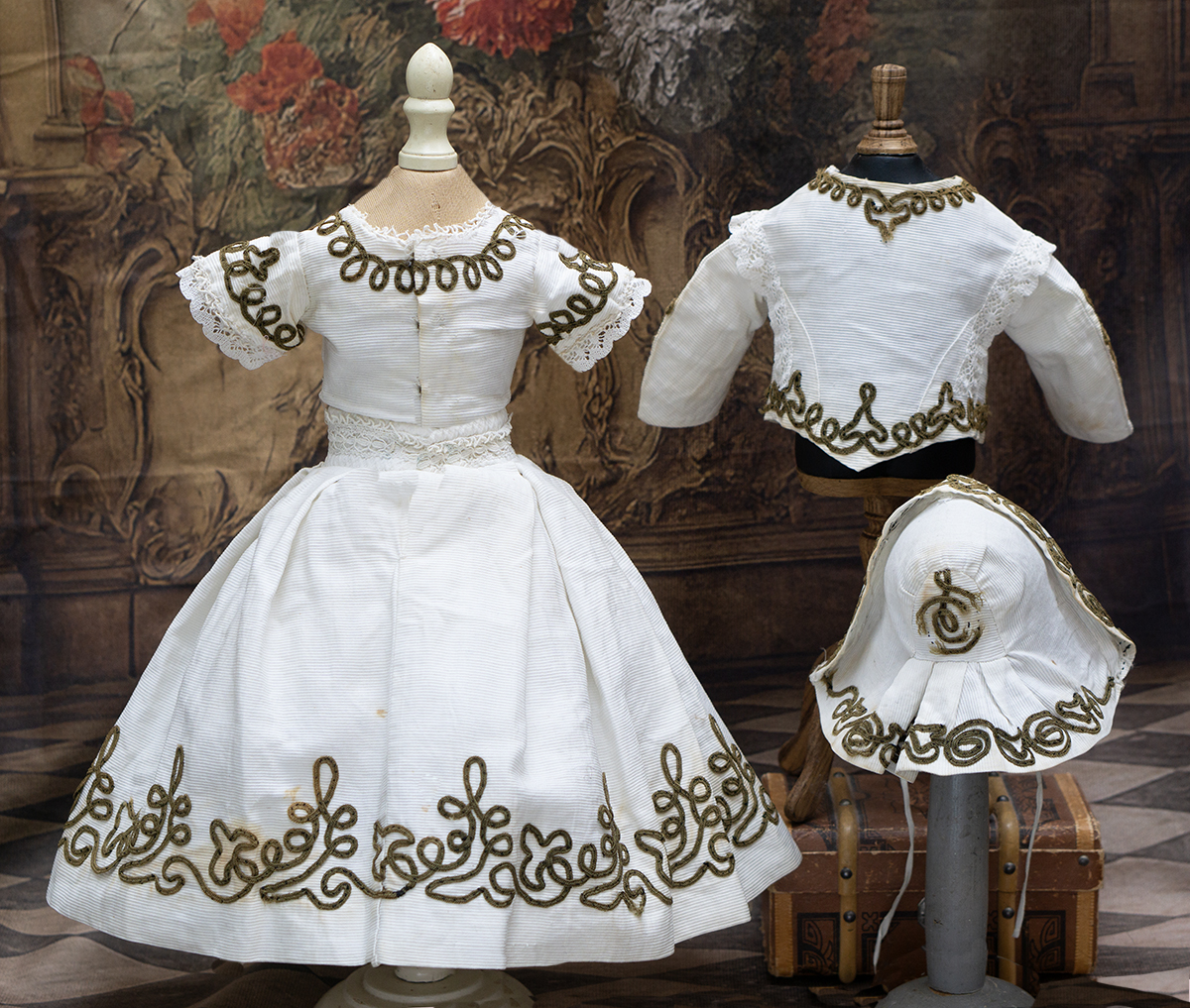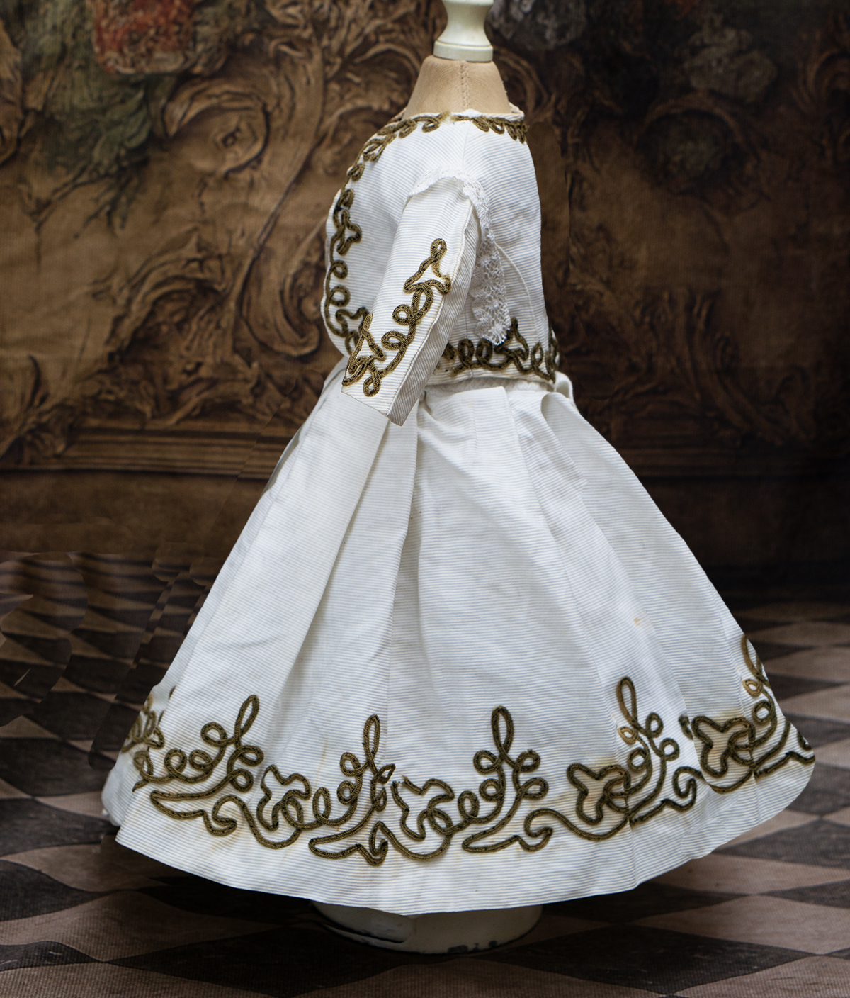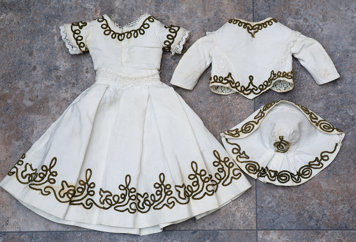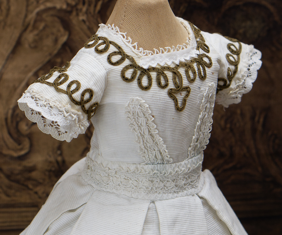 - French white pique poupee dress with Brown Soutache Trim. Of white pique with horizontal ribbing, the dress features capelet sleeves, set-in waist, and box-pleated full skirt, richly enhanced with brown soutache embroidery, decorated with cotton lace trim, closure at the back with hook and eye; - a short jacket with coat sleeves decorated with borders of brown soutache; - white pique bonnet with bavolet pleats at the back nape, decorated of brown soutache embroidery. Good condition, minor age-related yellowing along the soutache because age. Measures: 12" (30cm) length, 8" (20 cm) waist, 4" shoulder width, For 15"-16" fashion doll. French, circa 1860. ------------------------------------ I DO A LAYAWAY NO STATE SALES TAX! Thanks for your visit to Respectfulbear doll shop!