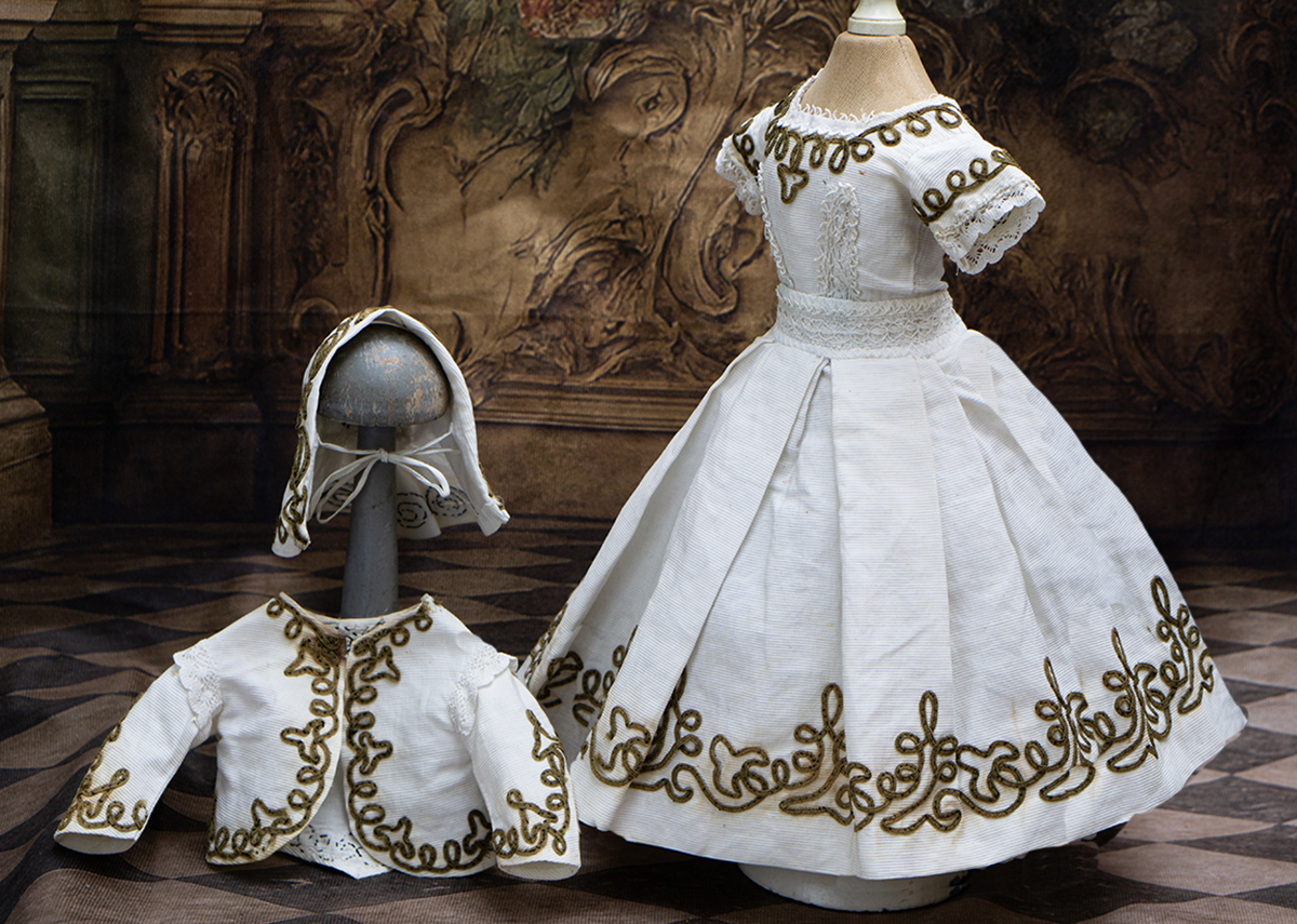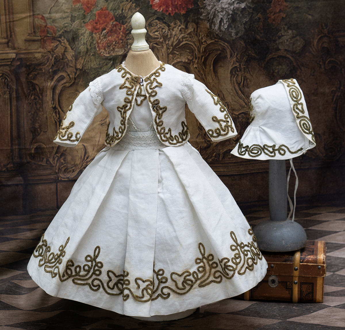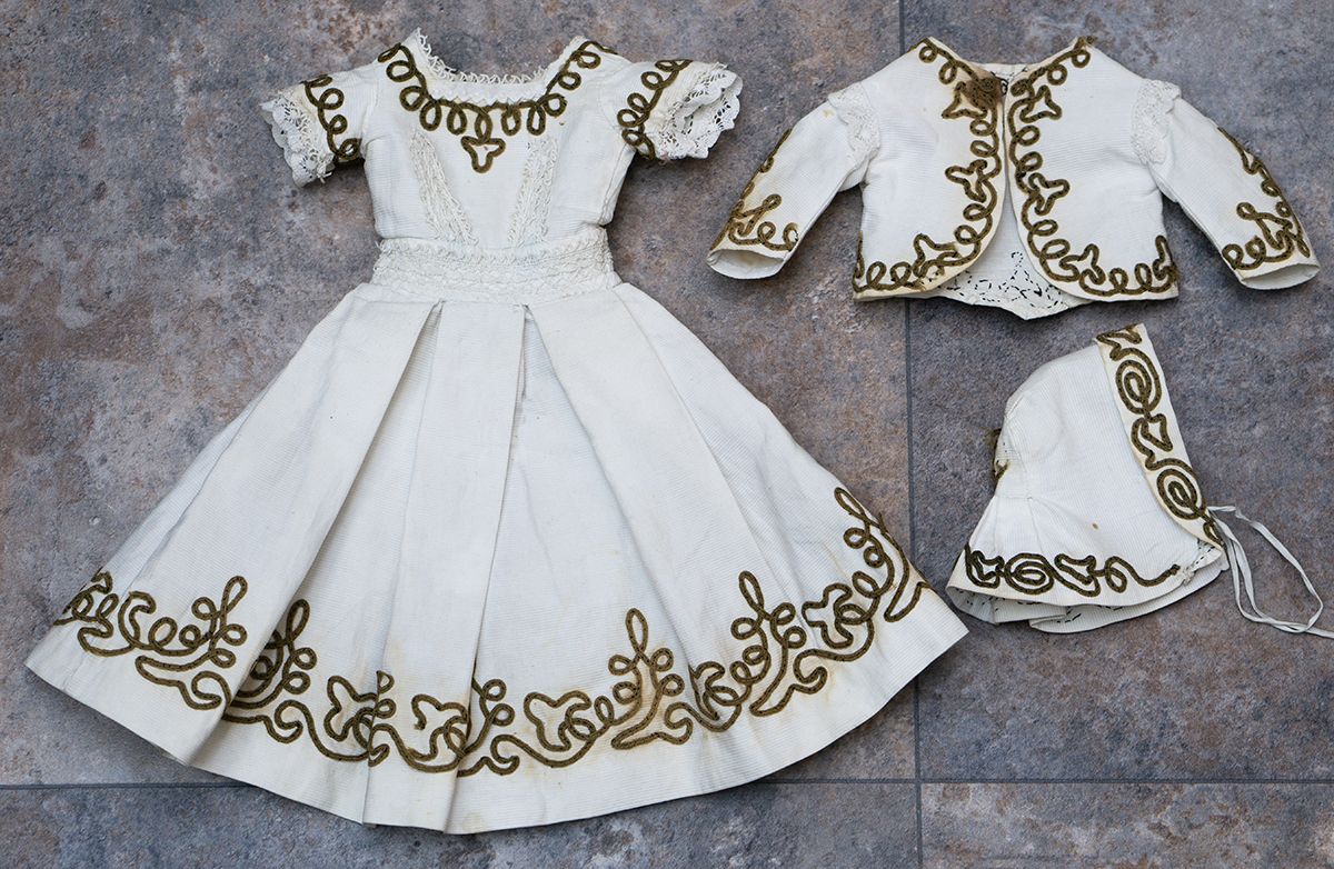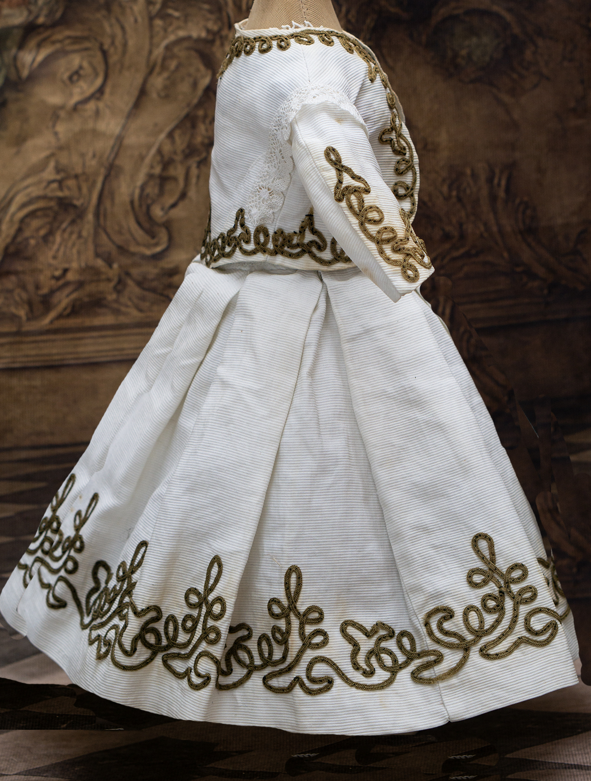 - French white pique poupee dress with Brown Soutache Trim. Of white pique with horizontal ribbing, the dress features capelet sleeves, set-in waist, and box-pleated full skirt, richly enhanced with brown soutache embroidery, decorated with cotton lace trim, closure at the back with hook and eye; - a short jacket with coat sleeves decorated with borders of brown soutache; - white pique bonnet with bavolet pleats at the back nape, decorated of brown soutache embroidery. Good condition, minor age-related yellowing along the soutache because age. Measures: 12" (30cm) length, 8" (20 cm) waist, 4" shoulder width, For 15"-16" fashion doll. French, circa 1860. ------------------------------------ I DO A LAYAWAY NO STATE SALES TAX! Thanks for your visit to Respectfulbear doll shop!