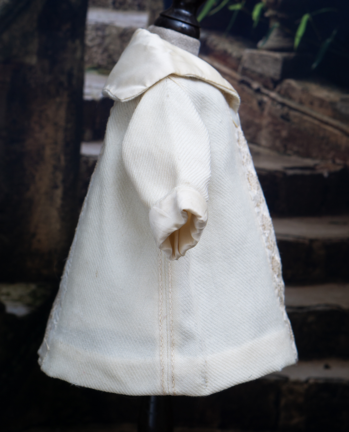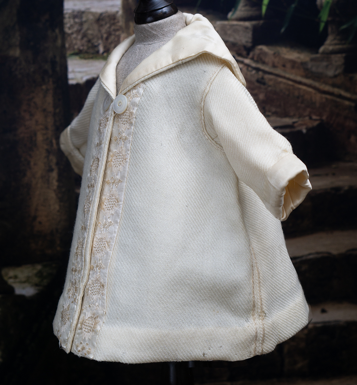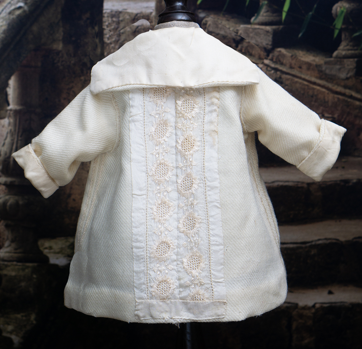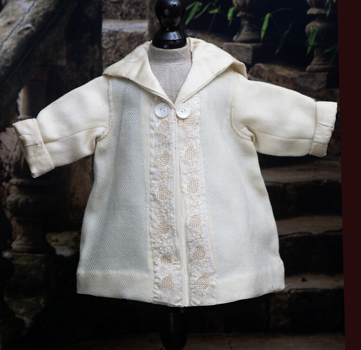 Very beautiful all original twill ivory coat features coat sleeves, silk collar, vertical silk ivory bands with silk flowers, silk lining, closure with pearl buttons, with original AU NAIN BLEU label from the parisian store, c.1900.
