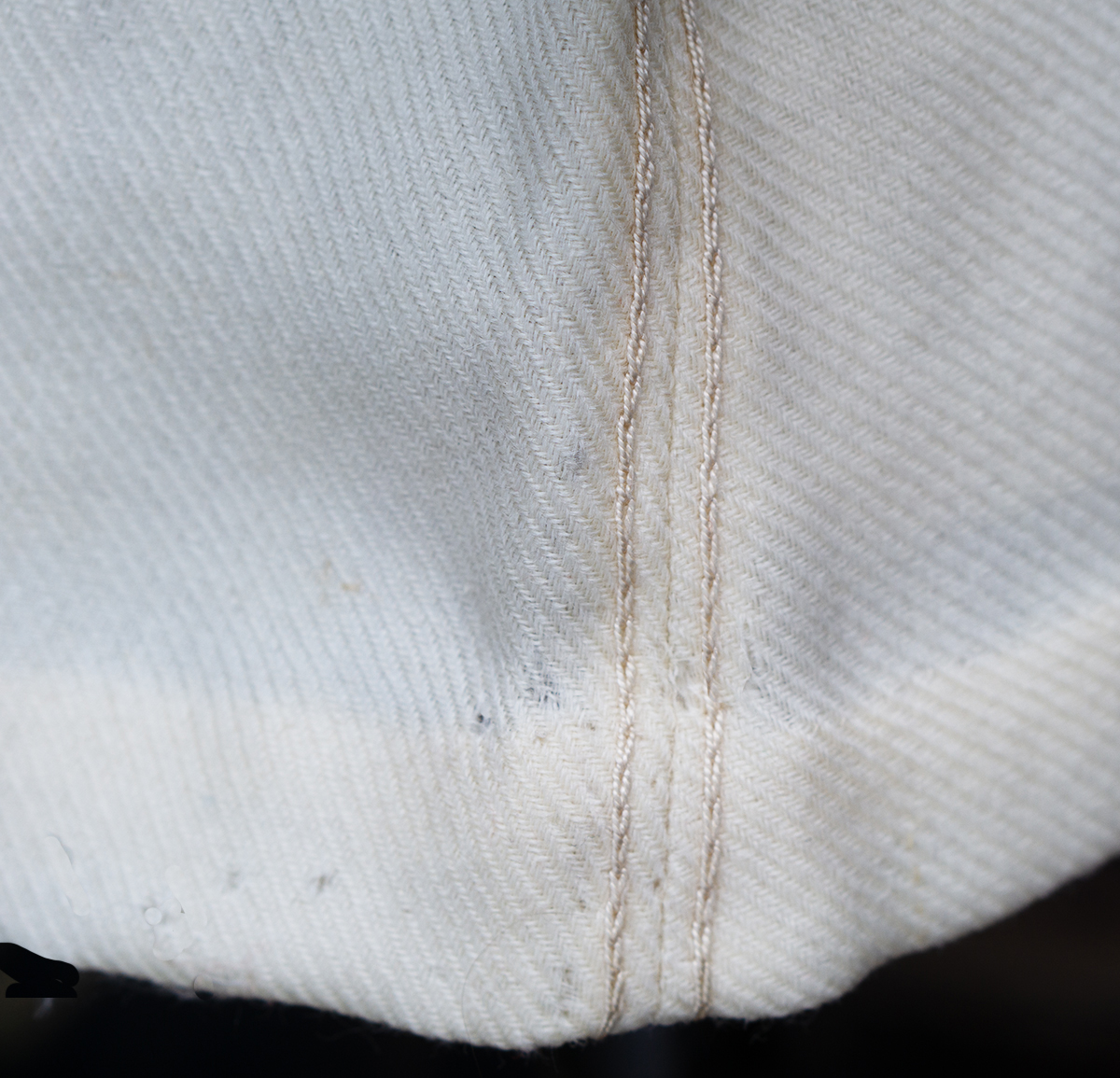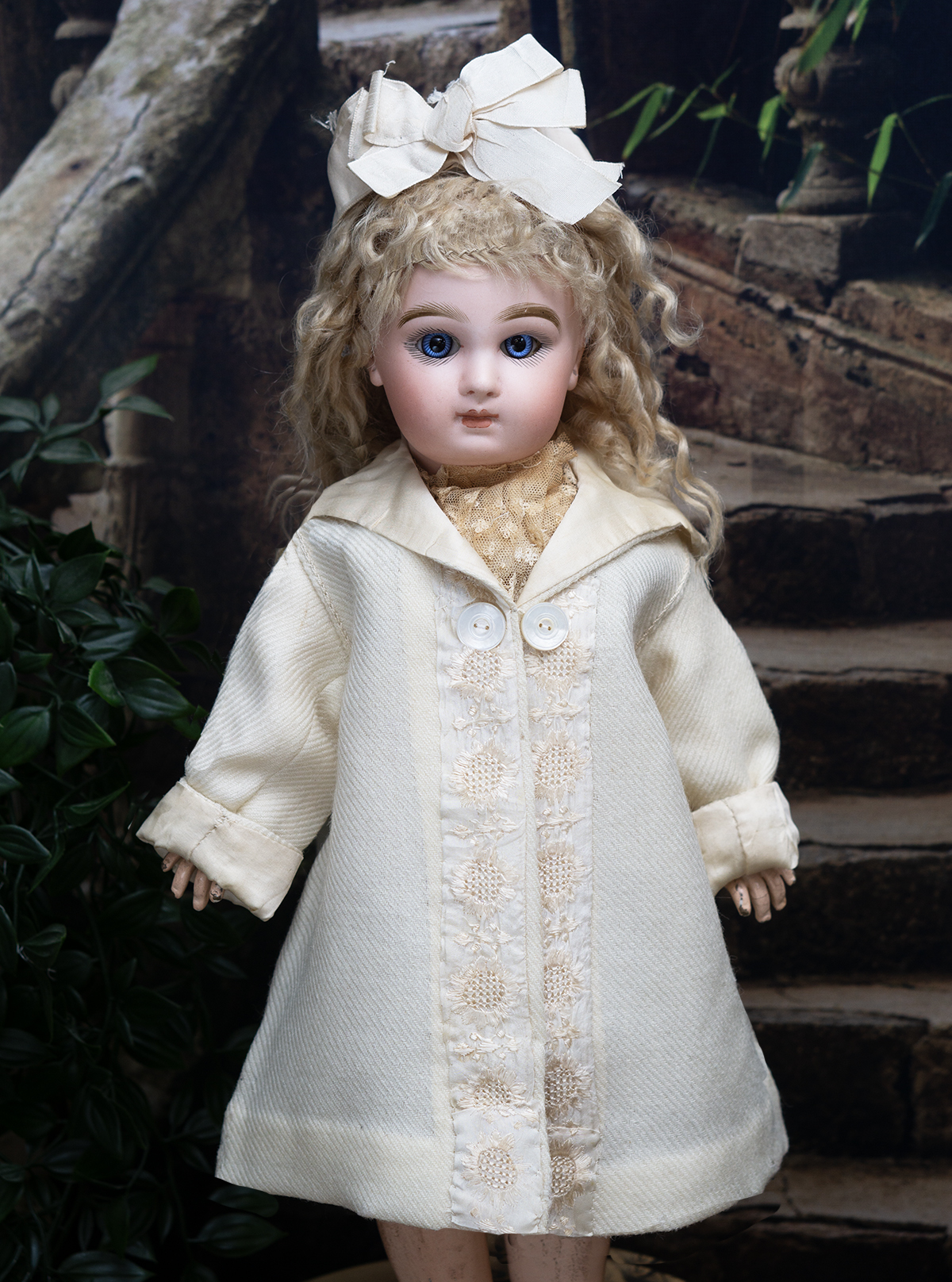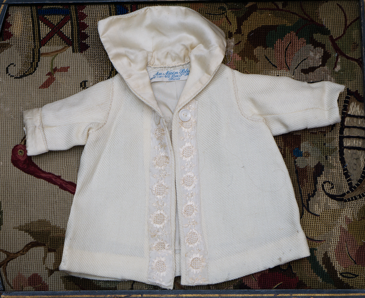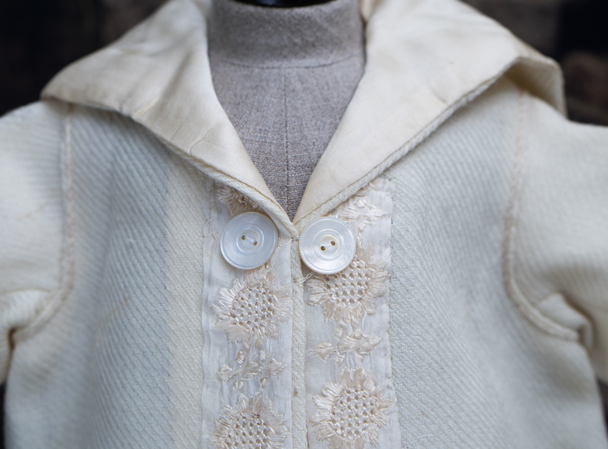 Very beautiful all original twill ivory coat features coat sleeves, silk collar, vertical silk ivory bands with silk flowers, silk lining, closure with pearl buttons, with original AU NAIN BLEU label from the parisian store, c.1900.