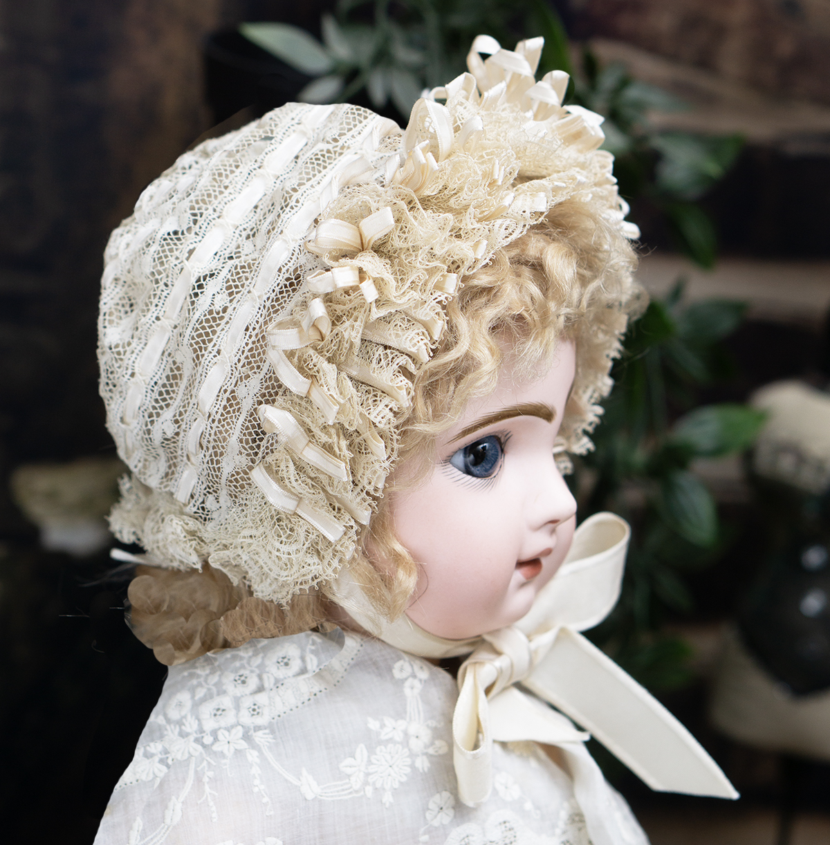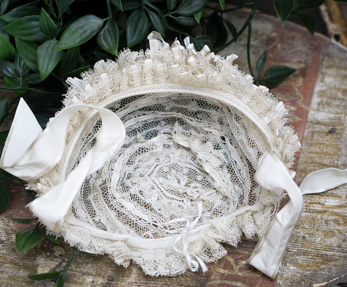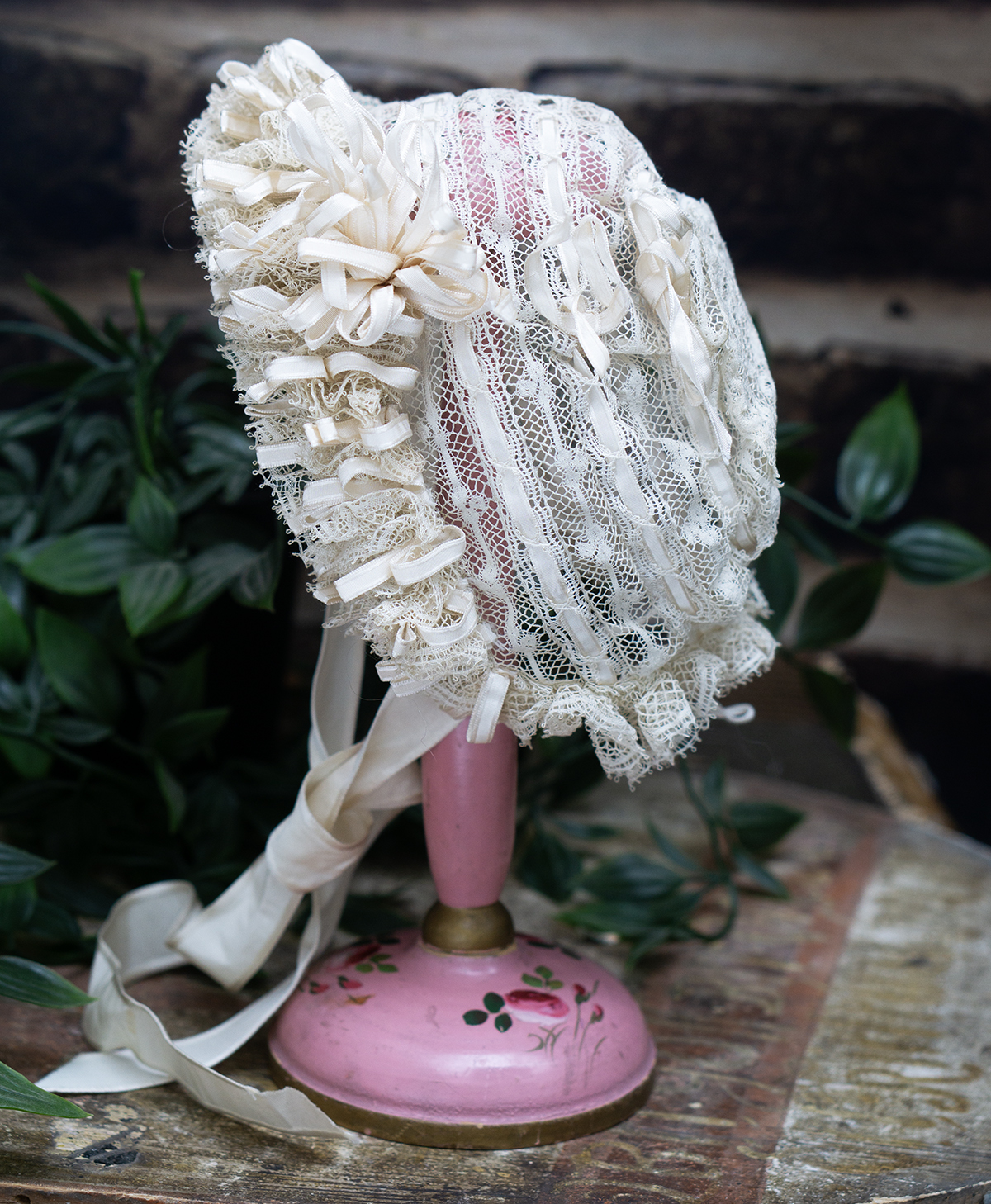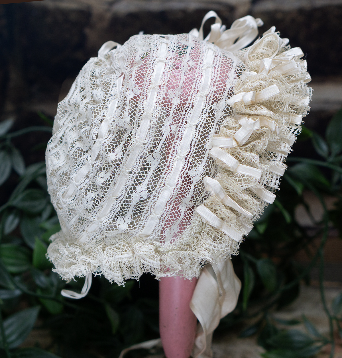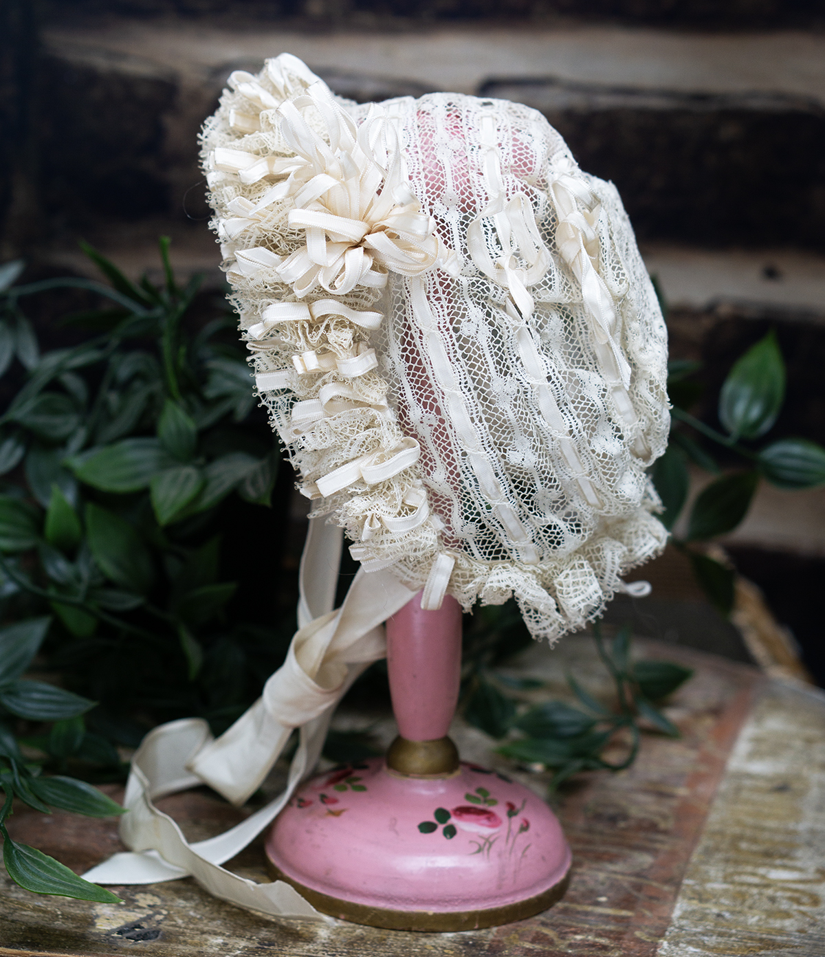 Wonderful all original french lace bonnet with interwoven silk flecks is decorated with rolled ivory silk ribbon bands, with box-pleated lace framing the face.