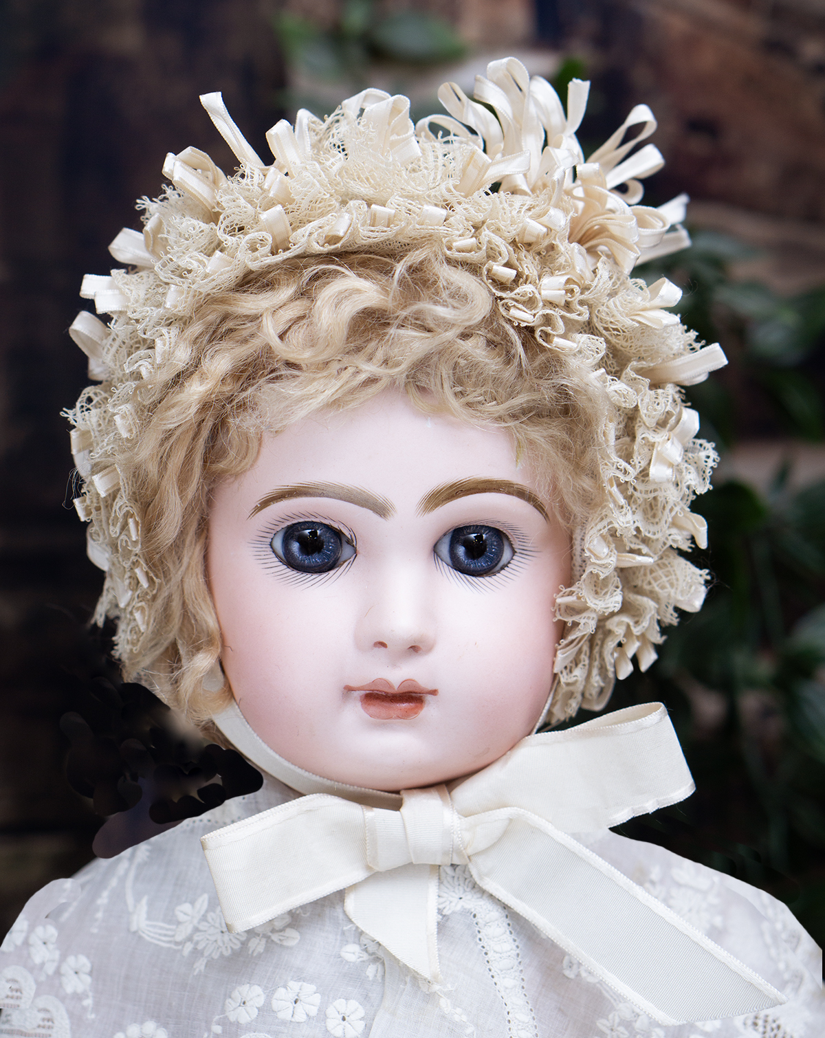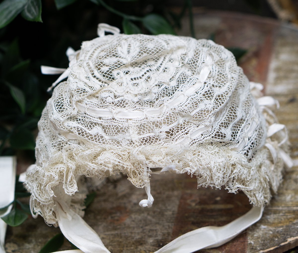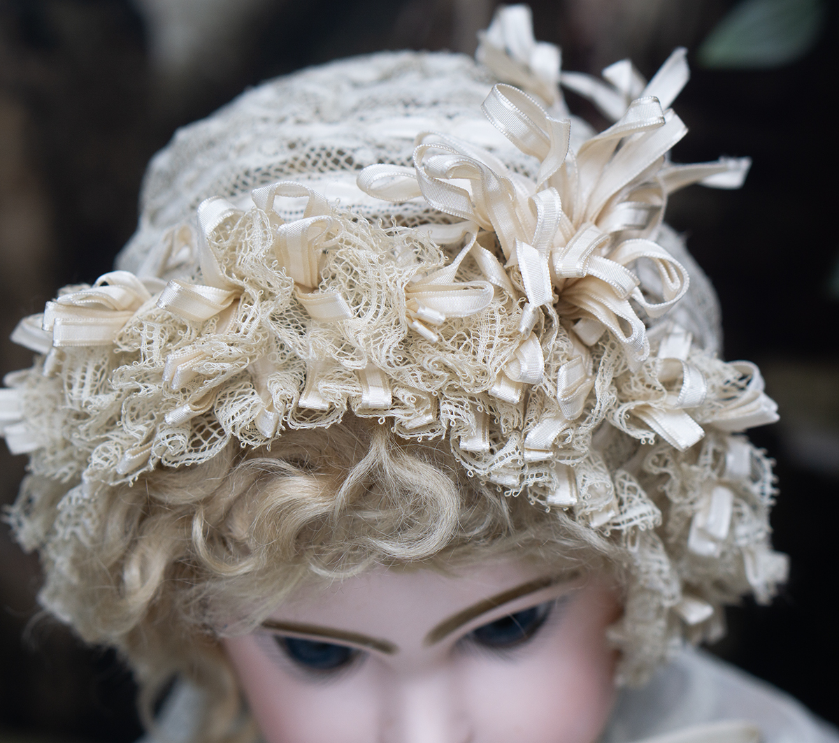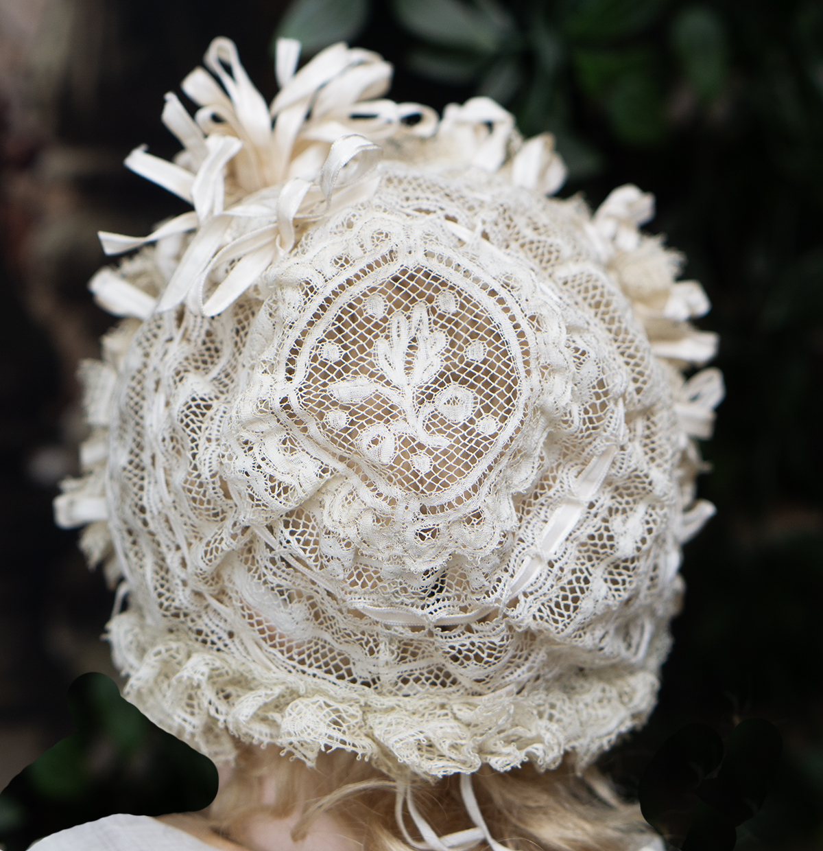 Wonderful all original french lace bonnet with interwoven silk flecks is decorated with rolled ivory silk ribbon bands, with box-pleated lace framing the face.