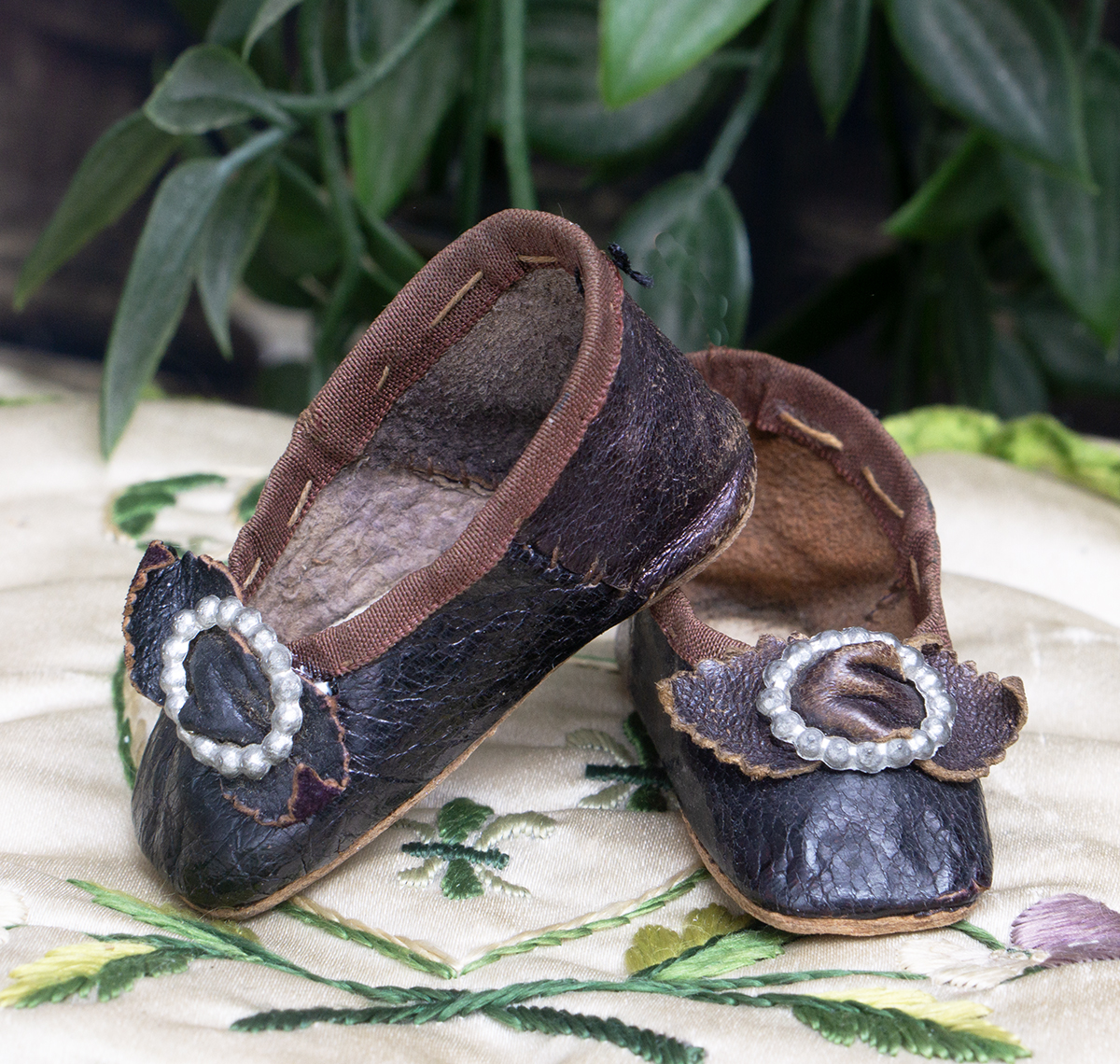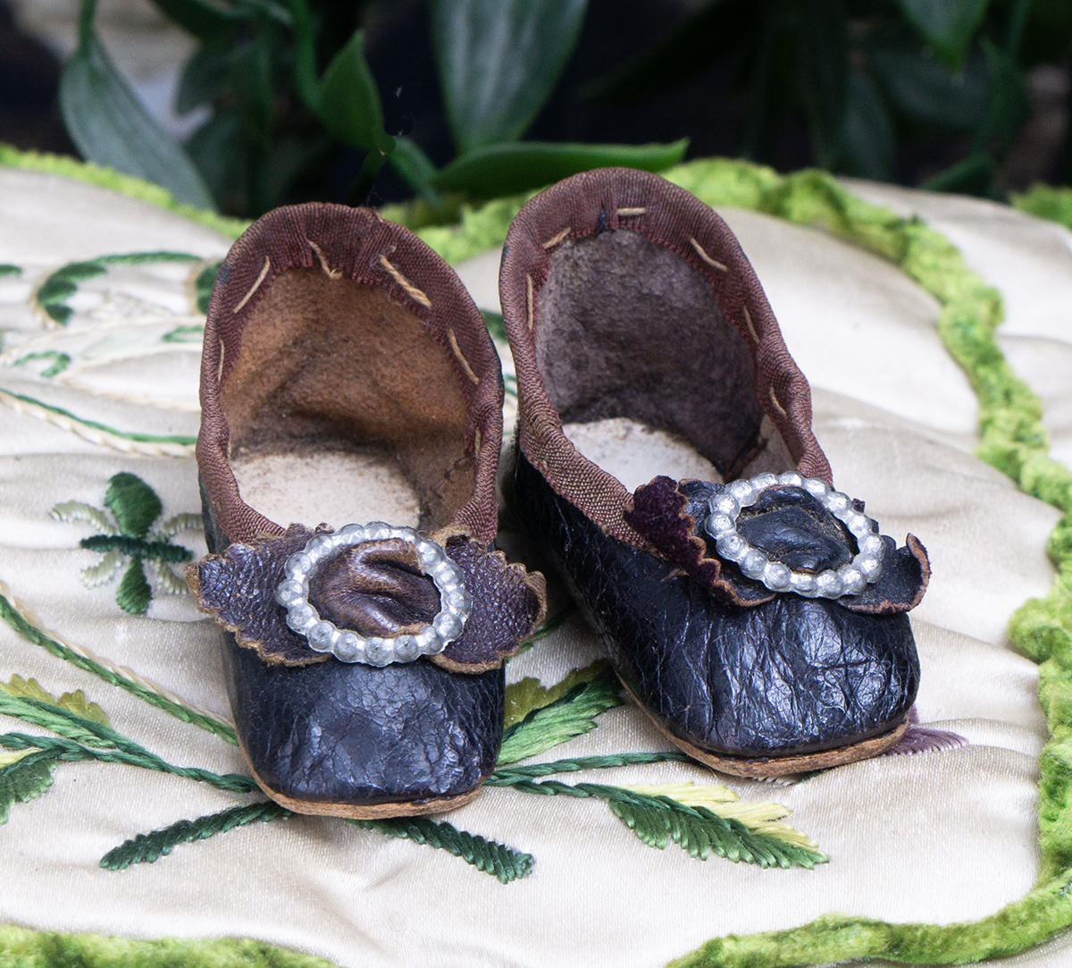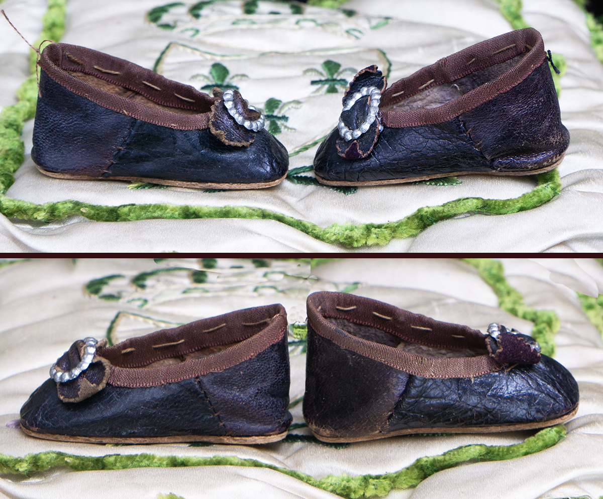 Wonderful black kidskin shoes for fashion doll (or small bebe) with silver medal buckles, silk brown trim, signed " 50 Modes de Paris"