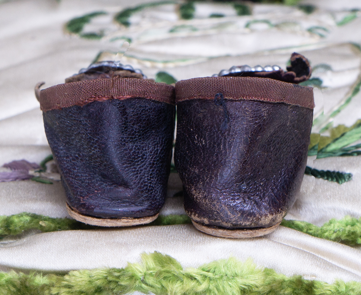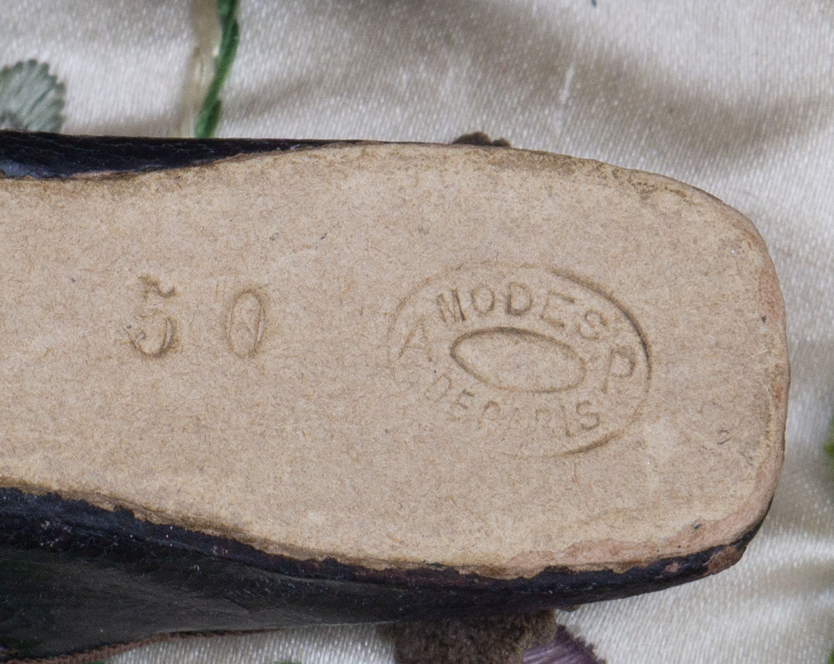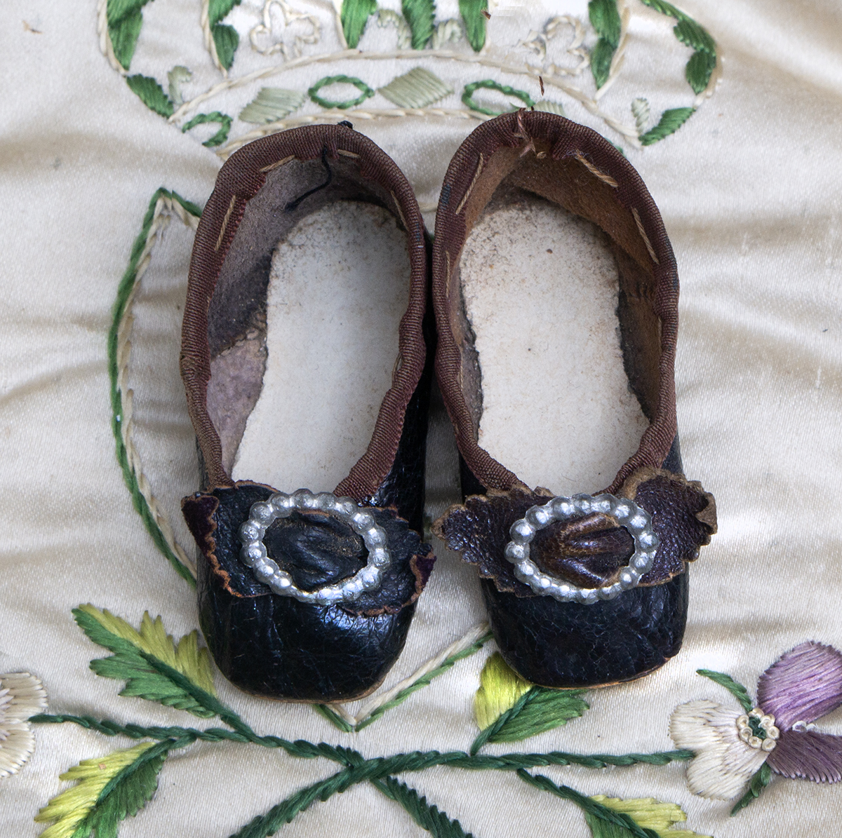 Wonderful black kidskin shoes for fashion doll (or small bebe) with silver medal buckles, silk brown trim, signed " 50 Modes de Paris"