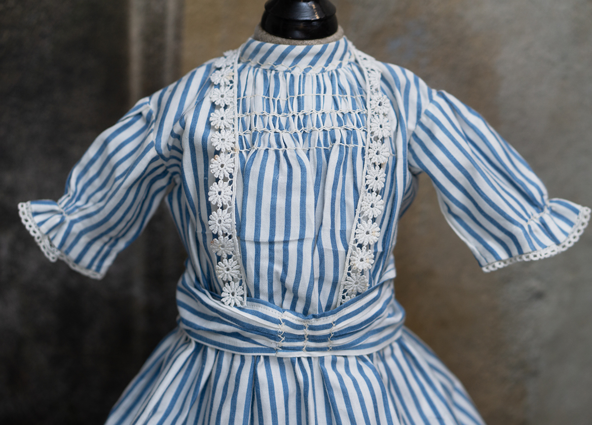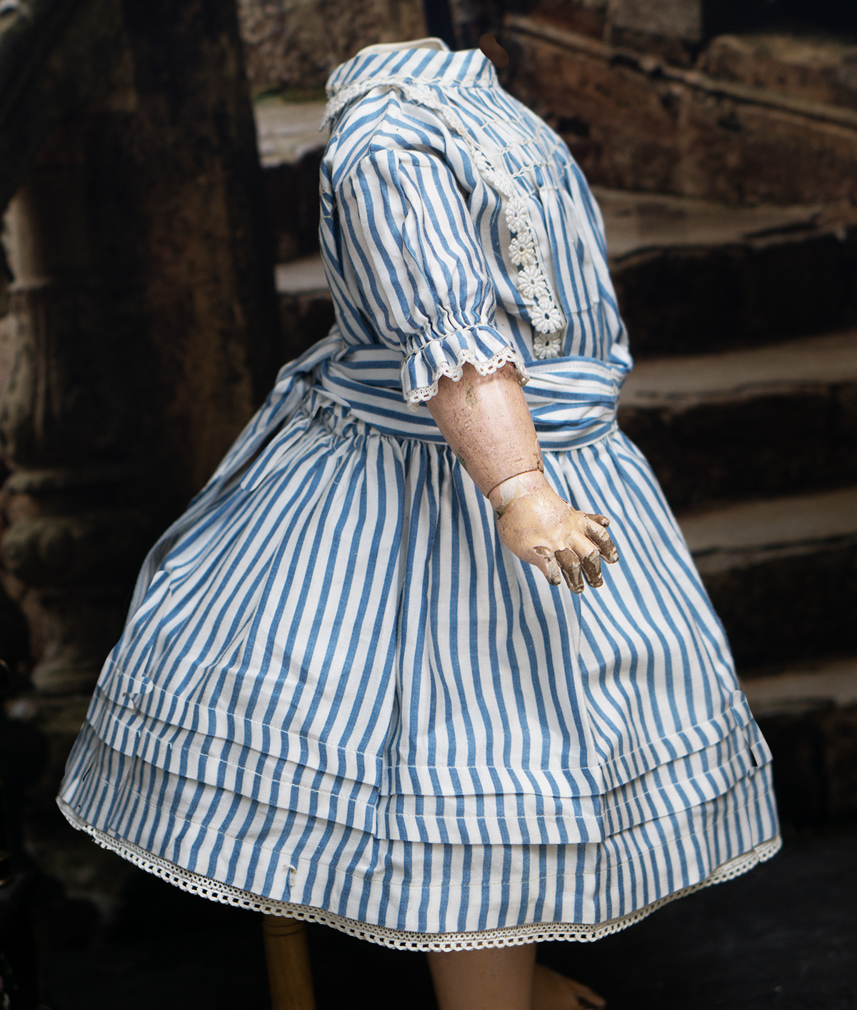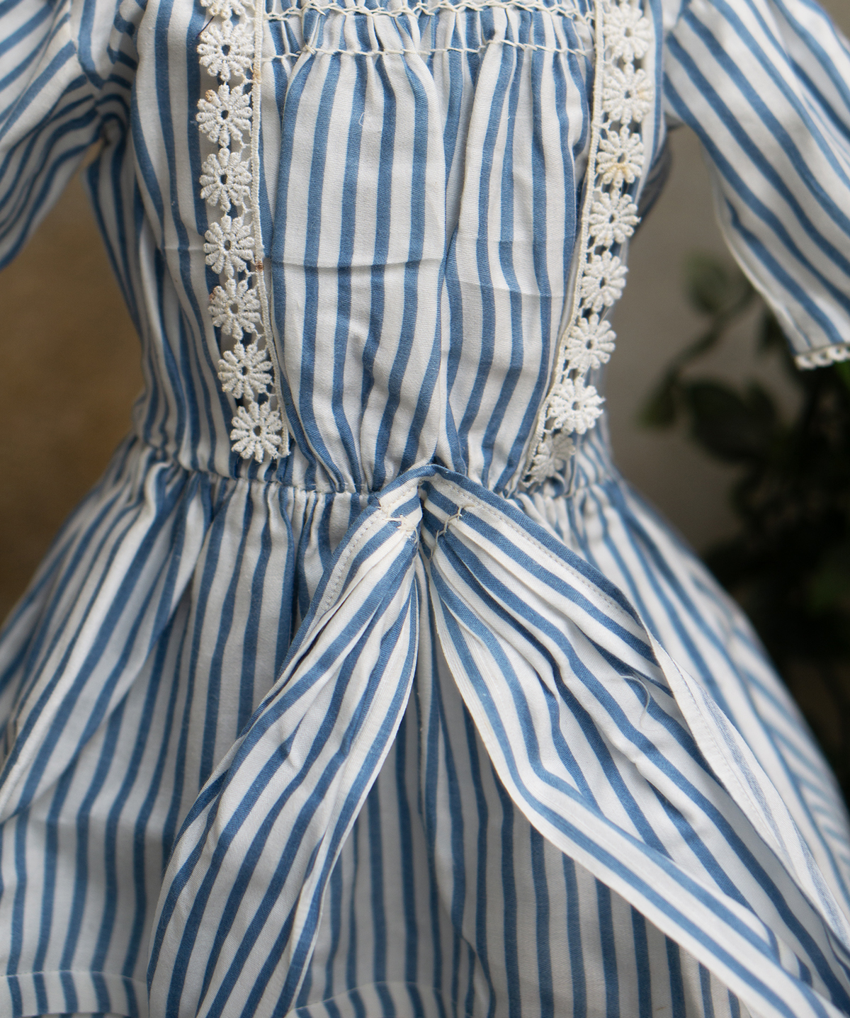 Very beautiful antique original blue and white stripped cotton dress features set-in high waist, 2/3 full sleeves with lace ending, closure at the back with hook and eye, with wide self sash. Good condition to age. Fit for small Jumeau, Bru, Steiner, Eden bebe or early german bisque doll about 21-22" tall (53-56 cm) Measures 12 1/2" (32 cm) length, 4" (10 cm) sleeve, 6" (15 cm) shoulders, 11" (38 cm) waist. Fit for Bebe doll 21-22" (53-56cm). International shipping cost bu UPS $55.00 NO extra duties or taxes on delivery (UPS DDP). ------------------------------------ I DO A LAYAWAY NO STATE SALES TAX! Thanks for your visit to Respectfulbear doll shop!