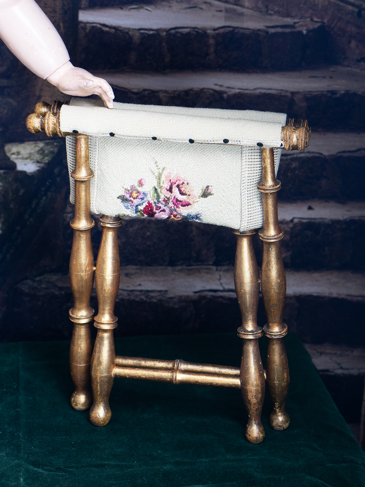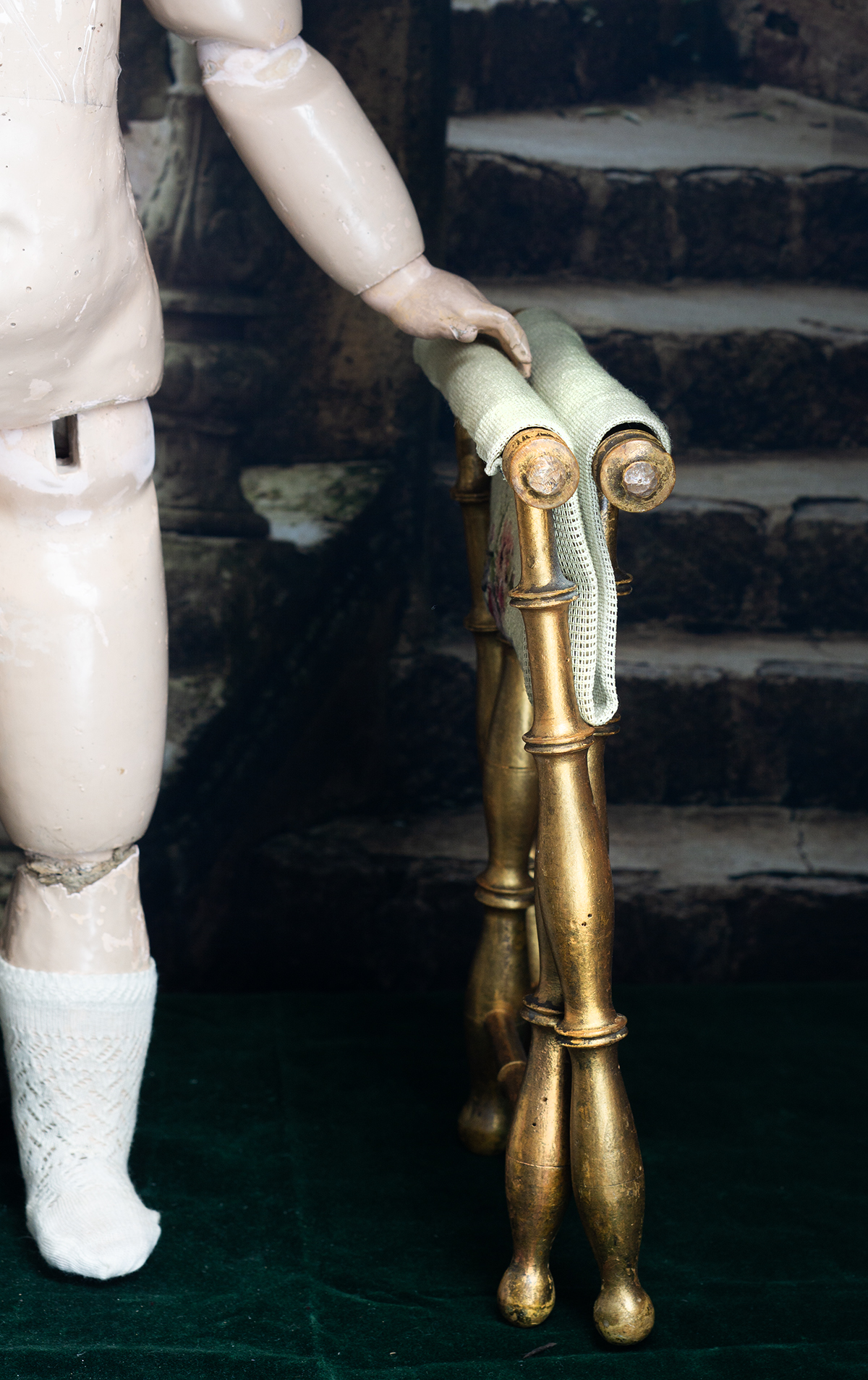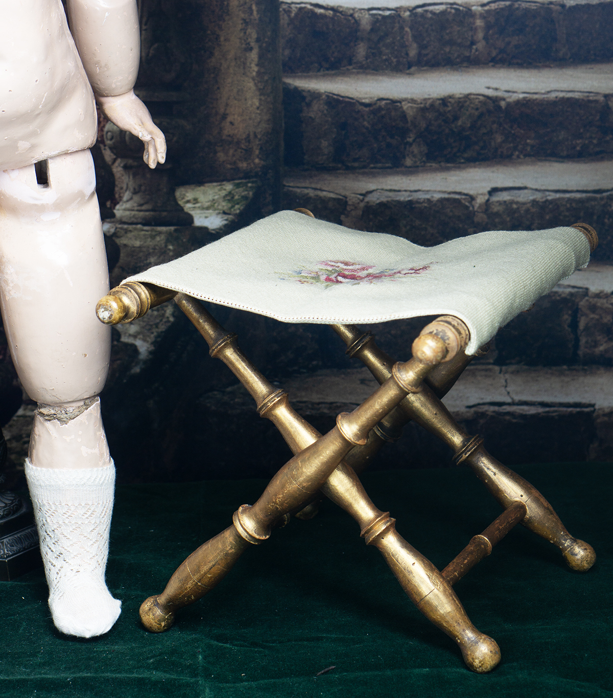 The mahogany-framed golden color folding chair, with carved detail , known as "campaign" style, allowing for portability; the purpose-driven centuries-old style was particularly prevalent in 19th Century France for its use at summer festivals and such. Perfectly scaled for display with dolls 24-26".