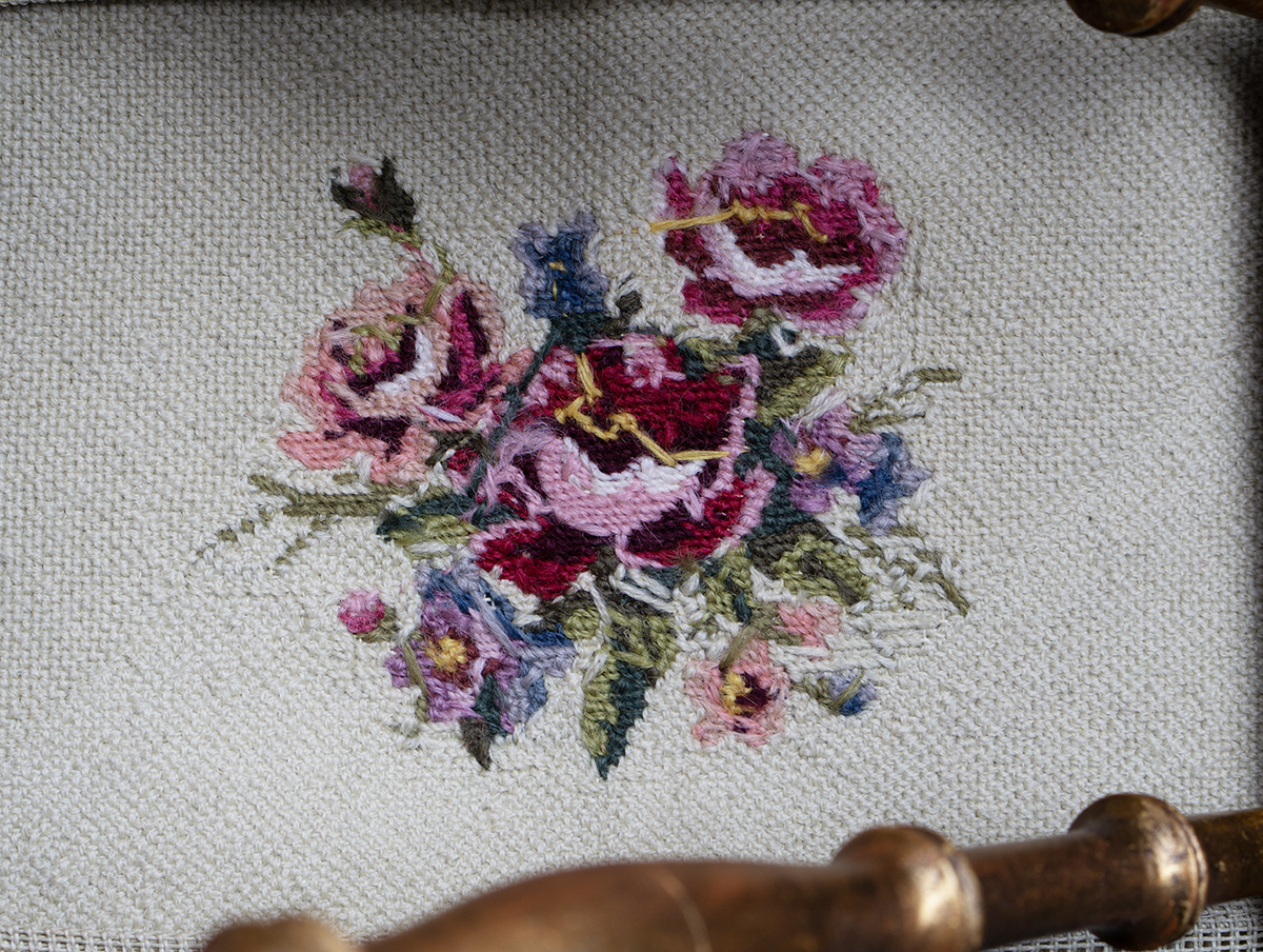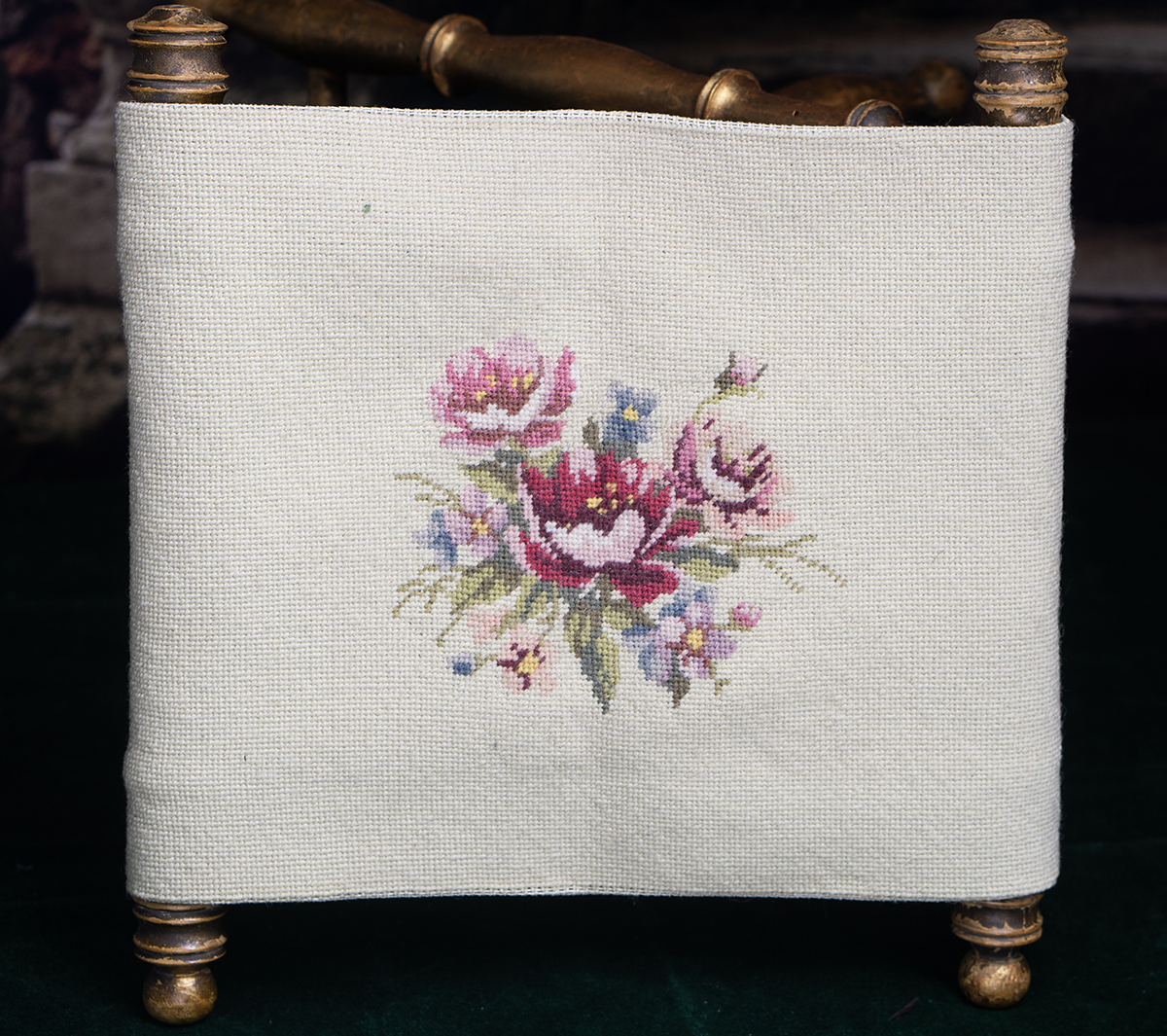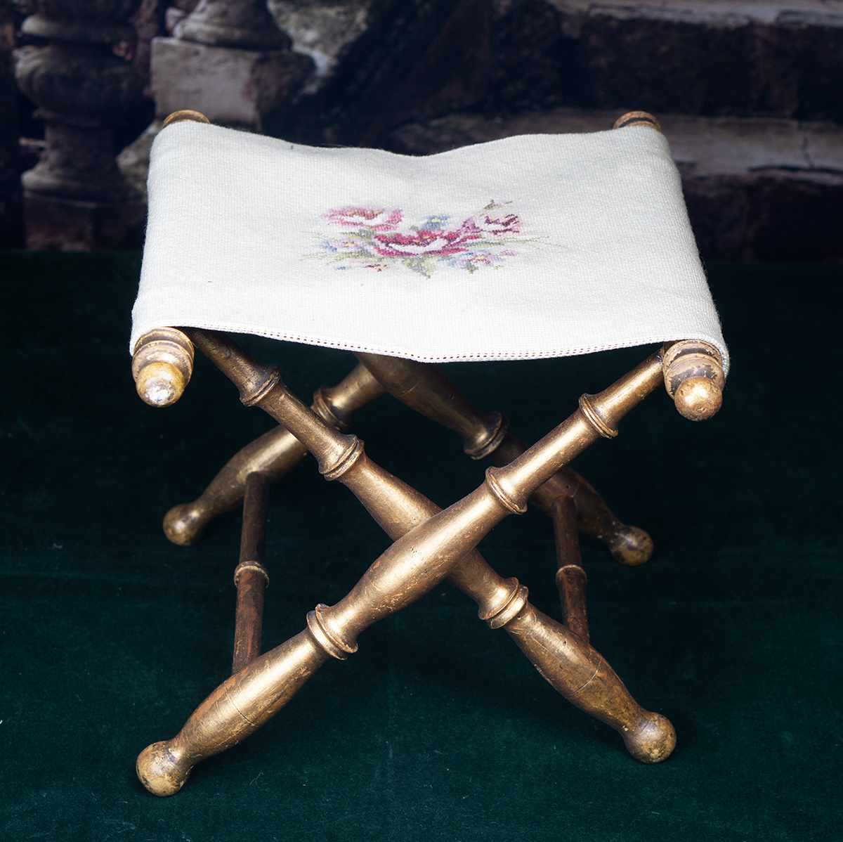 The mahogany-framed golden color folding chair, with carved detail , known as "campaign" style, allowing for portability; the purpose-driven centuries-old style was particularly prevalent in 19th Century France for its use at summer festivals and such. Perfectly scaled for display with dolls 24-26".