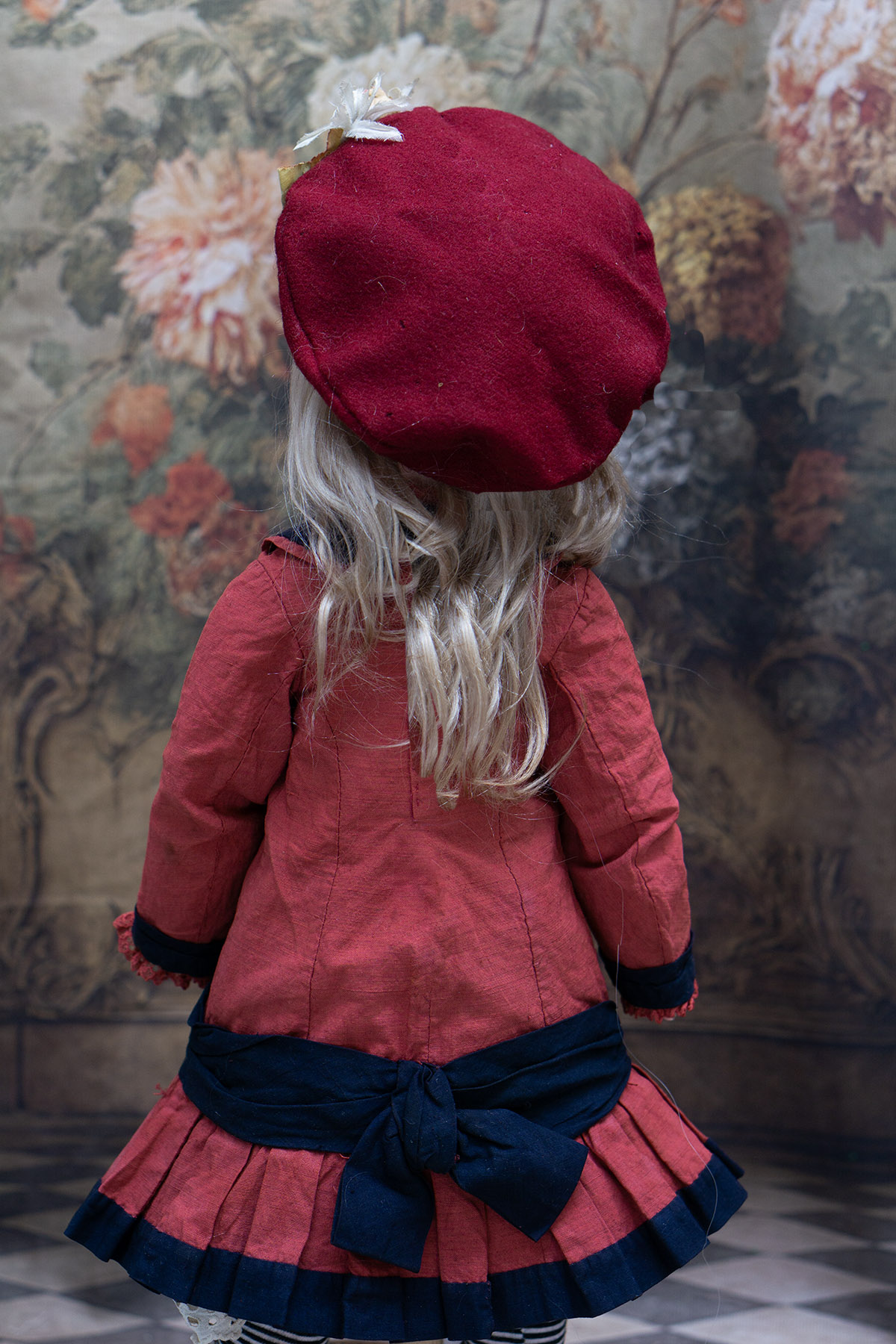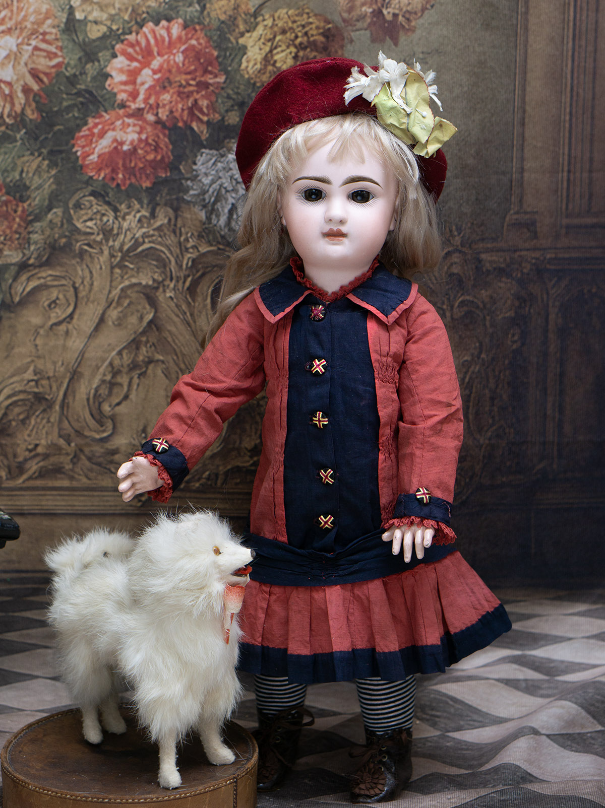 An exceptionally pretty French bebe with unusual expression, wearing original cotton princess style dress, undergarments, woolen cap, vintage stockings and fancy leather shoes with silk rosettes. Condition: generally excellent. Her bisque free of hairline, restoration, any damages, original body painting. 17" (44 cm.) tall Marks: E. 7 D. (and artist check marks on head). Jumeau,circa 1890,the model was made in honor of his long-time worker Emile Douillet,and bore that person's initials. Unique model by Jumeau with very pretty bisque and rich decoration. P.S. THE SMALL DOG IS NOT FOR SALE! International shipping cost $70.00 ------------------------------------ I DO A LAYAWAY NO STATE SALES TAX! Thanks for your visit to Respectfulbear doll shop!