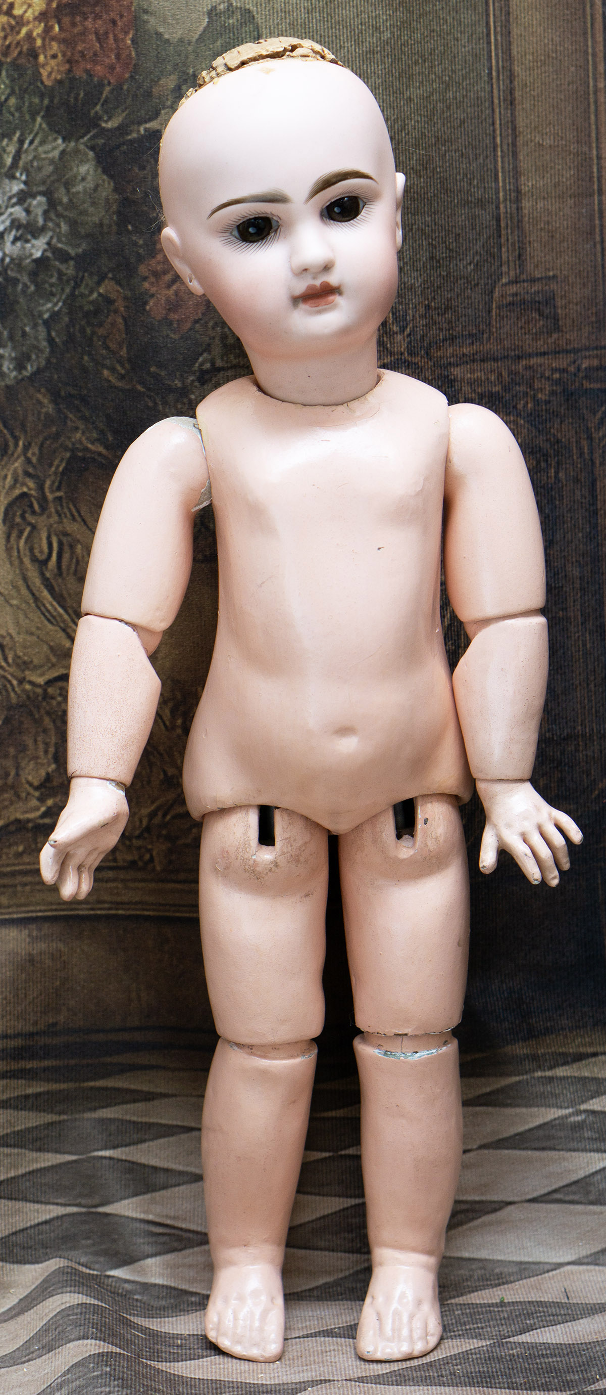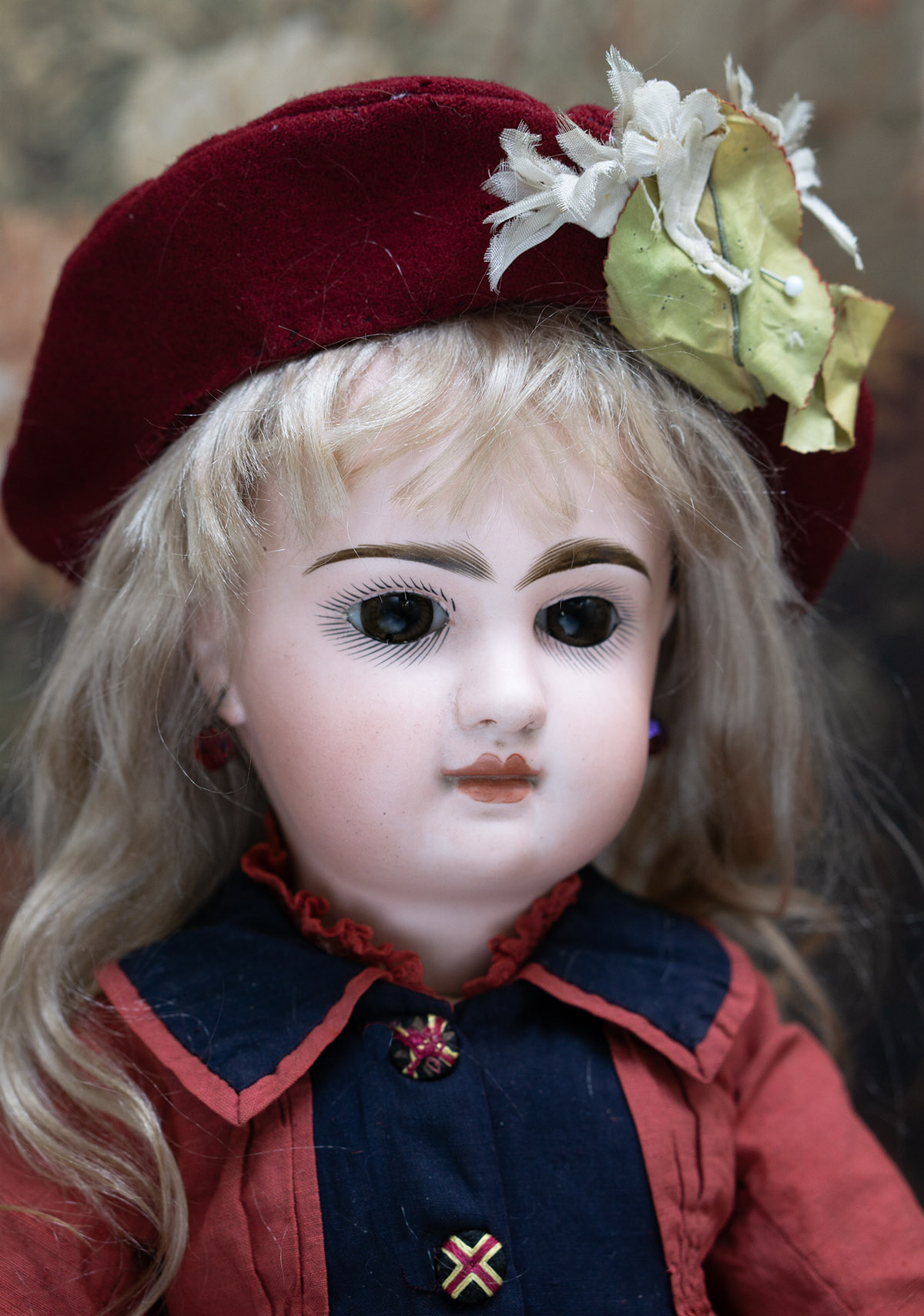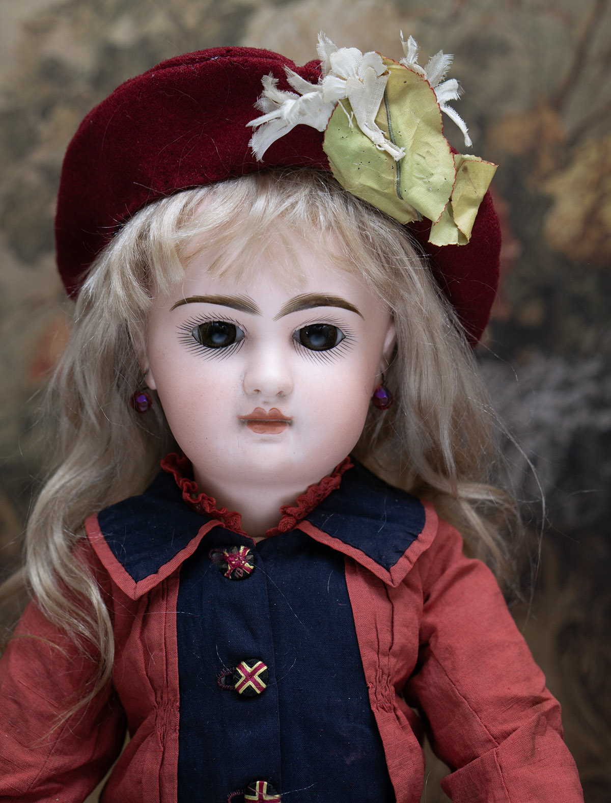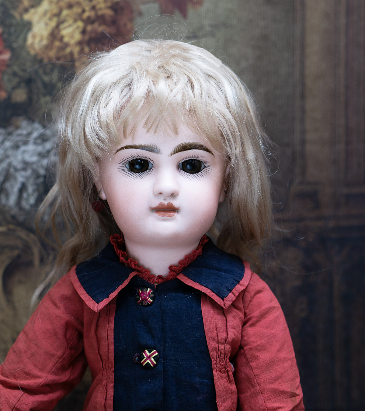 Bisque socket head with unusual plump cheeks, small brown glass paperweight inset eyes with luminous depth, dark painted lashes and eyeliner, brush-stroked and multi-feathered brows, accented nostrils and eye corners, closed mouth with defined space between the shaded and outlined lips, pierced ears, dimpled chin, blonde mohair wig over cork pate, French composition and wooden fully jointed body.