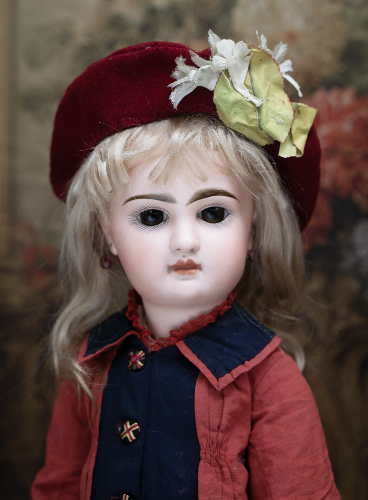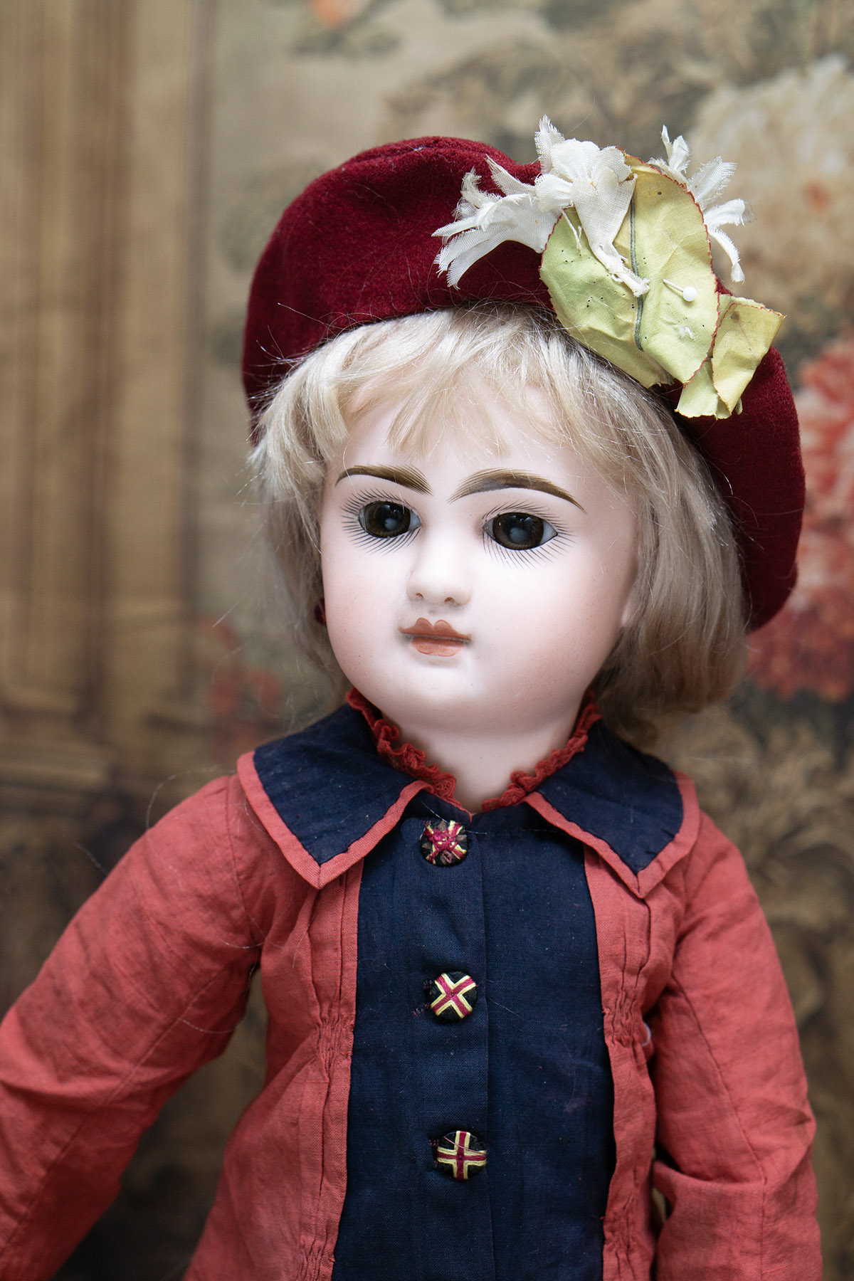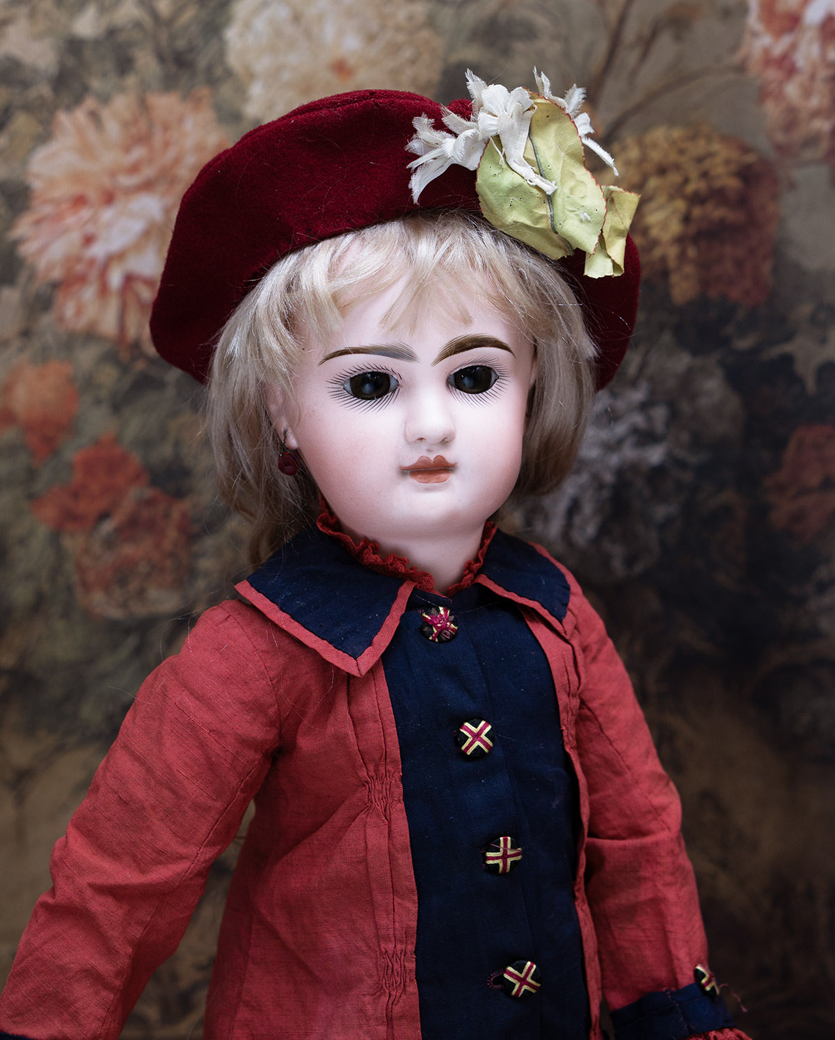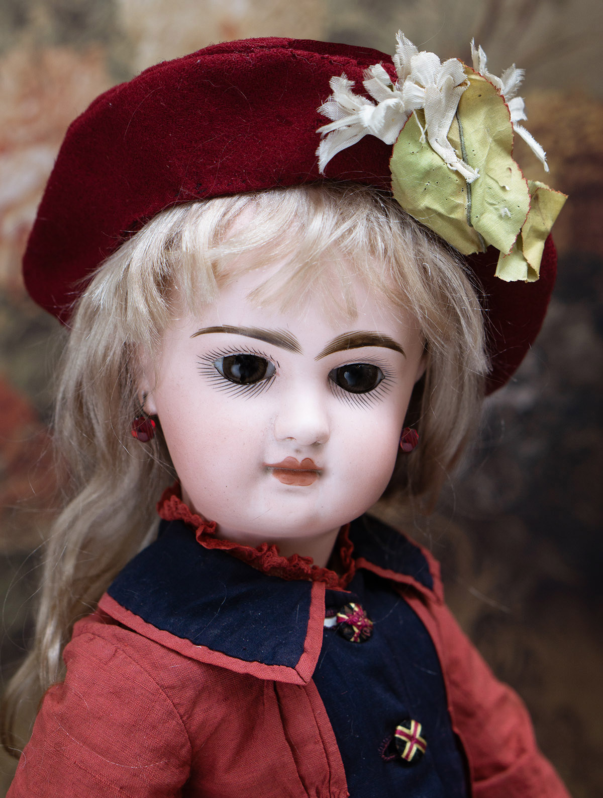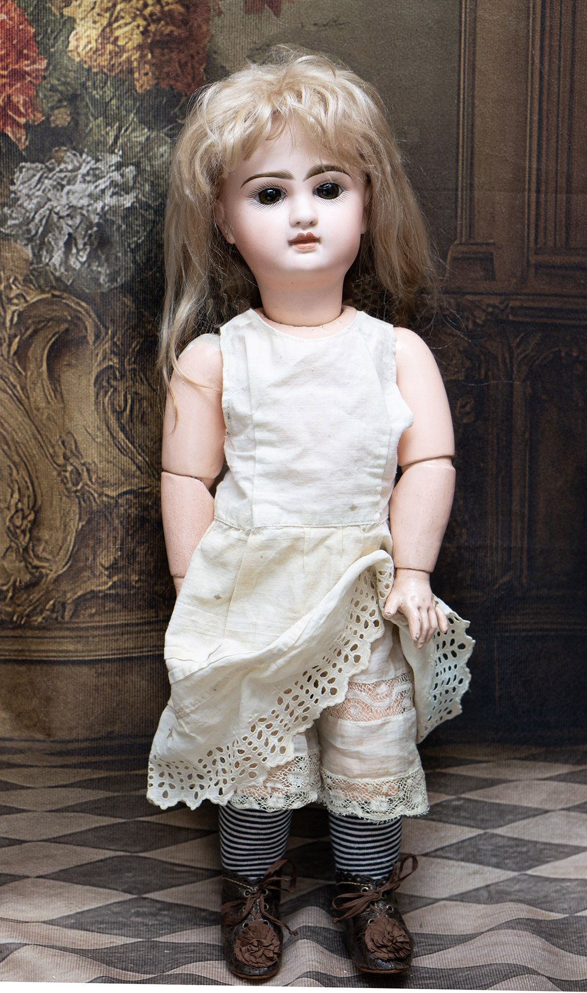 Bisque socket head with unusual plump cheeks, small brown glass paperweight inset eyes with luminous depth, dark painted lashes and eyeliner, brush-stroked and multi-feathered brows, accented nostrils and eye corners, closed mouth with defined space between the shaded and outlined lips, pierced ears, dimpled chin, blonde mohair wig over cork pate, French composition and wooden fully jointed body.