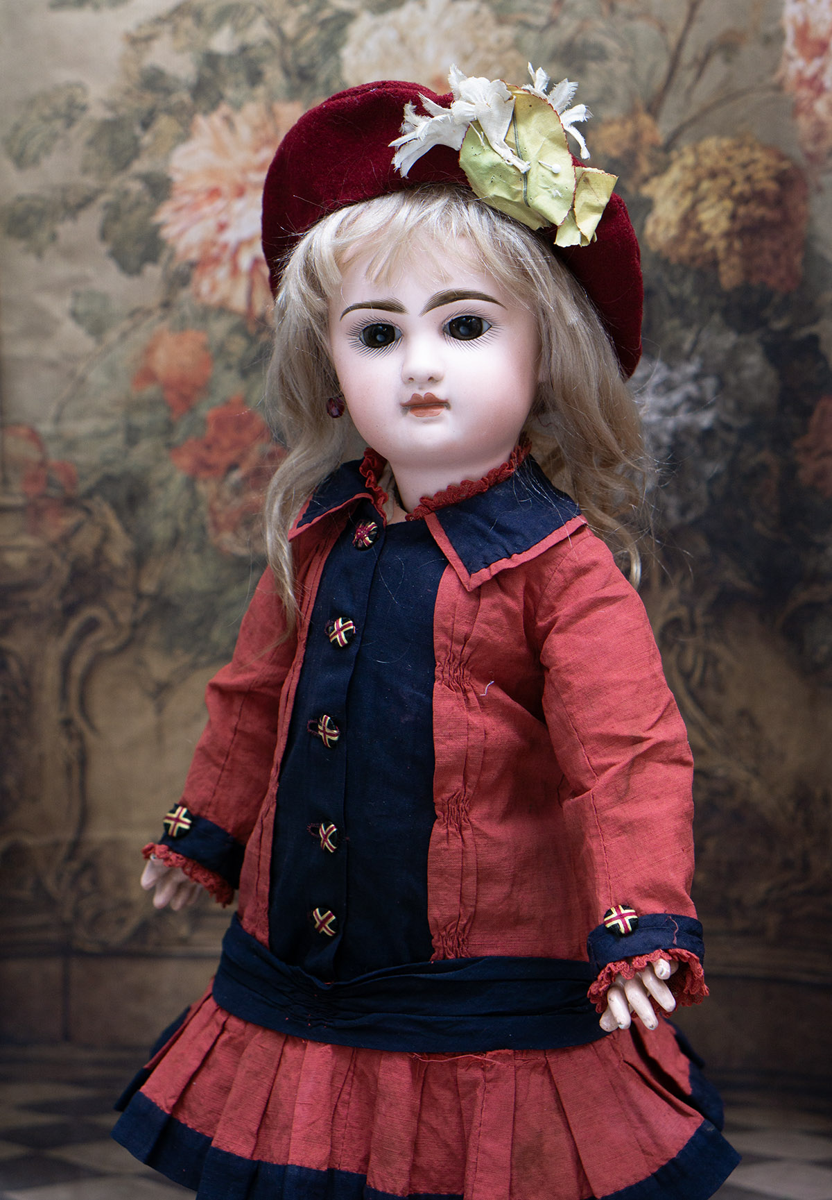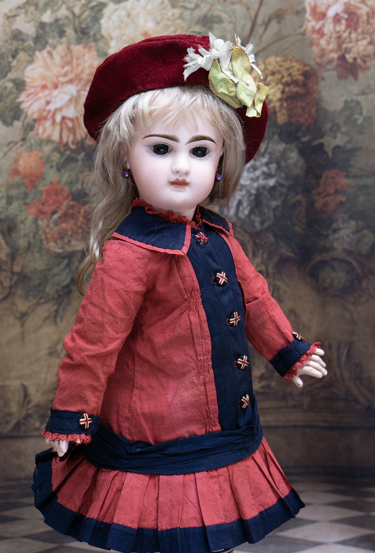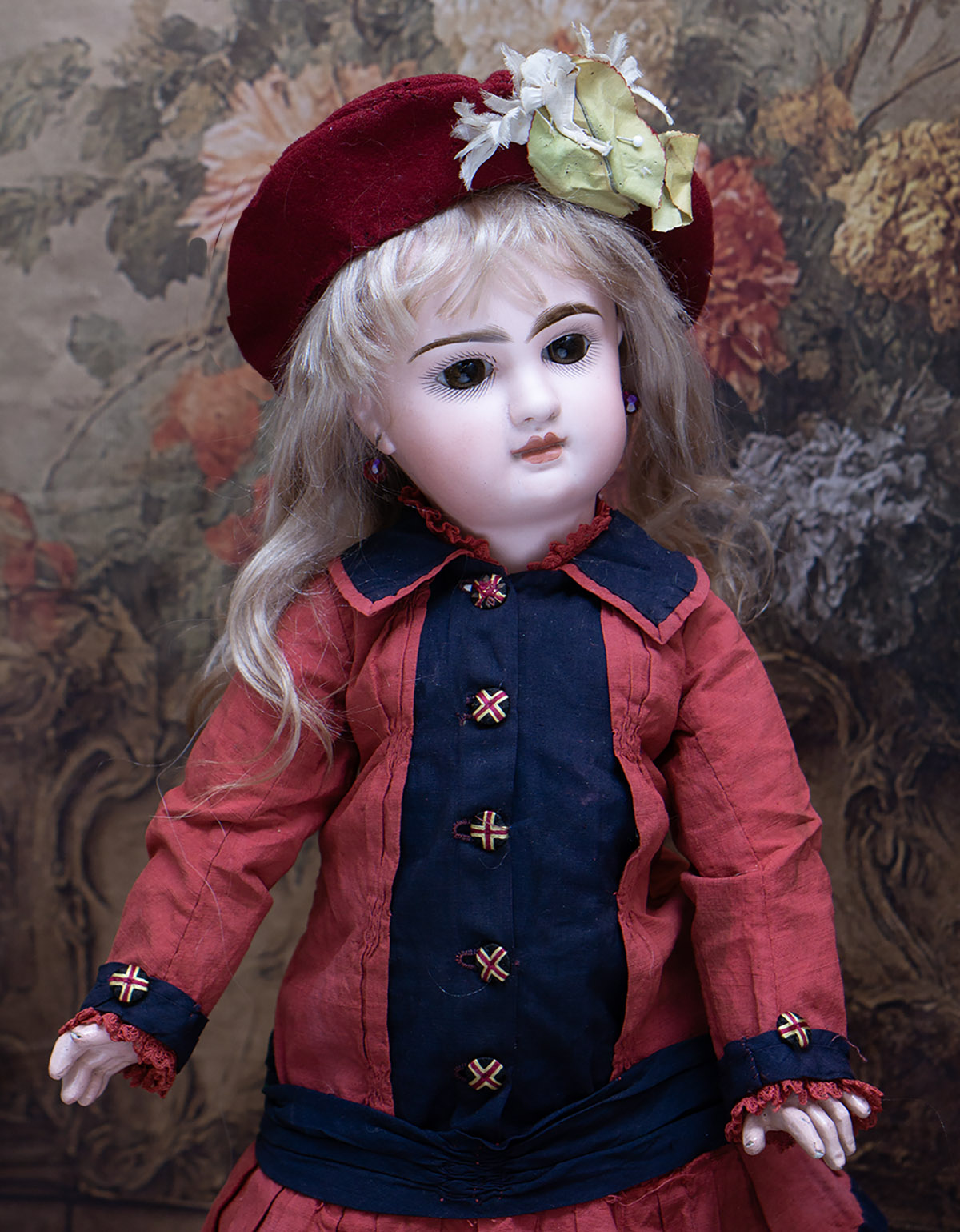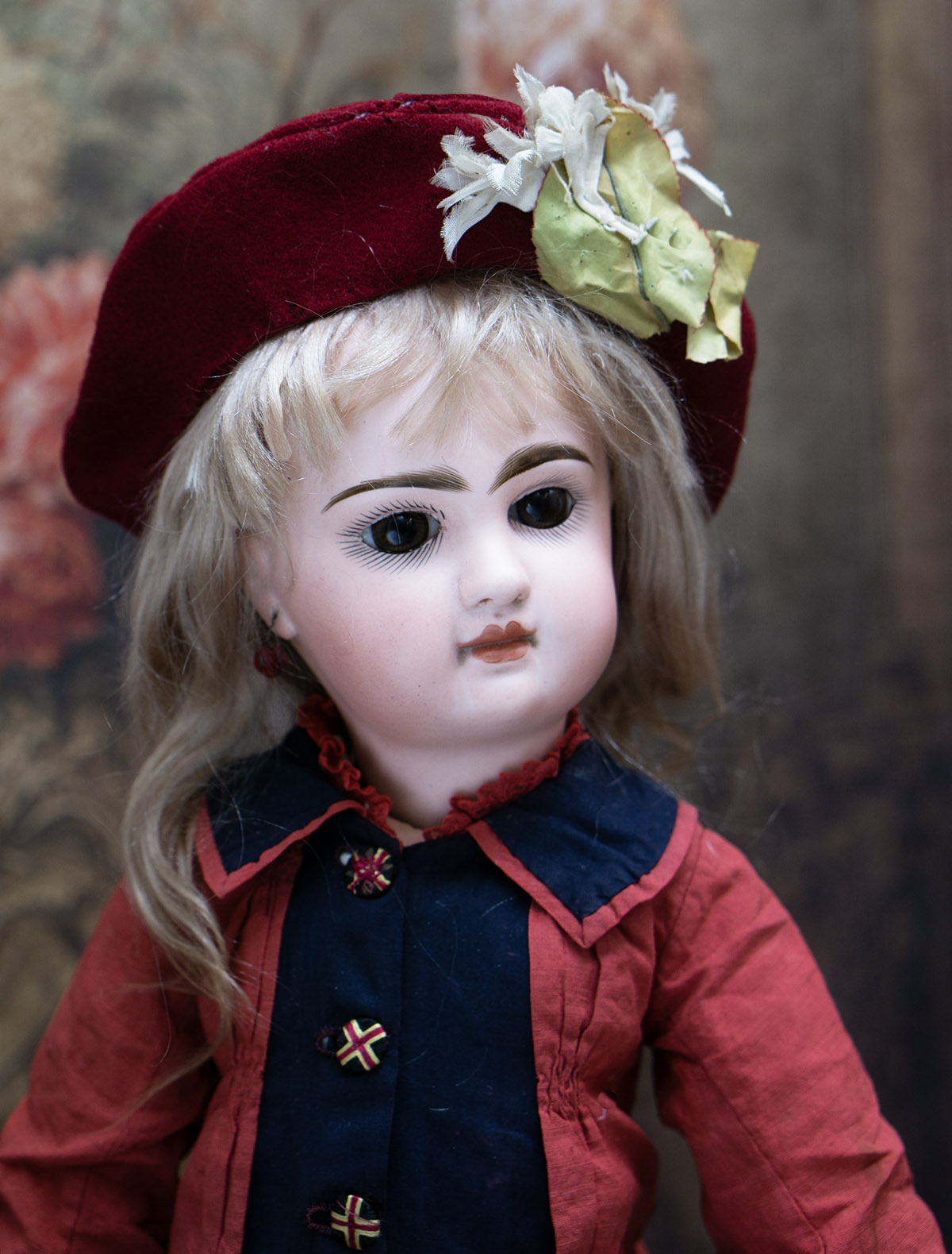 Bisque socket head with unusual plump cheeks, small brown glass paperweight inset eyes with luminous depth, dark painted lashes and eyeliner, brush-stroked and multi-feathered brows, accented nostrils and eye corners, closed mouth with defined space between the shaded and outlined lips, pierced ears, dimpled chin, blonde mohair wig over cork pate, French composition and wooden fully jointed body.