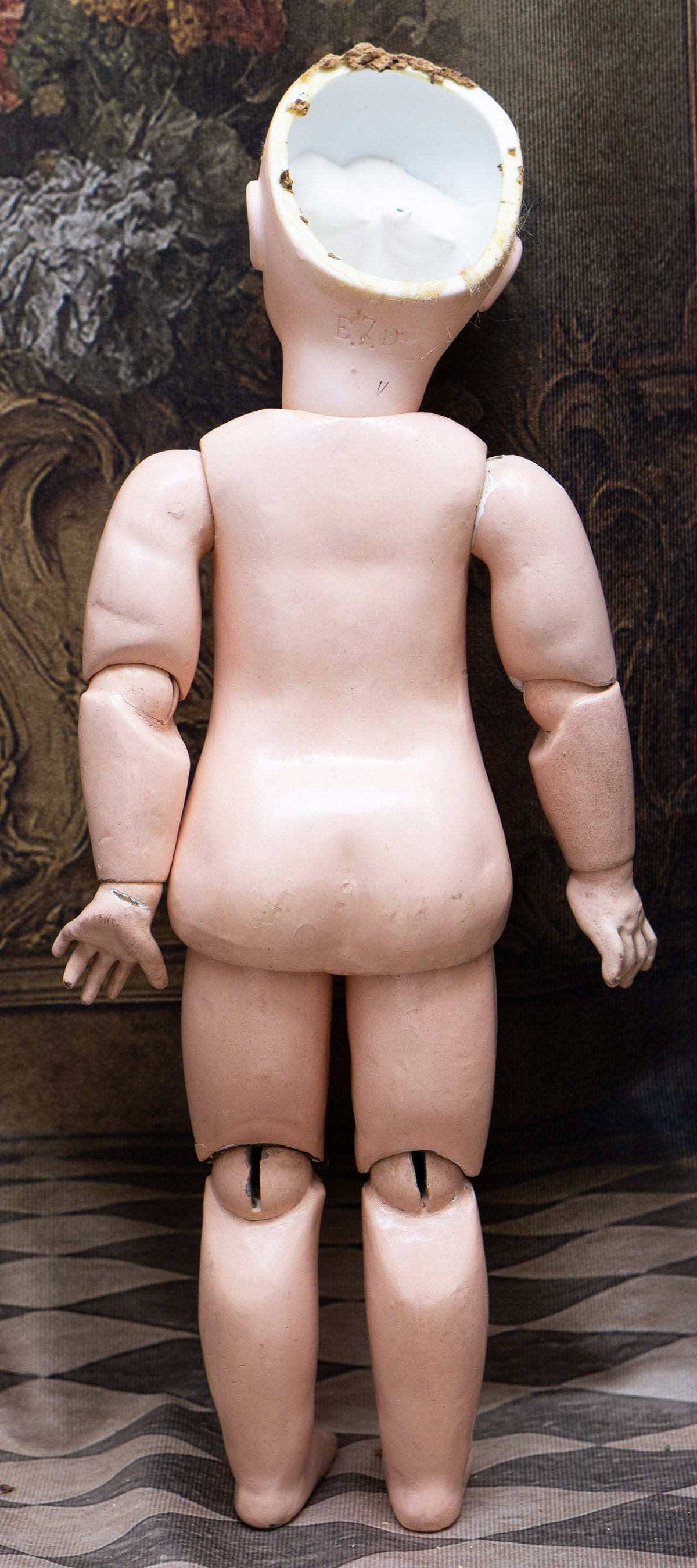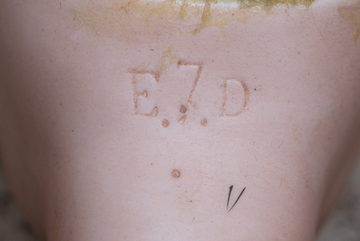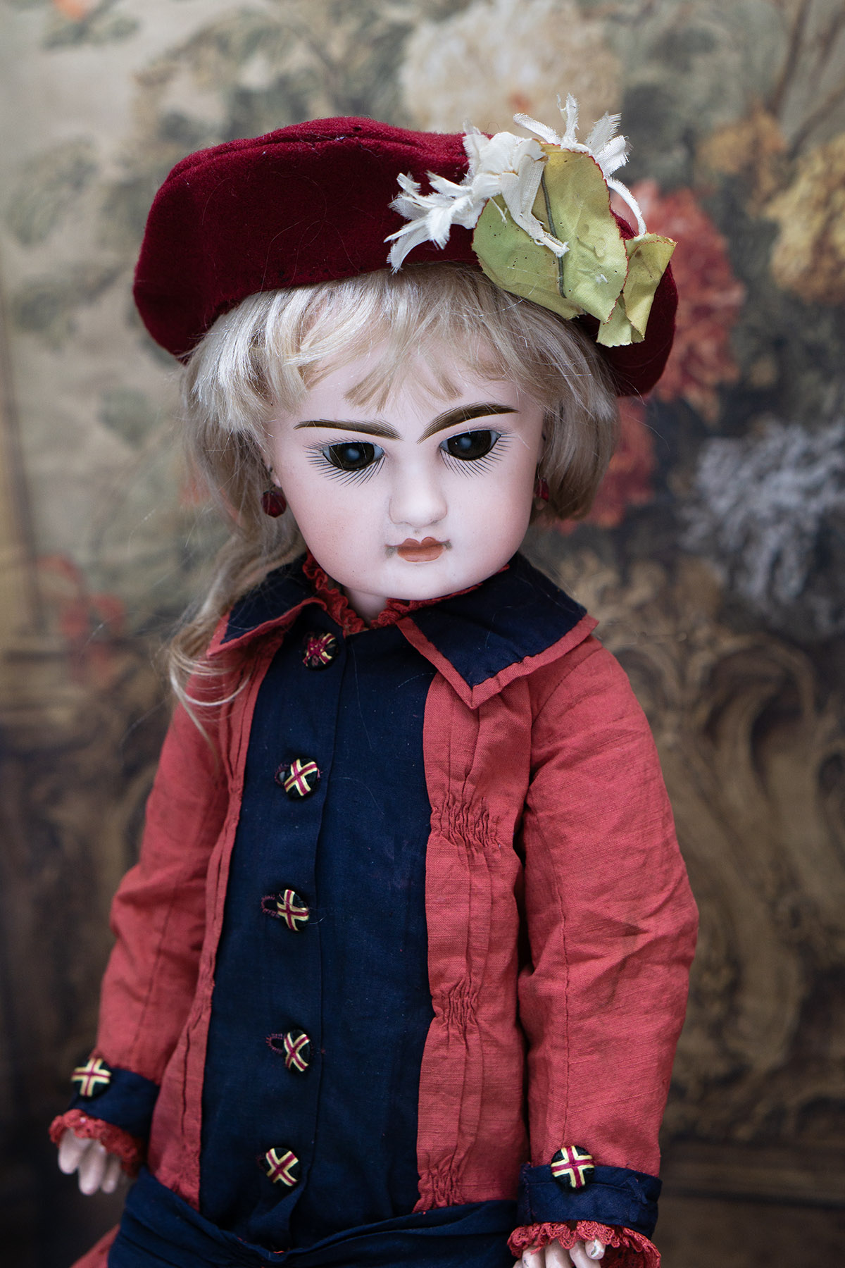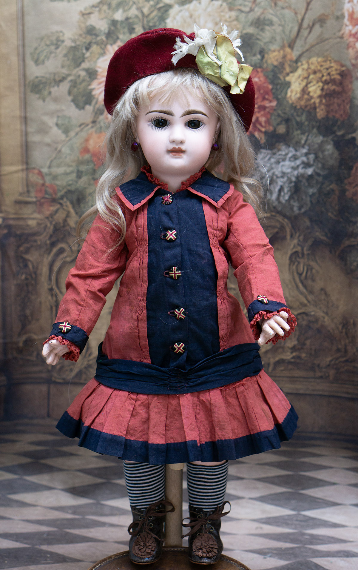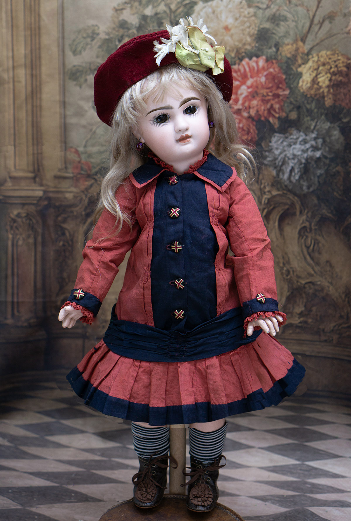 Bisque socket head with unusual plump cheeks, small brown glass paperweight inset eyes with luminous depth, dark painted lashes and eyeliner, brush-stroked and multi-feathered brows, accented nostrils and eye corners, closed mouth with defined space between the shaded and outlined lips, pierced ears, dimpled chin, blonde mohair wig over cork pate, French composition and wooden fully jointed body.